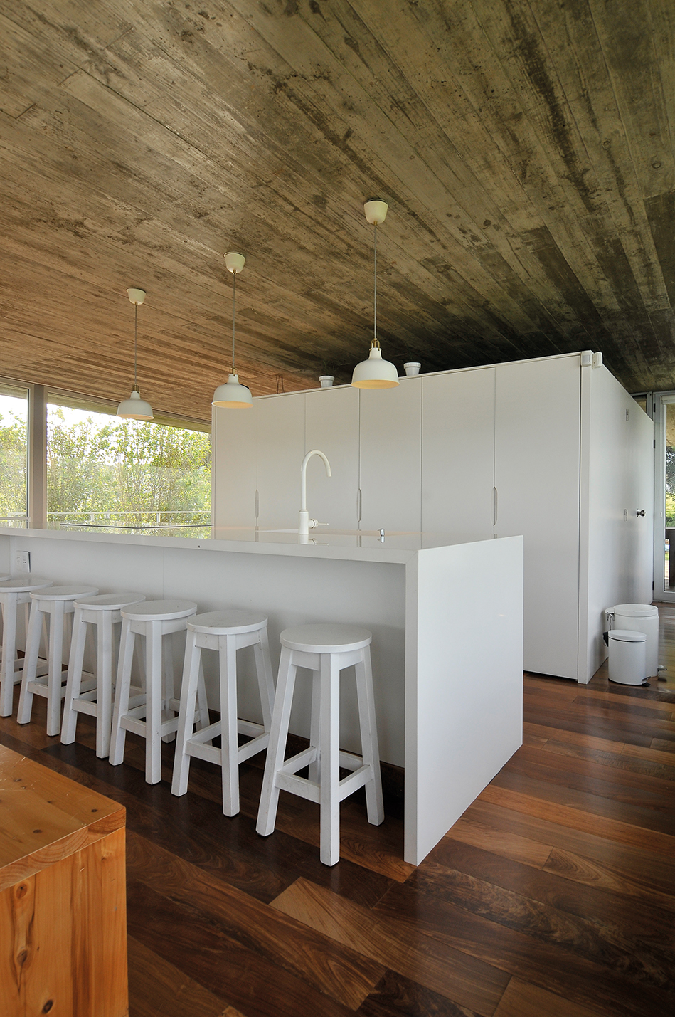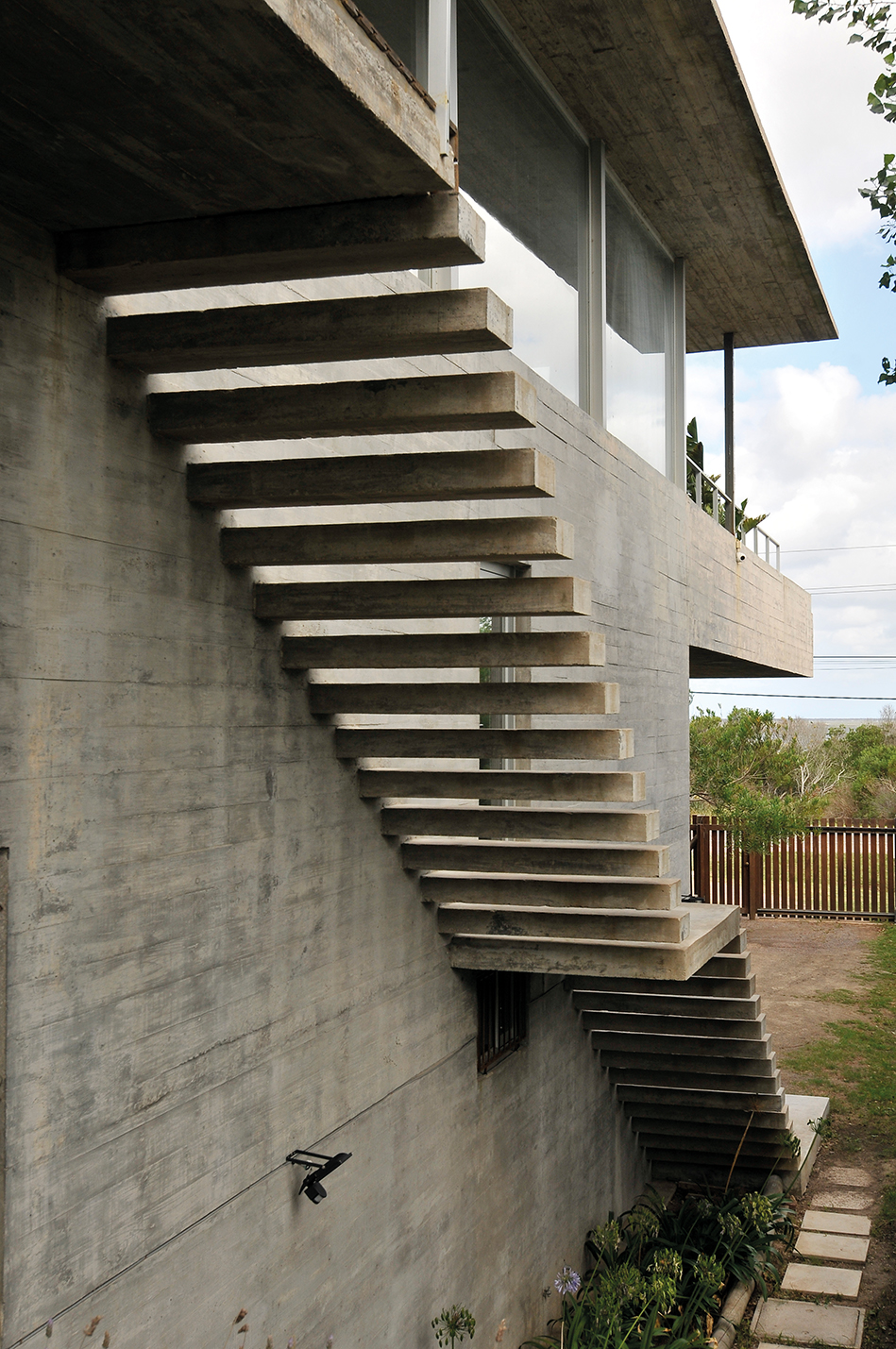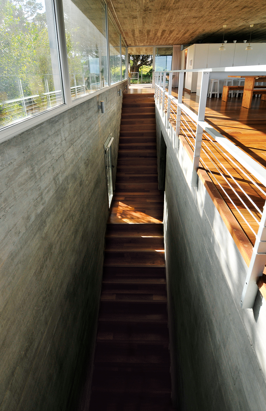 El acceso a la casa, que no tiene fachada a nivel de tierra, se limita a una puerta que nos permite optar por ingresar al gran salón destinado a estudio o emprender la cuesta que facilita una escalera construida con tablones de madera adosados a la estructura, solo por uno de sus lados. El lado escogido es el que se apoya en el muro lateral exterior. Cada tablón genera una línea que se continúa del lado exterior en una escalera gemela construida en hormigón. El acceso al segundo nivel es un hall a mitad de camino que nos conduce hacia los tres dormitorios en suite. El final de la escalera está en el tercer nivel y enfrentamos una planta libre a la que accedemos por su parte posterior. Allí encontramos una caja de madera que contiene el área de servicio y despensa de la cocina, que se abre mediante un mostrador hacia el gran ambiente limpio en el que funcionan el comedor y el estar. Los ventanales laterales y frontales convierten al espacio en una gran pecera donde la luz natural, a toda hora del día, reina. La gran terraza que ocupa la fachada principal se integra a este espacio, ya que los ventanales que delimitan área corren sobre rieles y se abren casi en su totalidad. En esta terraza, que vuela sobre la playa que enfrenta, la piscina de borde infinito corona una situación ideal.