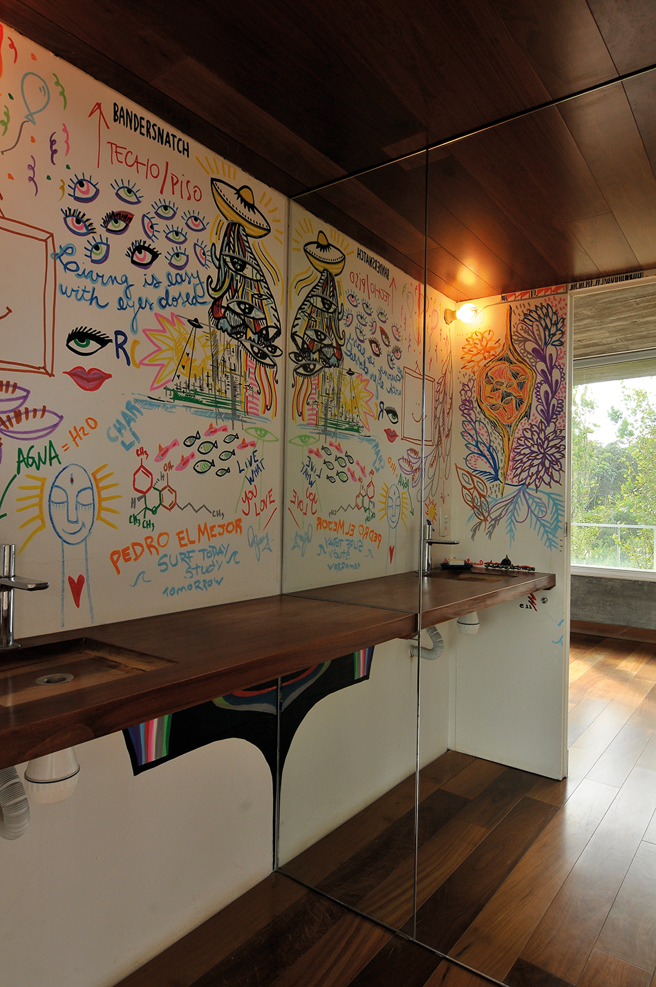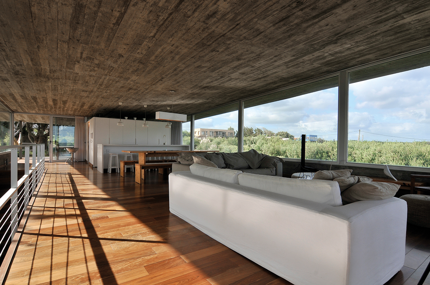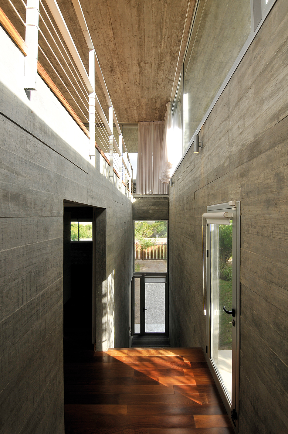 El acceso a la casa, que no tiene fachada a nivel de tierra, se limita a una puerta que nos permite optar por ingresar al gran salón destinado a estudio o emprender la cuesta que facilita una escalera construida con tablones de madera adosados a la estructura, solo por uno de sus lados. El lado escogido es el que se apoya en el muro lateral exterior. Cada tablón genera una línea que se continúa del lado exterior en una escalera gemela construida en hormigón. El acceso al segundo nivel es un hall a mitad de camino que nos conduce hacia los tres dormitorios en suite. El final de la escalera está en el tercer nivel y enfrentamos una planta libre a la que accedemos por su parte posterior. Allí encontramos una caja de madera que contiene el área de servicio y despensa de la cocina, que se abre mediante un mostrador hacia el gran ambiente limpio en el que funcionan el comedor y el estar. Los ventanales laterales y frontales convierten al espacio en una gran pecera donde la luz natural, a toda hora del día, reina. La gran terraza que ocupa la fachada principal se integra a este espacio, ya que los ventanales que delimitan área corren sobre rieles y se abren casi en su totalidad. En esta terraza, que vuela sobre la playa que enfrenta, la piscina de borde infinito corona una situación ideal.