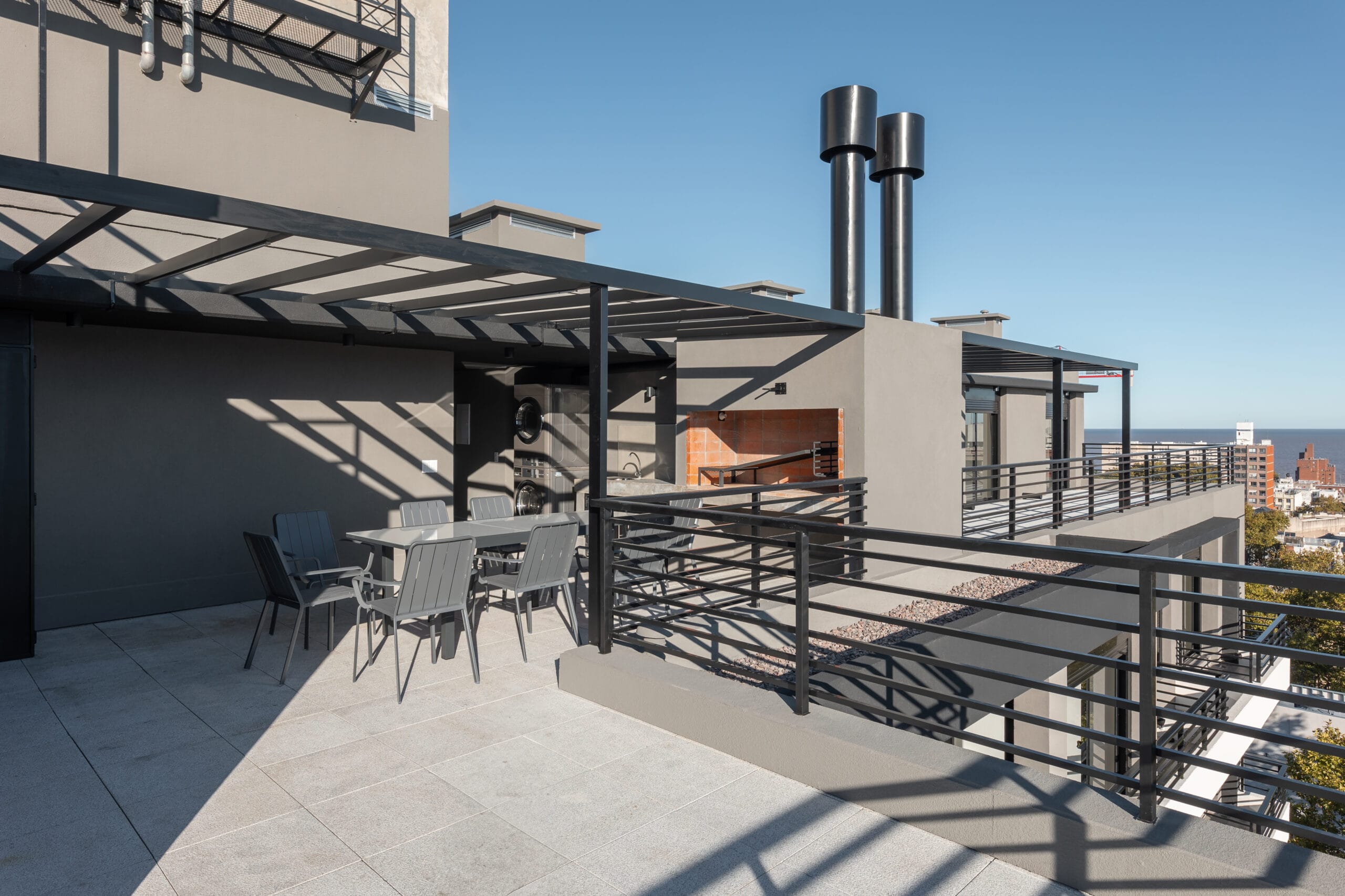 La revitalización de las zonas centrales de la ciudad de Montevideo encuentra rápidas respuestas en los ejercicios de buen diseño que se vienen desplegando en los últimos años. Es el caso de los aportes que el Estudio Flores Gallinal concreta con sus intervenciones. ¡Ubicado en la zona de Cordón Sur se implanta en un terreno esquina de generosas proporciones Edificio Flip! Se presenta como un gran bloque que se apodera de la trama a través del gesto arquitectónico – impronta de los proyectistas- que entrega vitalidad a la zona y acompasa con un estilo armónico en la silueta de la estructura que entrega contemporaneidad al barrio citadino. El proyecto obtiene el máximo partido a su ubicación y se abre hacia ambos frentes para aprovechar el sol y así lograr mayor confort y ahorro energético. El edificio se levanta diez pisos con gestos arquitectónicos contemporáneos que maximiza las vistas abiertas y convive armónicamente con su entorno. El volumen contiene cincuenta y dos apartamentos concebidos con excelentes terminaciones. Los proyectistas lograron espacios flexibles que se relacionan con el estilo de vida de quienes deseen habitar los apartamentos, con grandes ventanales que ofrecen la mayor cantidad de luz y ventilación natural y terrazas que aumentan la sensación de amplitud y hacen que el espacio fluya hacia el exterior. Los apartamentos se complementan con el parrillero parcialmente techado ubicado en el piso diez.