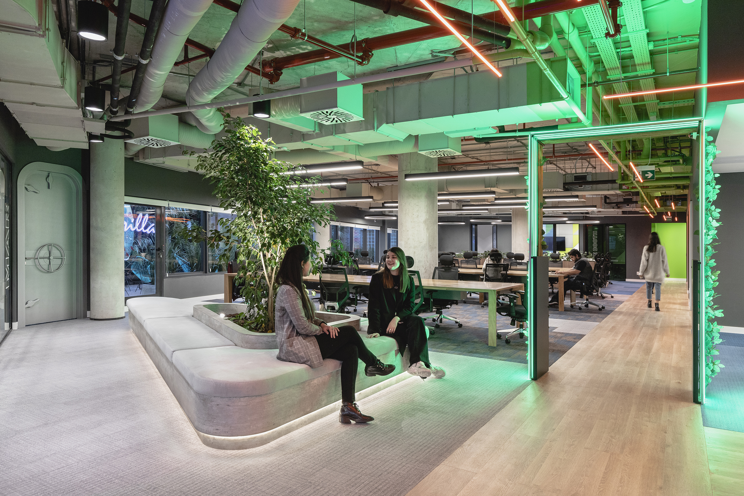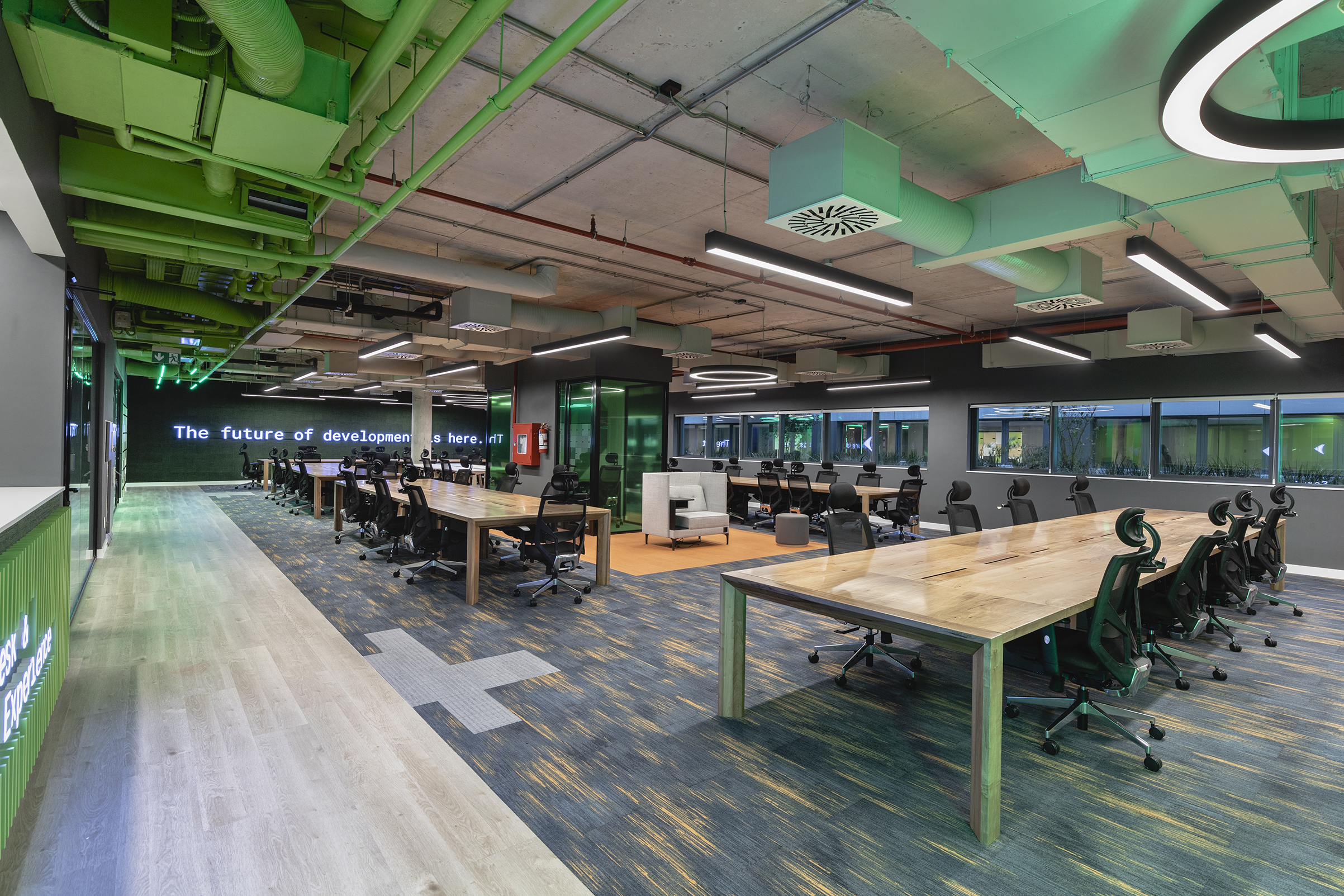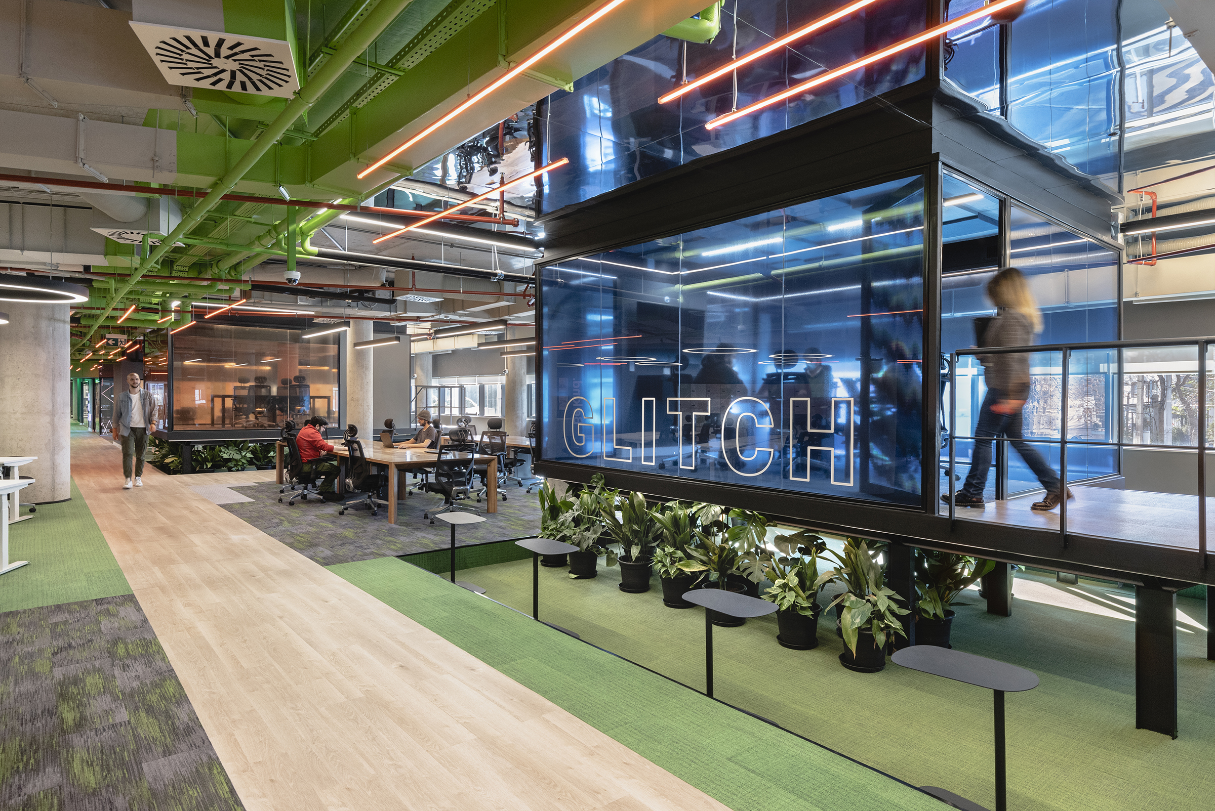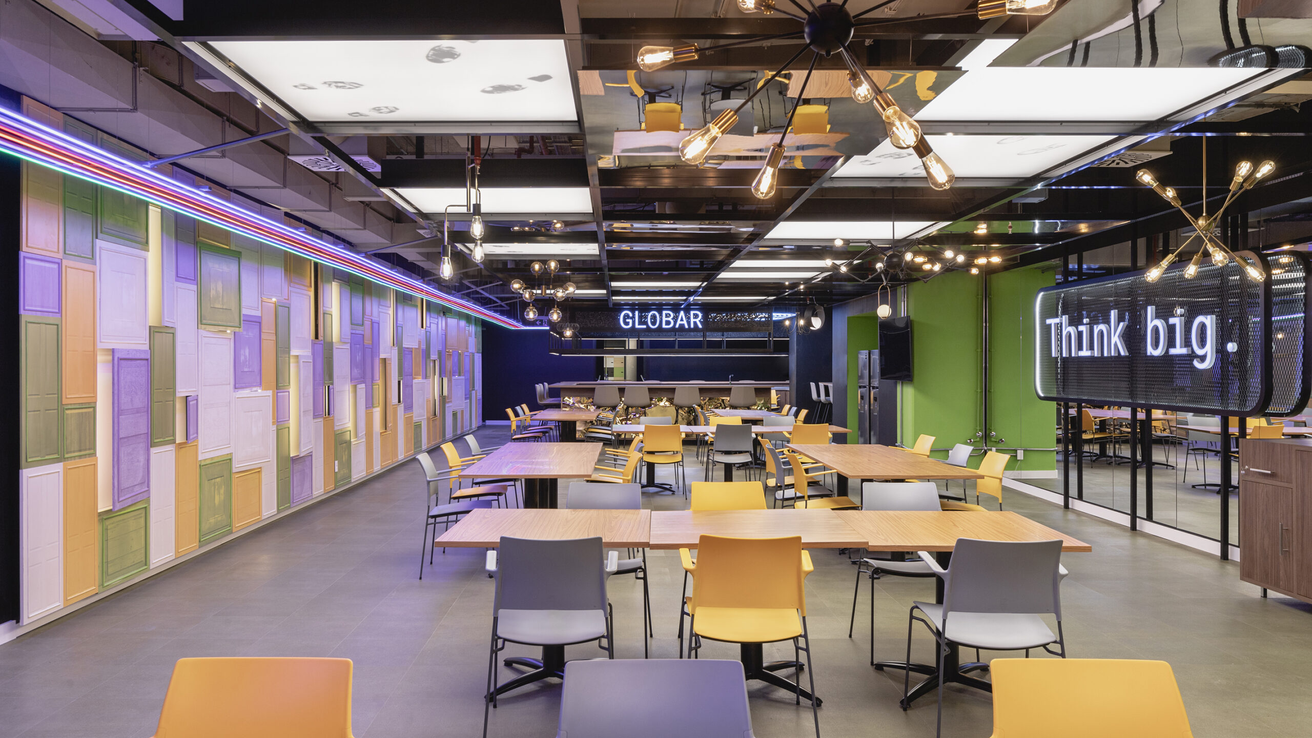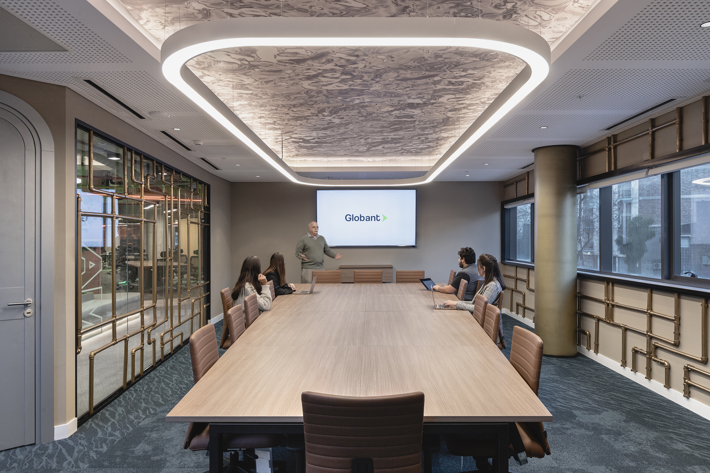 Oficinas Globant propone, desde su diseño, una mirada distinta y muy particular para el uso de sus instalaciones en el rubro. Un proyecto bastante atípico en Uruguay, no solo desde el concepto, sino también desde el diseño. Con amplios espacios de trabajo y 400m2 de esparcimiento, con la idea de lograr desarrollar creatividad en los trabajadores. Allí, sus trabajadores pasan gran parte de su día, dan vida y propósito a las instalaciones. Aquí radica la importancia de crear espacios donde no exista la monotonía y entonces las ganas de trabajar sean permanentes ya que, teniendo en cuenta estos aspectos, se logra un sitio donde los vínculos se estimulan y buscan la innovación, tanto personal como laboral de quienes asisten y dan vida a las oficinas. Para este proyecto, se trabajó con un modelo arquitectónico colombiano, lo cual supuso todo un reto para los distintos profesionales locales, dado que había que mantener el lenguaje propuesto y adaptarlo a las distintas posibilidades de nuestro mercado. Se lograron espacios de trabajo cómodos, versátiles y rotativos en donde no hay lugares fijos para los más de 300 trabajadores que utilizan las instalaciones.