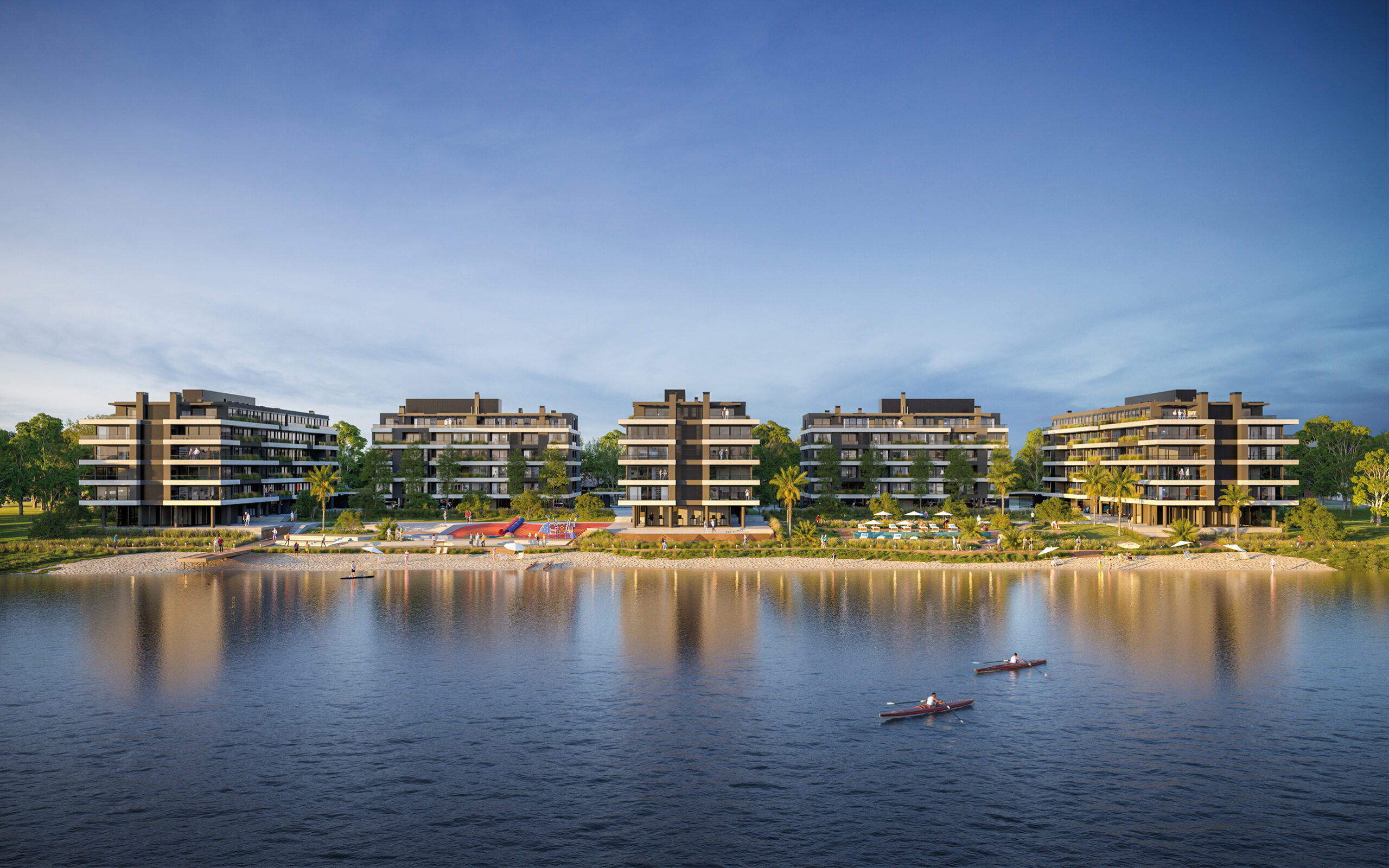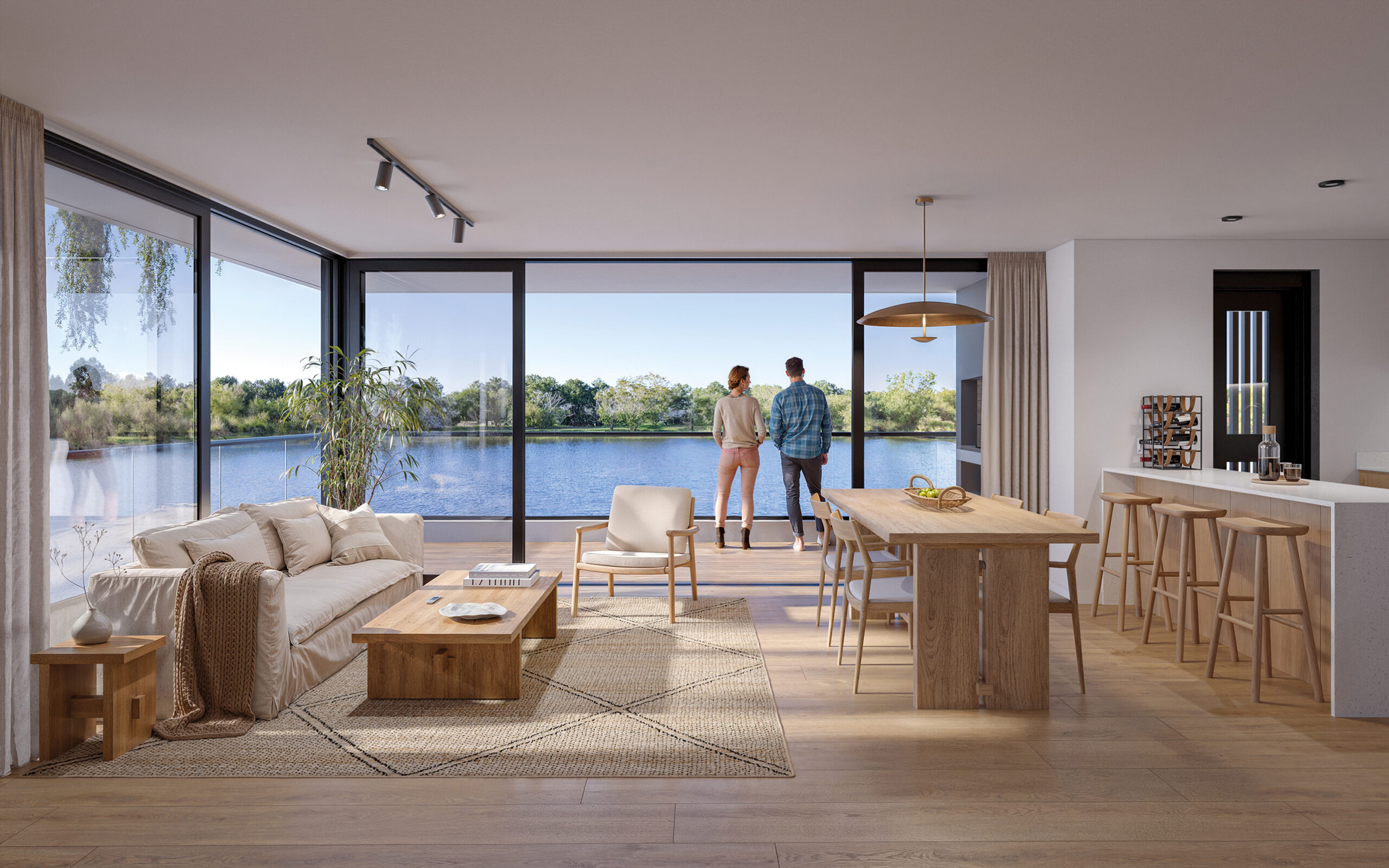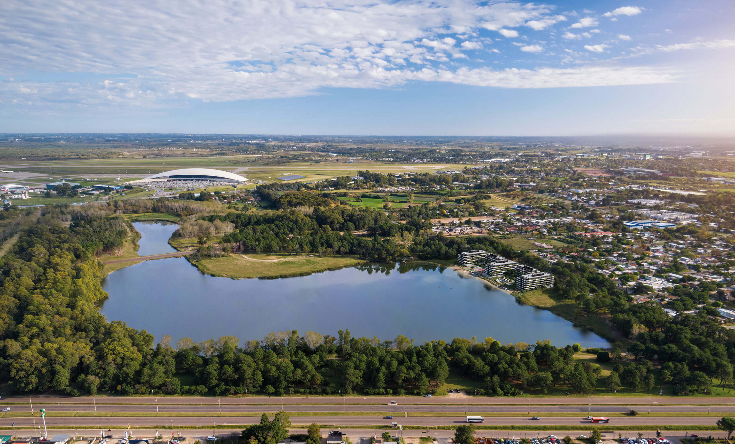 En medio de ese escenario apareció la oportunidad: Carrasco Park. Dos terrenos, y en uno de ellos un lago inmenso, inesperado, como si la geografía hubiera dejado allí un recordatorio de lo que alguna vez fue la costa: un territorio de agua, vegetación y horizontes abiertos. Aerosur lo llaman, una gran manzana delimitada al norte por la ruta 101 y la calle Cruz del Sur, al sur por la avenida Giannattasio y la calle Calcagno. Y en ese enclave, que es frontera y bisagra a la vez, nos propusimos levantar cinco edificios con 236 apartamentos, casi todos con vista al lago.