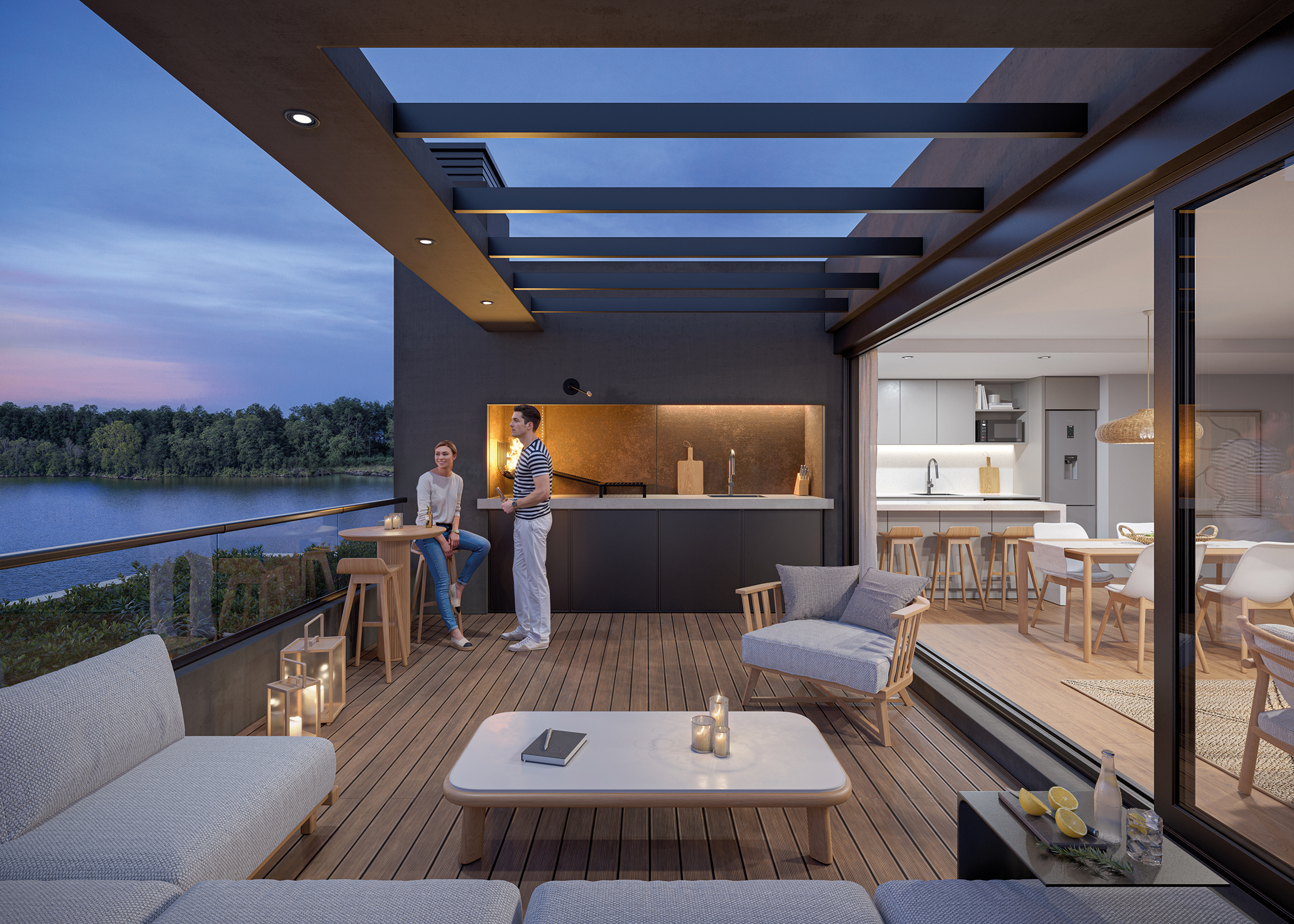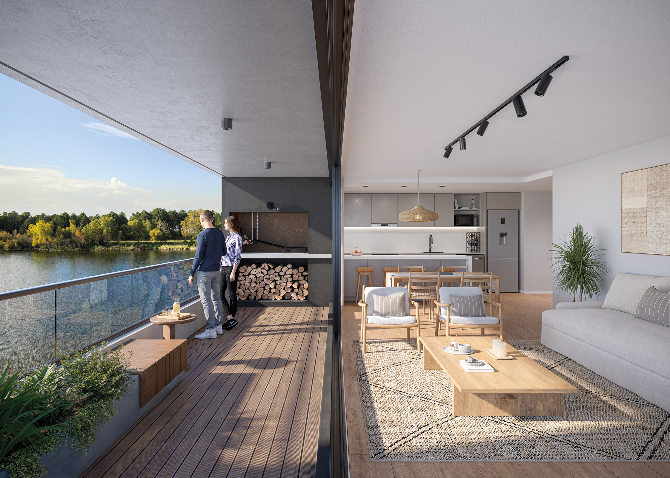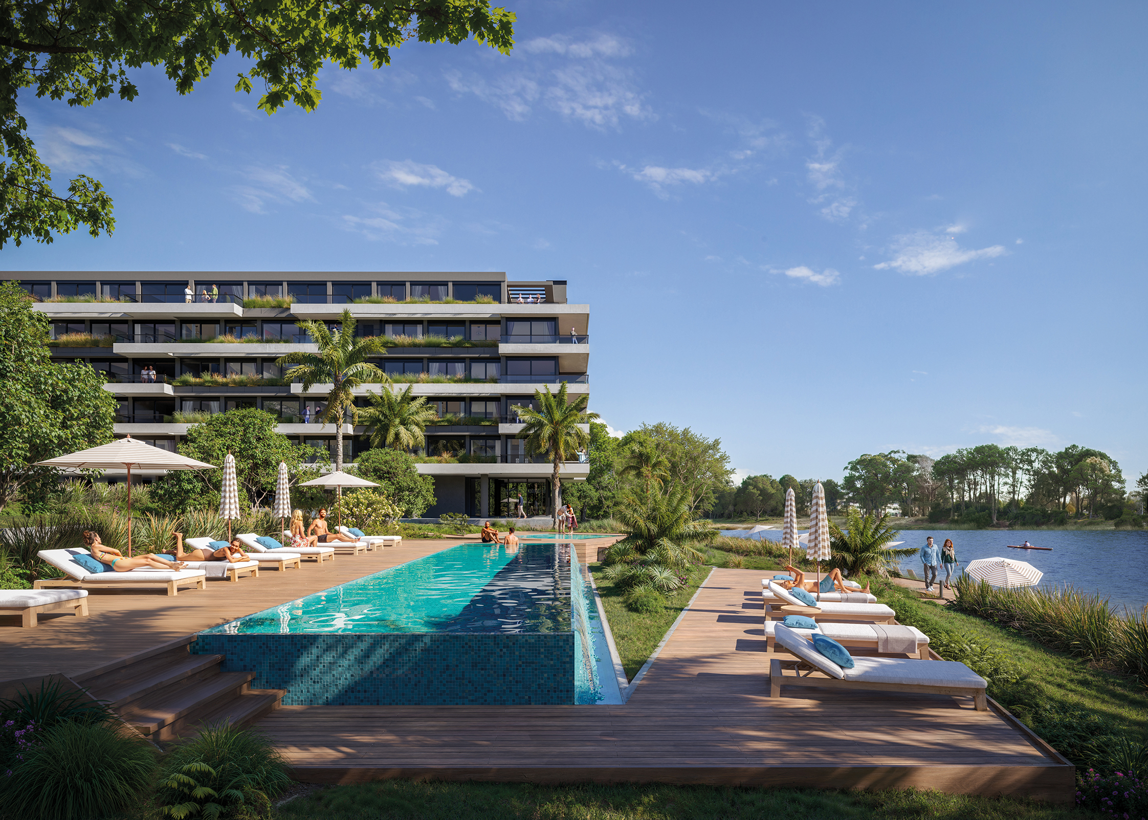 Pero no se trataba de repetir la fórmula de BE PARK LIFE. Grou Lagun debía ir más allá. Había que pensar en el bosque, en los amenities, en cómo los edificios no serían piezas aisladas sino parte de un ecosistema más amplio, tejido con la comunidad, conectado con la vida cotidiana de la Ciudad de la Costa. Era un desafío doble: superar el hito y, al mismo tiempo, contribuir a darle sentido a un territorio que creció sin él.