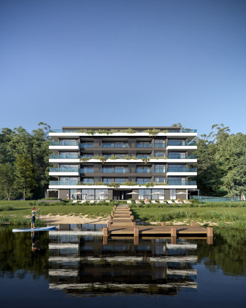 De esa geometría insólita brota la gran ventaja: cada unidad se abre inevitablemente hacia la naturaleza. No importa dónde se encuentre, la vista se desliza hacia el parque o se derrama sobre el lago; frontal o sesgada, siempre habrá un paisaje vivo esperando en la ventana. La arquitectura, entonces, no impone límites: se vuelve mediadora entre el habitante y ese mundo exterior que reclama ser contemplado en todas sus dimensiones.