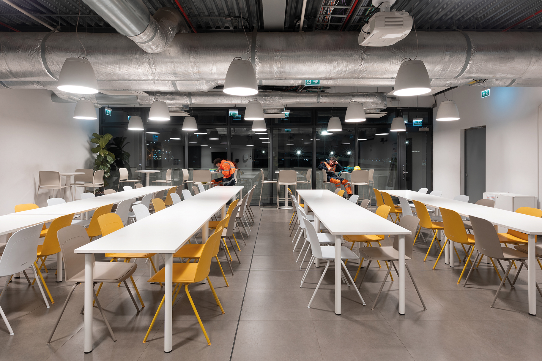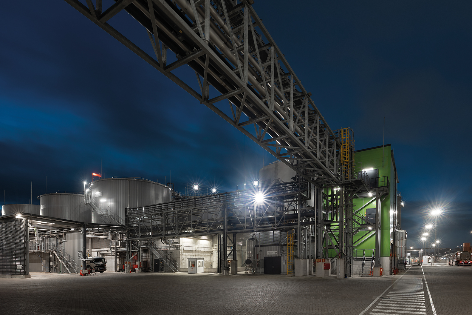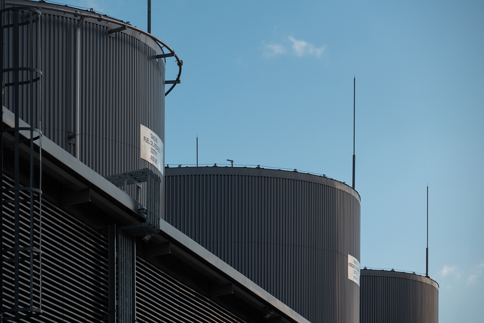 El lenguaje arquitectónico es industrial y preciso, basado en materiales metálicos como chapa, paneles, celosías y elementos técnicos —puentes de cañerías, escaleras, portones— tratados con un criterio cromático unificado que permite una lectura funcional clara de cada edificio según su uso.