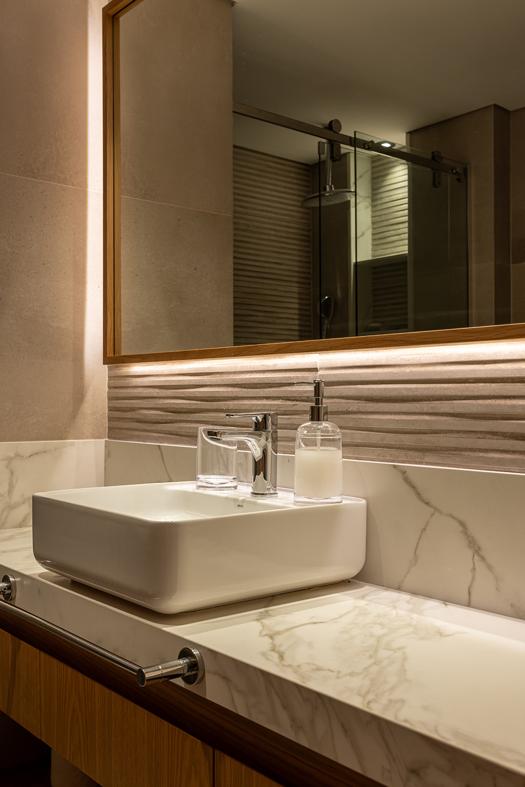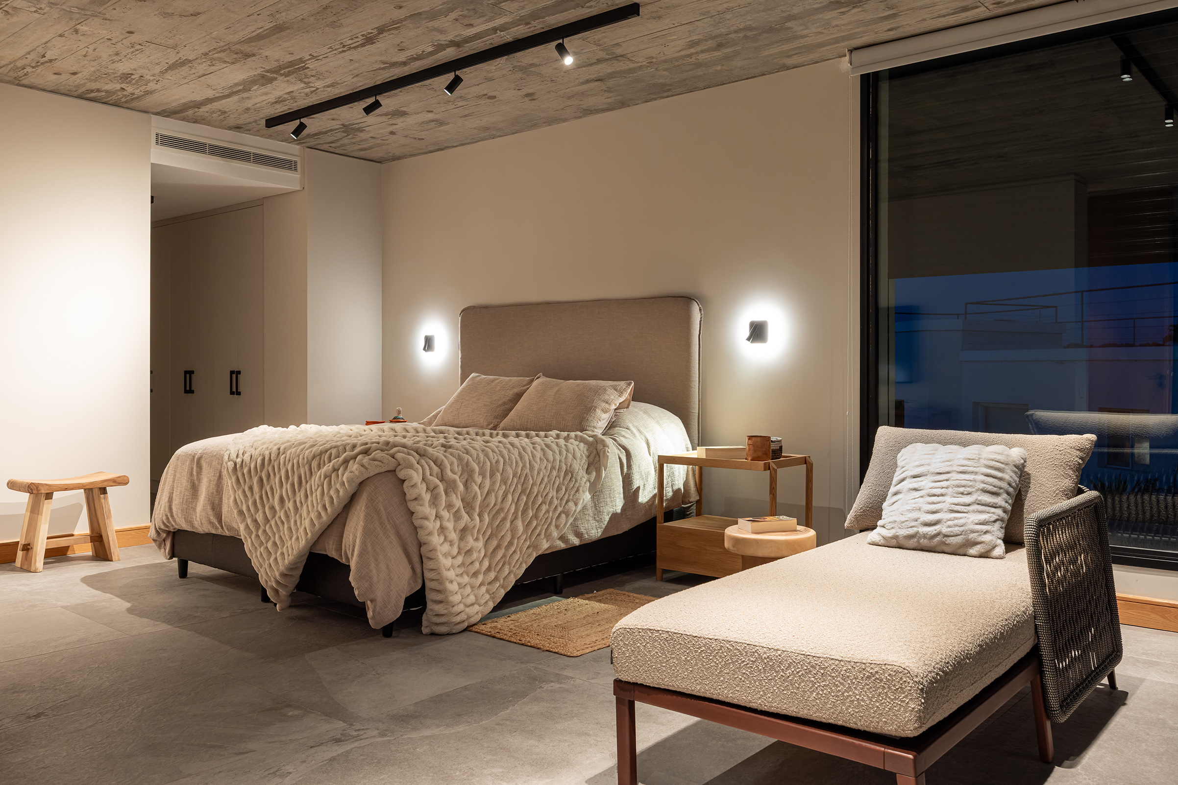 La planta alta, visible desde la playa, es la atalaya. Allí está el dormitorio principal, con vestidor y baño en suite, un pequeño living con kitchenette y la caja de escaleras que conduce a la azotea-terraza. La planta alta mira al horizonte. Desde su terraza en “L” se contemplan los atardeceres sobre el mar, el perfil lejano de Punta Ballena, los movimientos del viento sobre la vegetación costera.