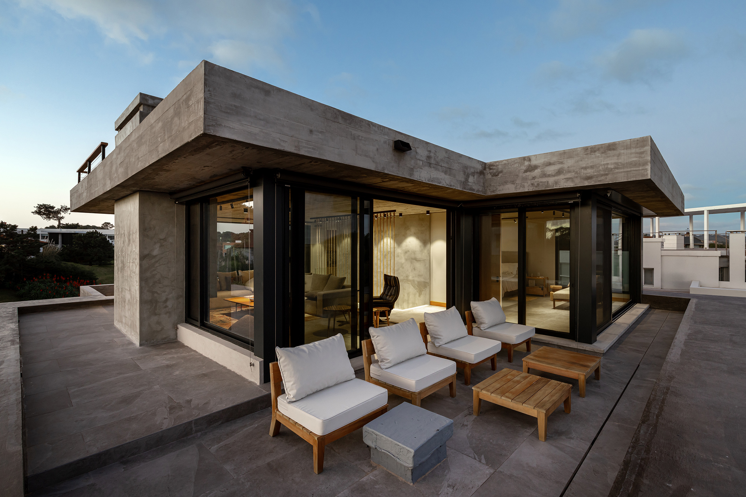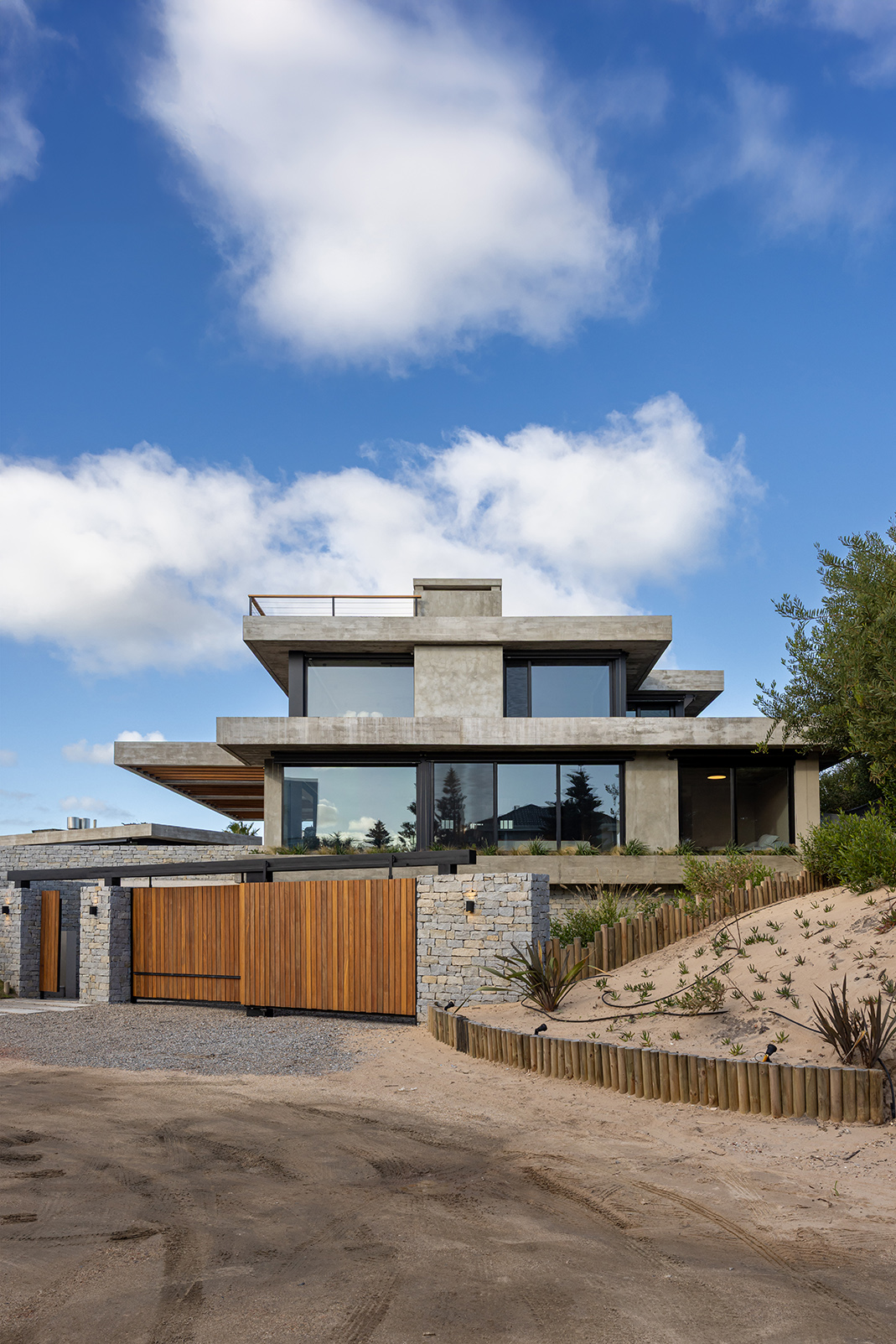 La casa no se impone: se apoya. Tres bandejas de hormigón, superpuestas con sobriedad geométrica, separadas por fajas vidriadas, conforman un volumen que más que edificar, parece haber sido sedimentado por el viento y el tiempo. Una arquitectura contenida, escalonada, que se aparta con discreción de la esquina y que al verla desde la playa, apenas deja asomar su nivel superior por sobre la duna. Como si supiera que en ese paisaje la arrogancia no tiene lugar.