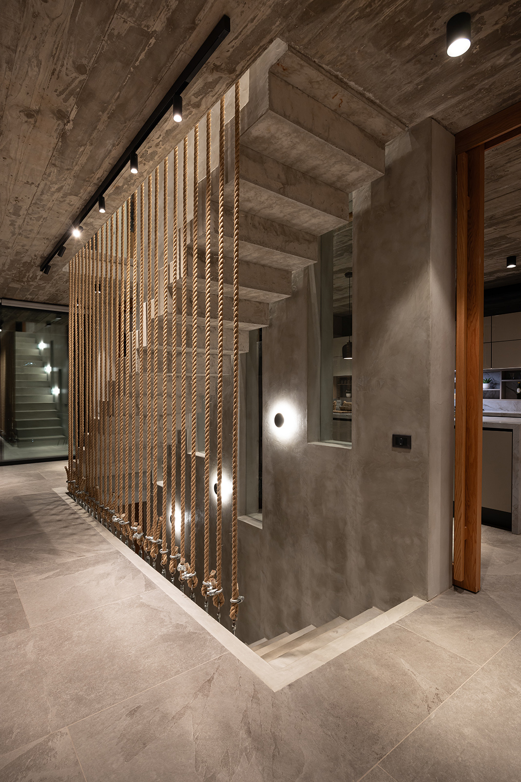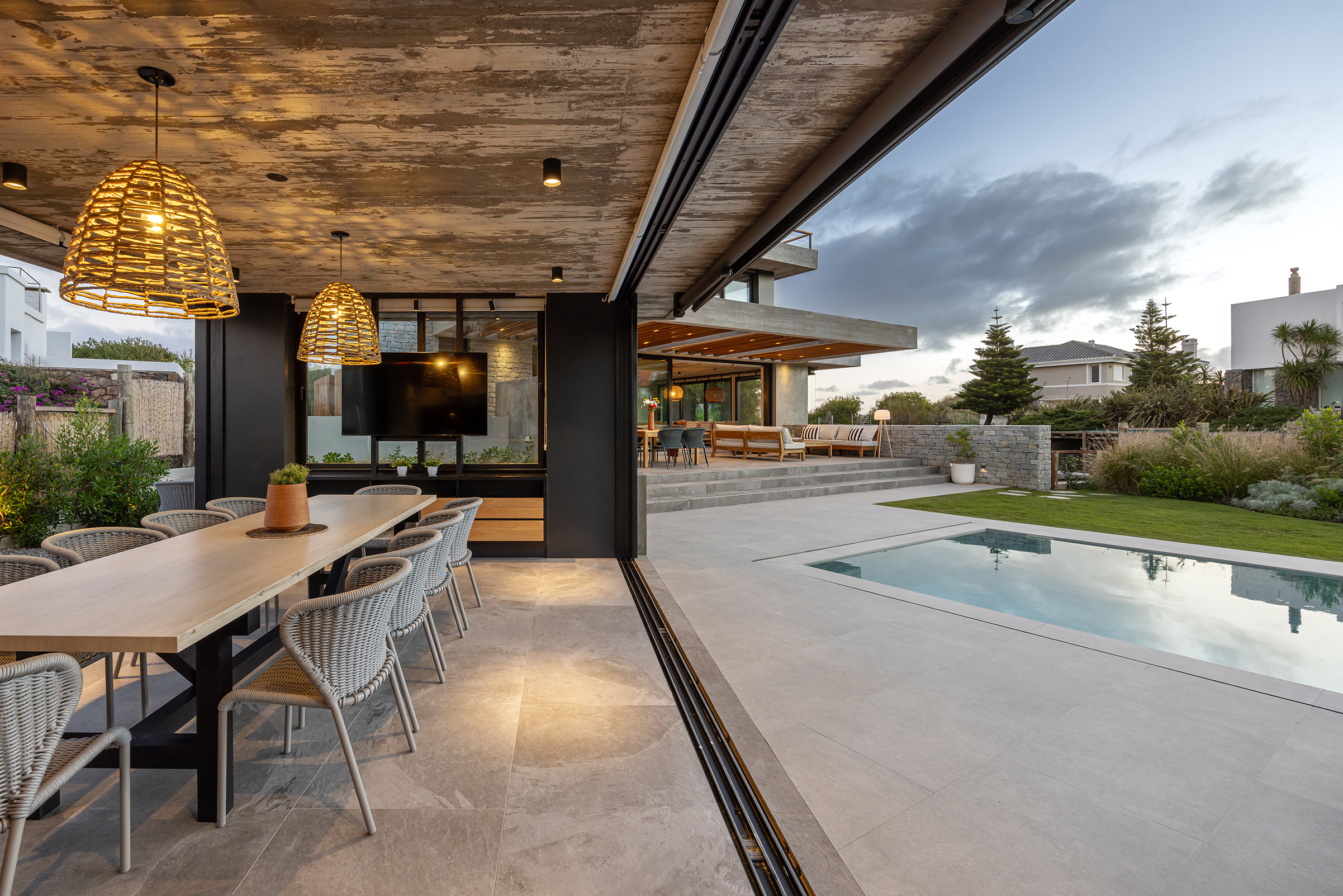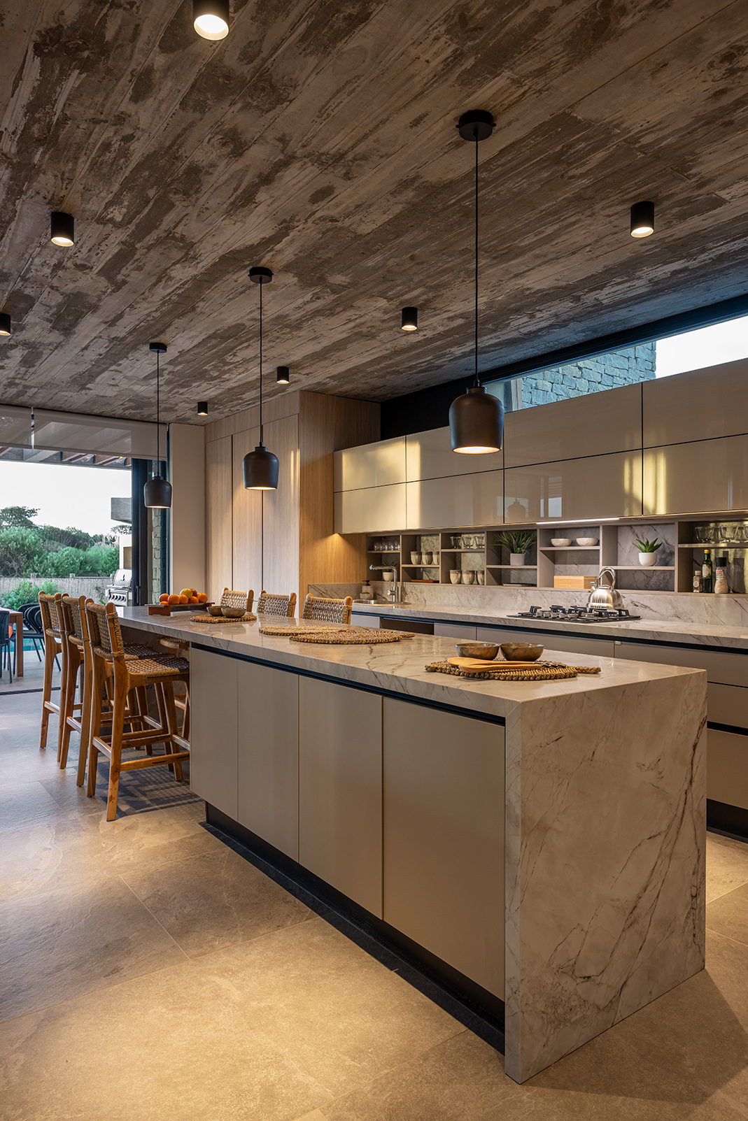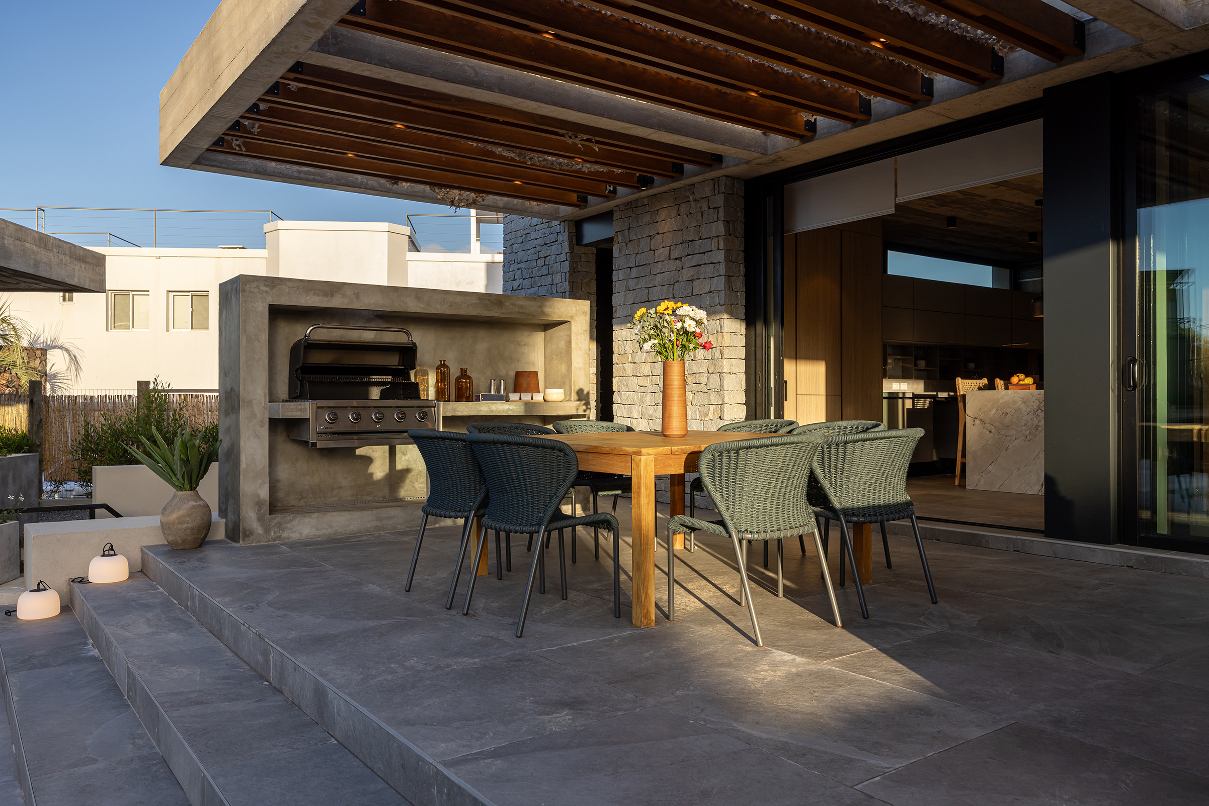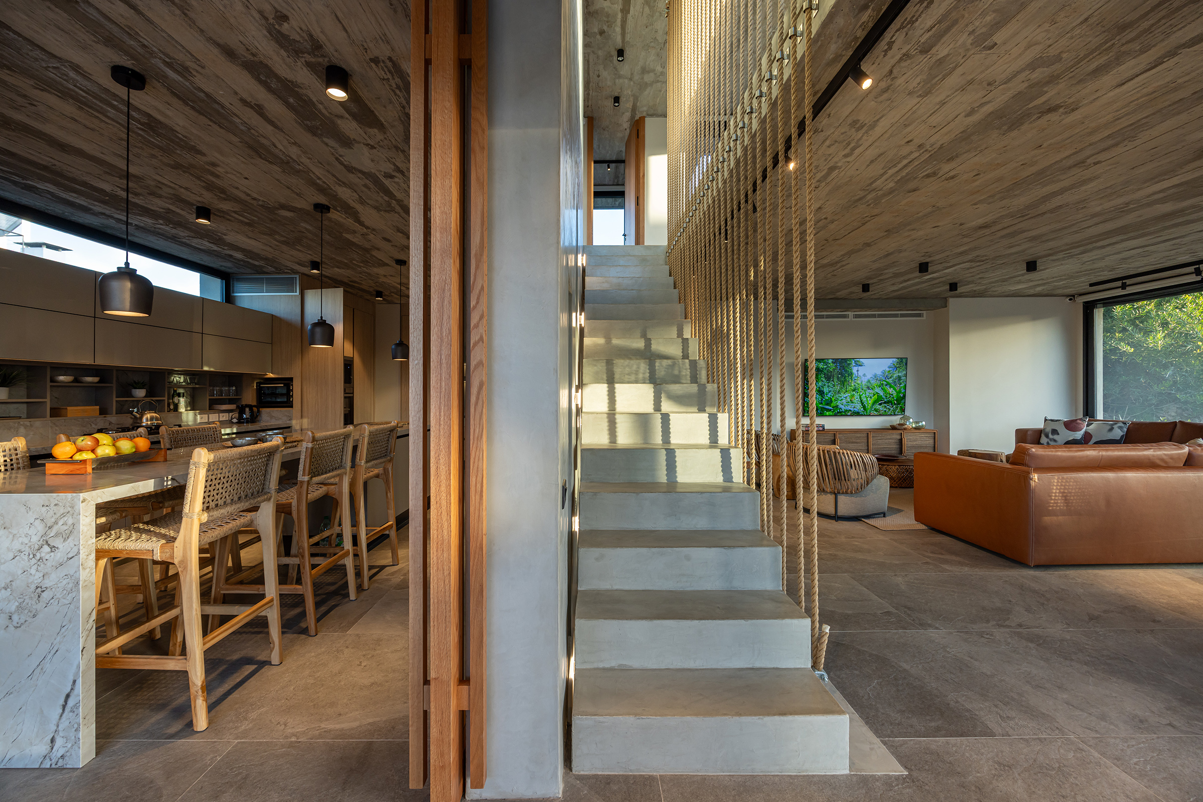 En el nivel inferior —un semisótano que abraza la tierra sin resignarse a la oscuridad— se despliegan los espacios más íntimos y también los técnicos: dos dormitorios en suite que se abren a un patio inglés bañado por el sol del Norte, un gimnasio (con sauna y ducha) que mira al Oeste, un lavadero práctico, una sala de máquinas y un garaje amplio, suficiente para tres autos y para guardar las aventuras. Desde el hall, amplio y luminoso, nace la escalera: de huella y contrahuella macizas, un monolito fragmentado, una escultura de tránsito. Su baranda, hecha de cuerdas verticales, es una alusión discreta y náutica, como si la casa recordara su proximidad al agua. Pero es al llegar a la planta baja donde el relato cambia de tono, se expande, se abre como una novela en su segundo acto. Lo que antes era recogimiento, ahora es fluidez. Allí están el gran estar-comedor, la cocina con isla —espacio de congregación y ritual doméstico— y un estar exterior pergolado que prolonga el interior hacia el jardín. Nada detiene la mirada: los ventanales se deslizan y desaparecen, los planos se intercalan sin fricción, la arquitectura respira. Desde este núcleo abierto se descienden cuatro escalones hacia la piscina y la barbacoa. La barbacoa es otra bandeja de hormigón, suspendida sobre la escena, con paramentos de vidrio que se esconden en muros de piedra y permiten que, al abrirse, el techo parezca flotar. Cuando eso ocurre, uno tiene la impresión de que el tiempo también flota, que todo está suspendido: la luz, la conversación, la brisa.