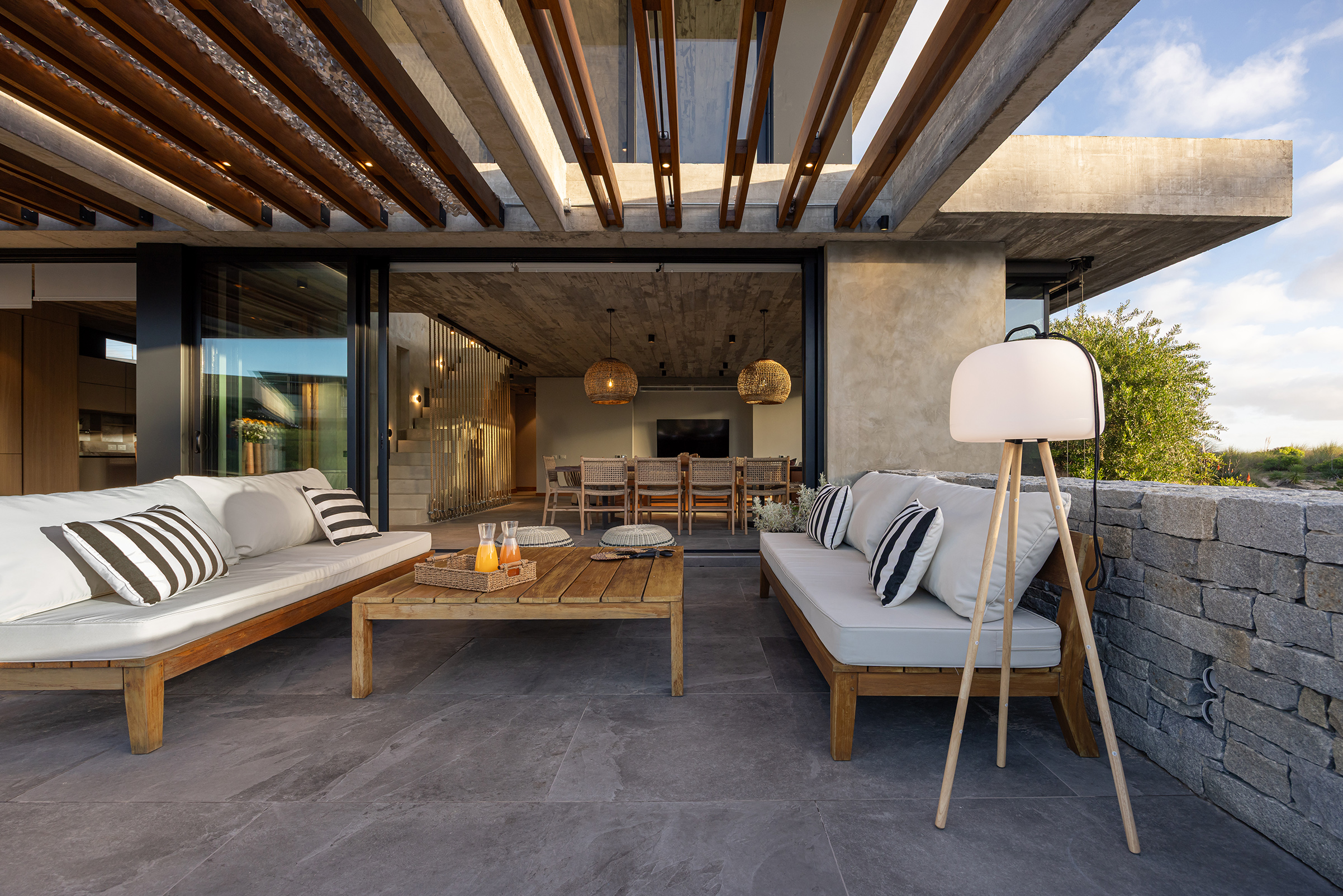 Los materiales han sido elegidos con rigor y mesura: carpinterías de aluminio negro de alta prestación, pavimentos de gran formato color piedra que recorren sin interrupciones interior y exterior, puertas en roble lustrado, paredes pintadas color arena. La escalera plegada en microcemento refuerza la línea ascética, y la elección del mobiliario —de madera clara, fibras naturales como el ratán y el yute— confirma un interiorismo sobrio, sin afectación, levemente “playero”, como corresponde a quien ha entendido que el lujo no necesita alardes. El paisajismo, discreto y funcional, acompaña con especies resistentes al viento salino, con verdes que protegen sin cercar, que envuelven sin ocultar. Es un jardín que no interrumpe el relato de la casa: lo extiende.