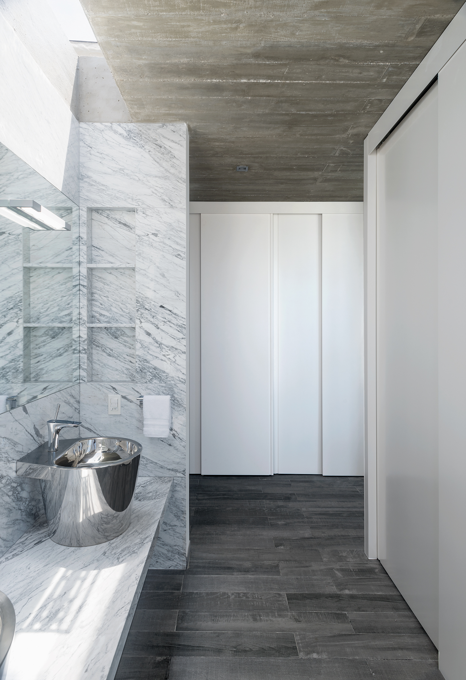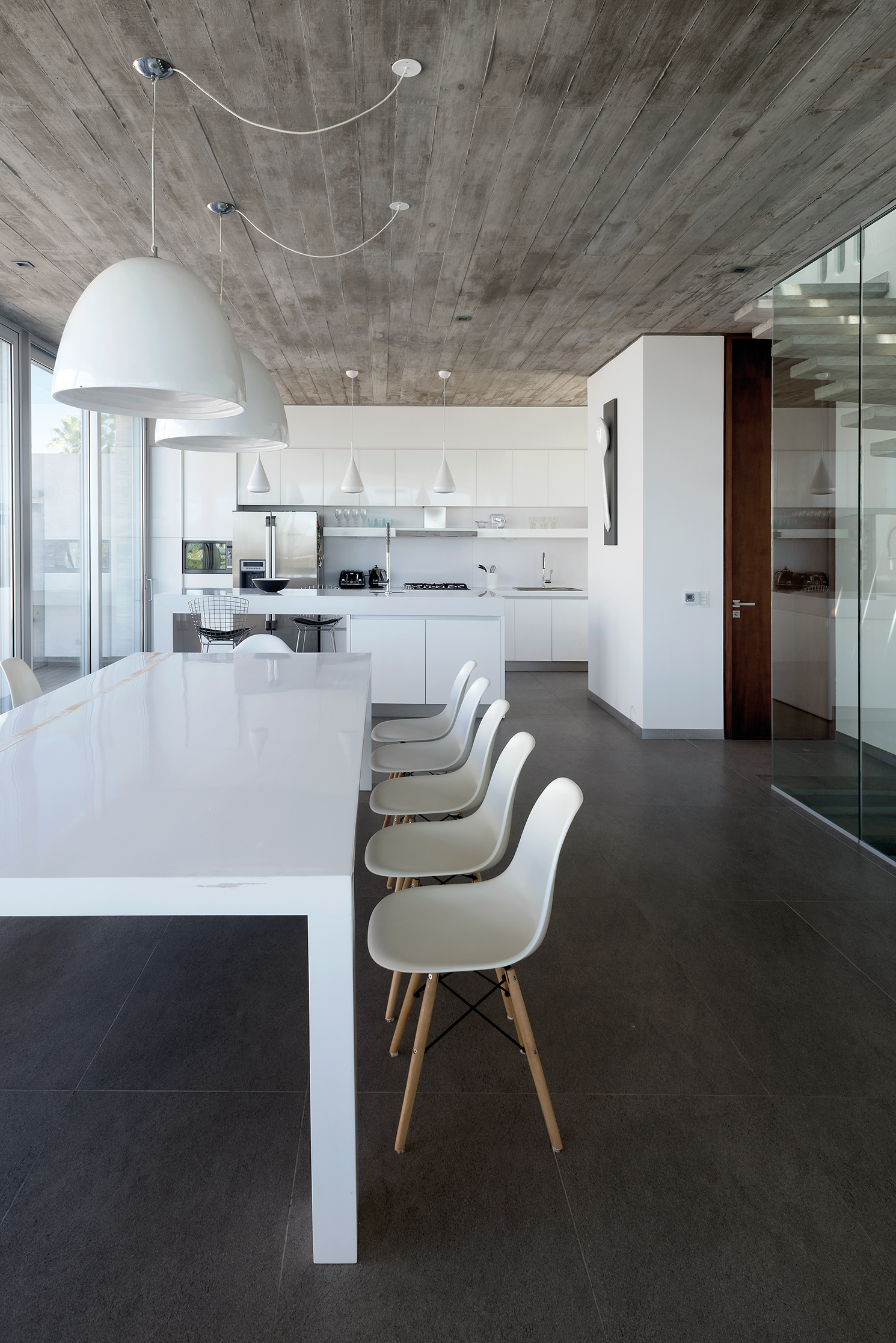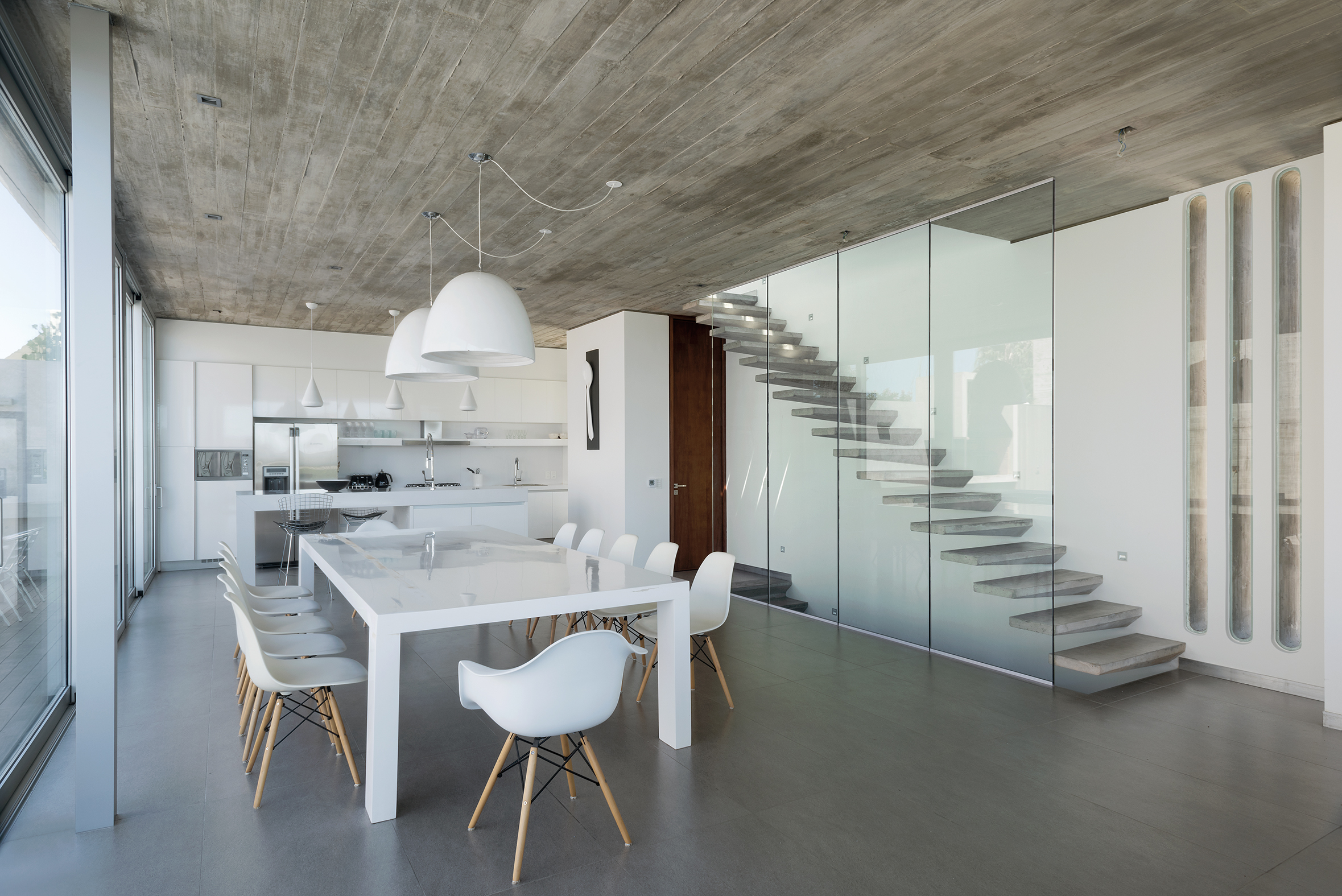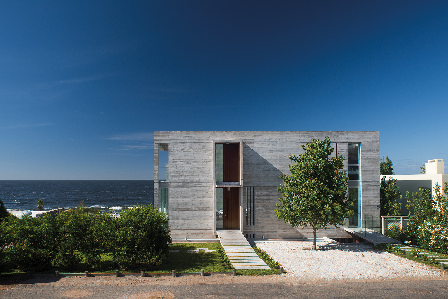 A la casa accedemos desde la calle paralela al mar, la más alejada, ingresando por un puente a ese gran pórtico de hormigón que contiene a la puerta. Este gran prisma gris, muy cerrado a la calle y totalmente abierto al mar, se divide en tres niveles muy claramente diferenciados en sus usos. En la planta del medio se encuentran el living, comedor y cocina totalmente unidos y conectados con el patio /piscina/ parrilla, quizás el corazón de la casa.