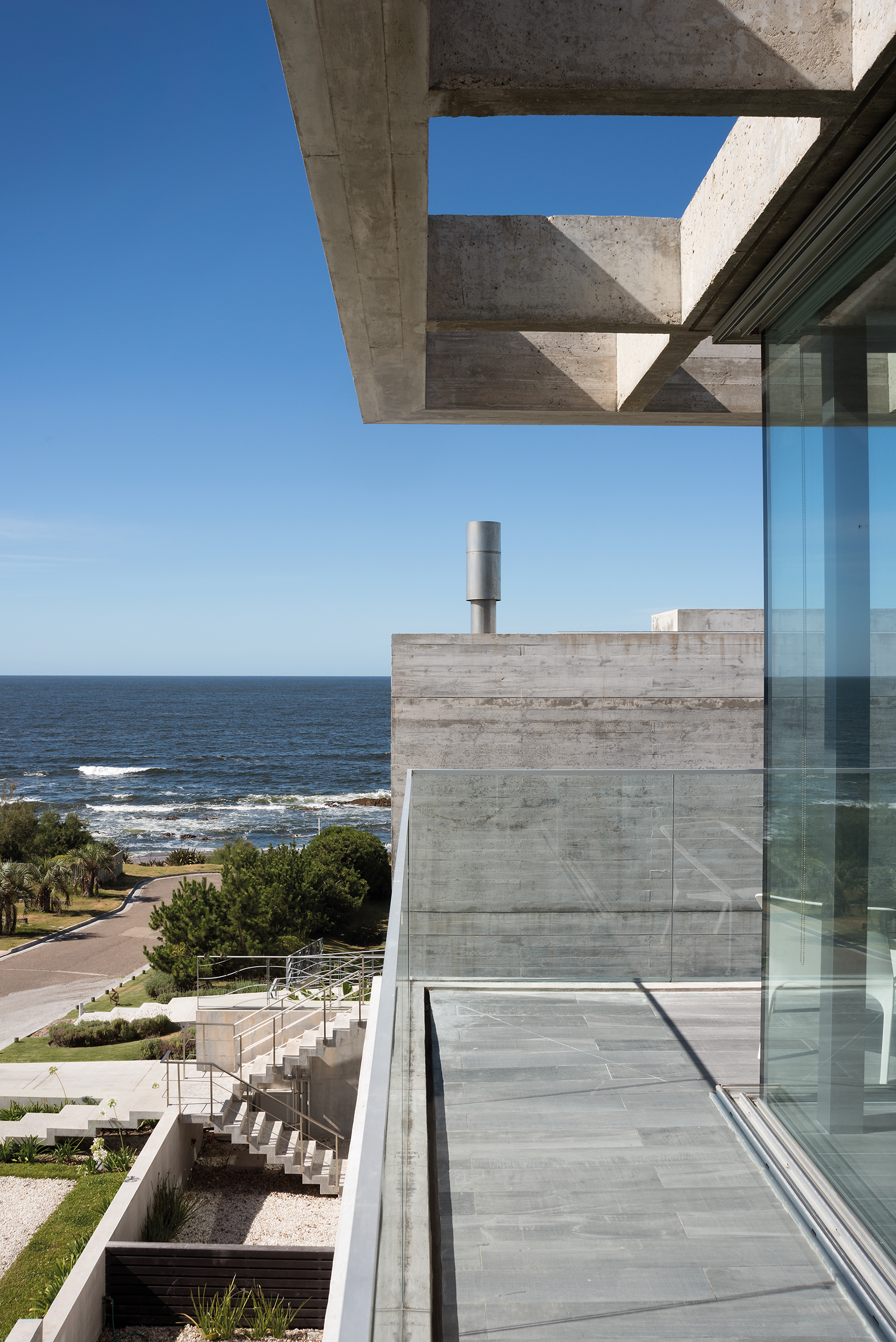 Martín Gómez Pulitnick nos cuenta acerca de esta obra: “La casa principal está resuelta en tres plantas, desde las cuales tenemos vistas increíbles a la playa y al mar eterno. La situación de apertura de esta casa a través del patio-piscina generó una relación con el mar que no habíamos pensado que ocurriría, aunque sin dudas la idea era mirar al mar, pero en este caso el efecto fue de casi penetración en ese ámbito natural tan atractivo que hace que sea total la conexión casa-playa, aun estando separados por unos 100 metros”.