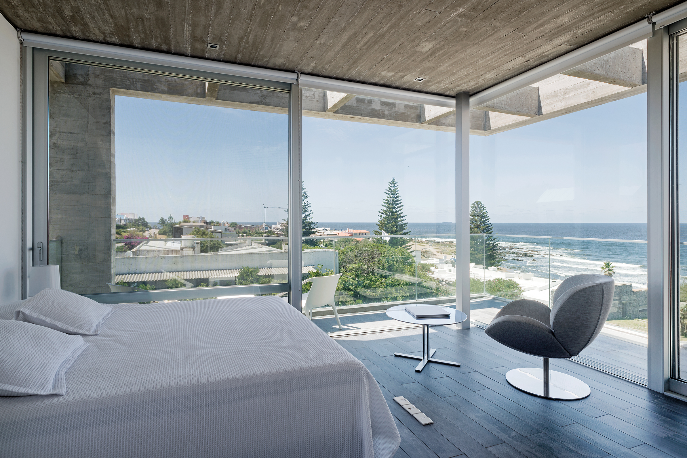 En la planta alta se disponen los tres dormitorios principales y la suite que comanda el barco en la esquina totalmente vidriada que vuela hacia el mar. Cada cuarto tiene su baño y sus vistas francas al horizonte marino del este. En la planta de abajo se proyectaron dos dormitorios para huéspedes, un gran playroom con cine, depósitos, lavadero y zona de servicio. Los materiales utilizados son los que dan color a la casa y a su conjunto, solo hormigón visto y madera, para no tener ningún tipo de mantenimiento. La idea fue hacer dos casas de playa sin mantenimiento, solo para disfrutar de largos veranos esteños.