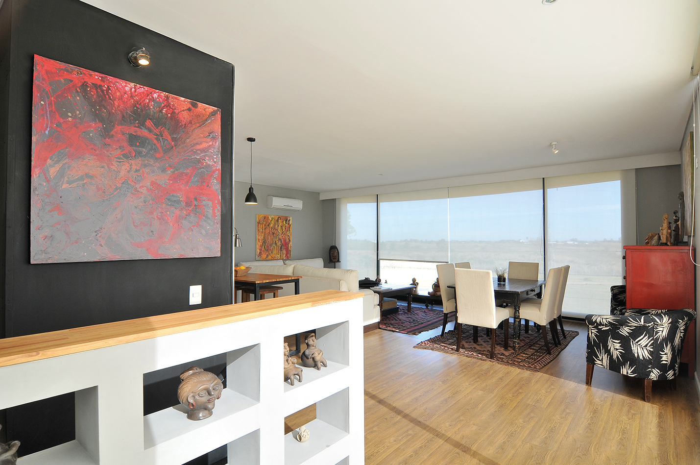 La planta alta está constituida por dos ambientes, el dormitorio en suite y el área destinada a uso social. El living-estar principal es cómodo y espacioso, la mezcla de estilos rústico y contemporáneo juegan con las magníficas obras de arte de la artista Marisa Rubio, que brindan armonía al conjunto.