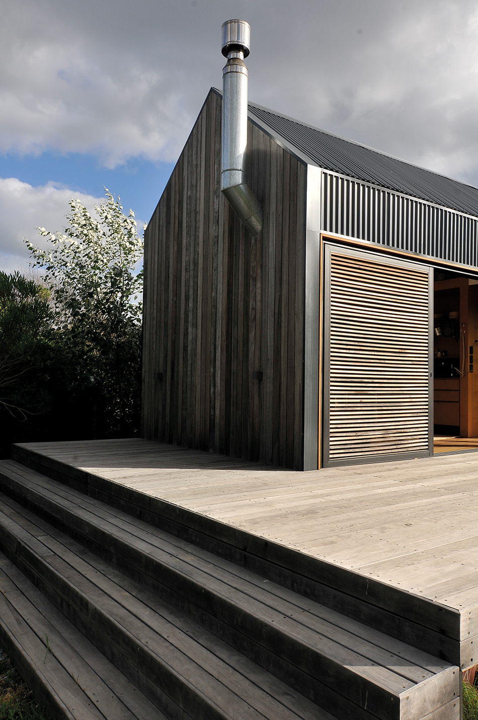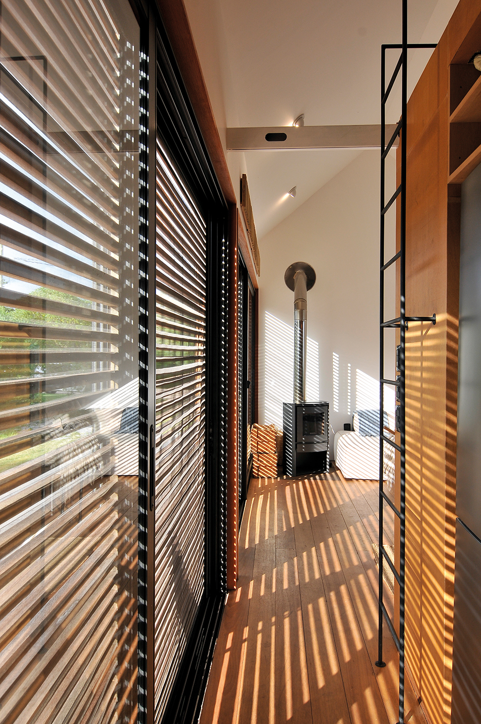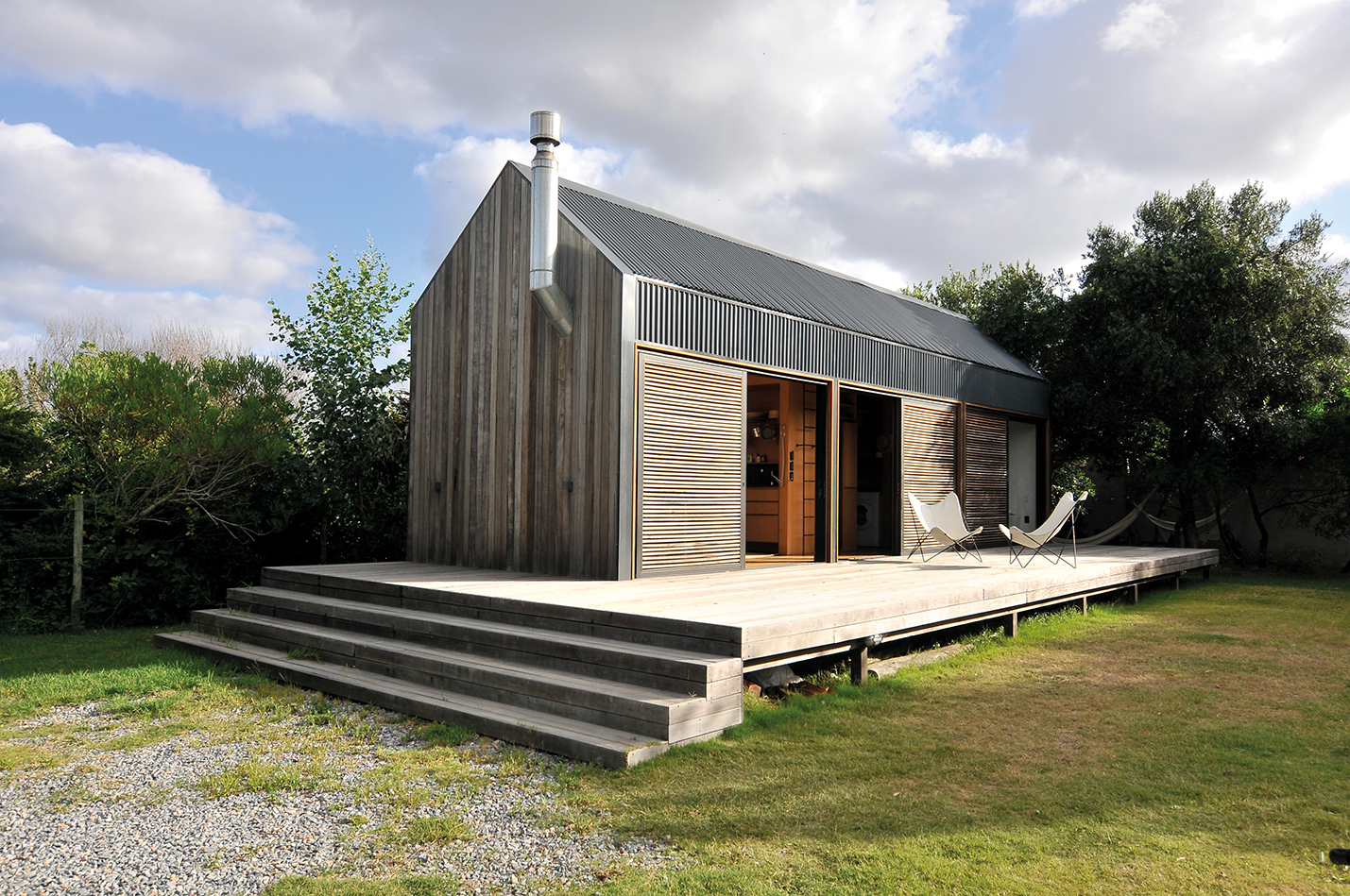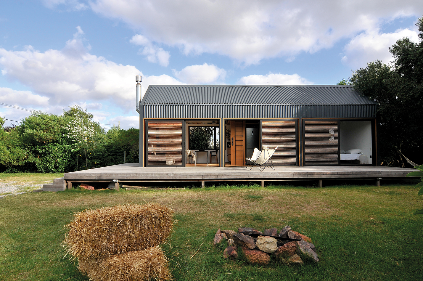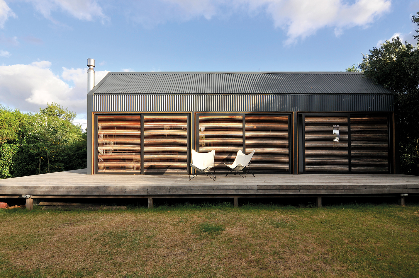 Esta casa, ubicada en El Chorro, está implantada en un entorno donde la naturaleza es protagonista. Un gran deck de madera de Lapacho se levanta en el terreno y da lugar a esta vivienda bastante particular. La estructura de hierro rectangular, dividida en tres módulos, es abrazada por chapas metálicas y contenida en sus aberturas por listones de madera que, al cerrarse, logran mimetizar a la vivienda con el entorno y así hacerla parte de la naturaleza circundante. En sus caras laterales, la casa se muestra en forma pentagonal asistida por listones de Lapacho que contrarrestan la chapa metálica y ofrecen una estructura orgánica.