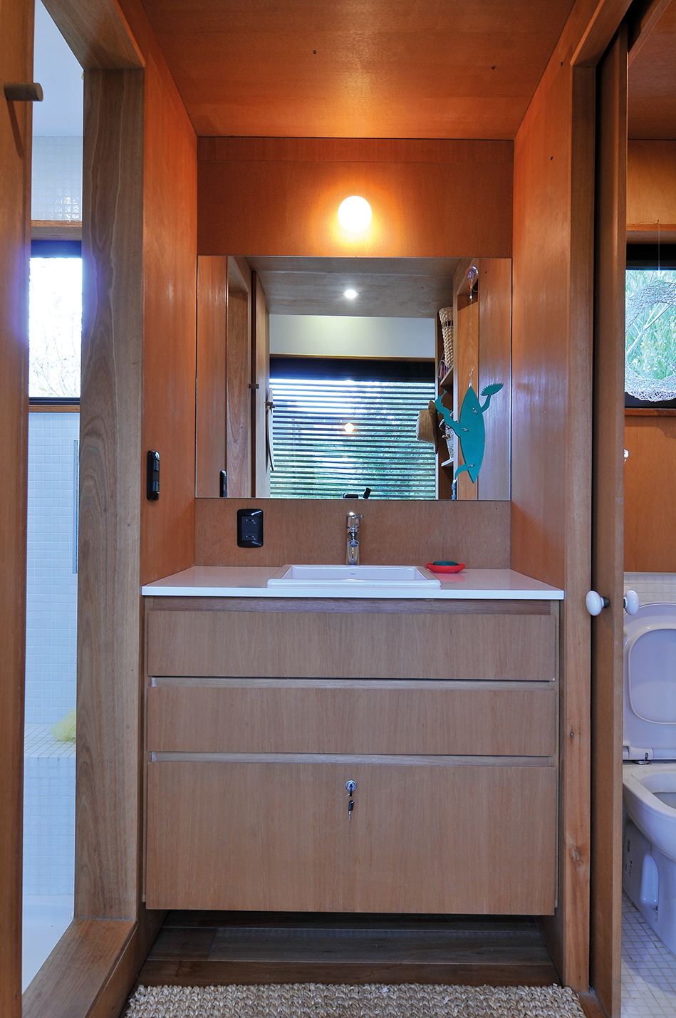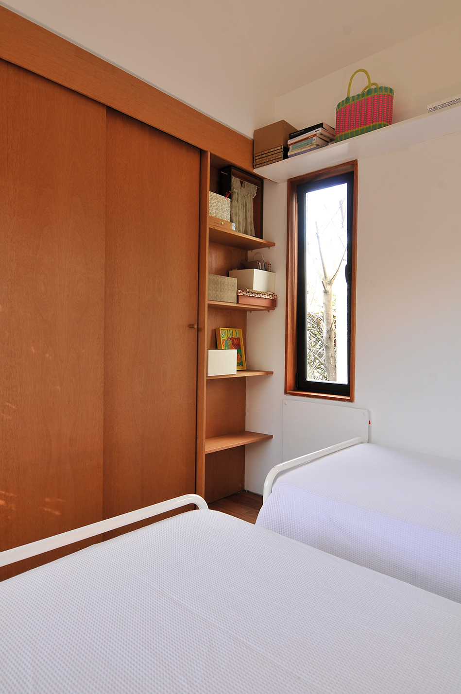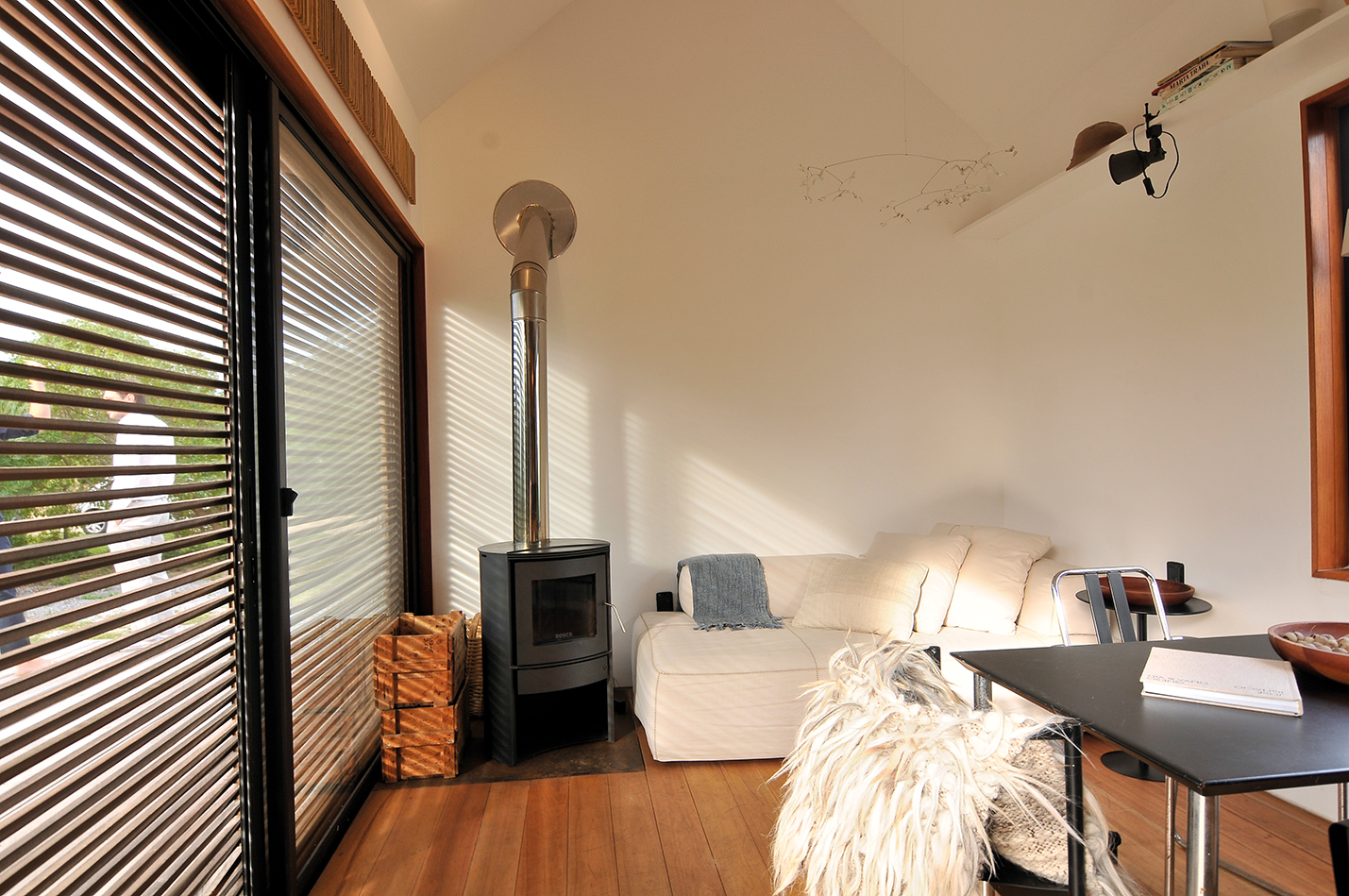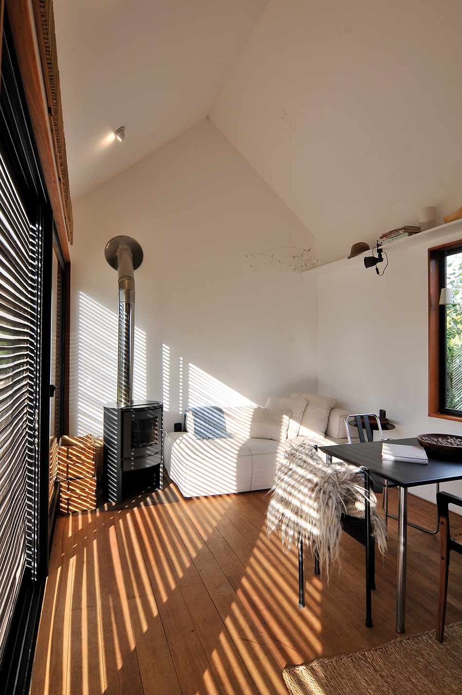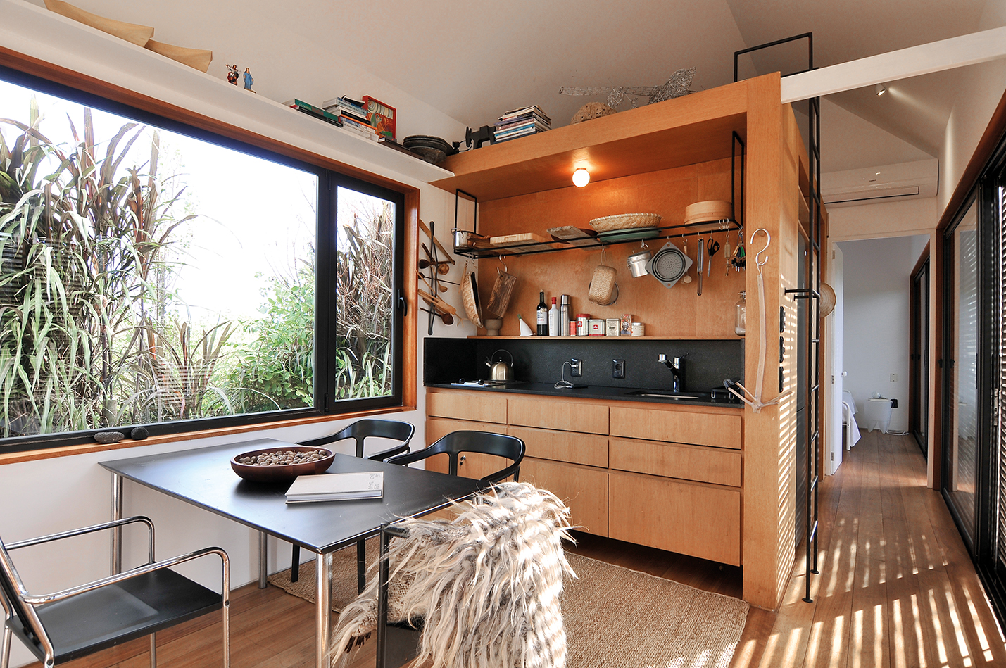 “La casa fue pensada como un espacio que se define a través de la ambientación” nos comenta Pedro. El ambiente principal, destinado a sala de estar, comedor-cocina, tiene lo justo y necesario para una estadía confortable. El rebote creado por el juego dos aguas del techo dimensiona mas aun el espacio y logra integrar a través de las ventanas y los colores puros a la luz natural. La cocina, construida enteramente en madera, funciona como eje esencial en la distribución de los ambientes. “La cocina logra delimitar el espacio destinado a uso social y se desenvuelve por medio de texturas nobles que acompasan la integridad espacial de la casa” a continuación, el baño. La disposición del baño comprende su ubicación al aprovechamiento de la funcionalidad espacial en cuanto a los conductos de las tuberías. Al fondo, el dormitorio. De esta forma, la casa se resuelve en su interior a conciencia. El proyecto resuelve a esta vivienda en una presentación en línea con una gran apertura hacia el exterior a través de las grandes aberturas de aluminio que, al abrirse, se integran al exterior generando un espacio único que se porta hacia la naturaleza.