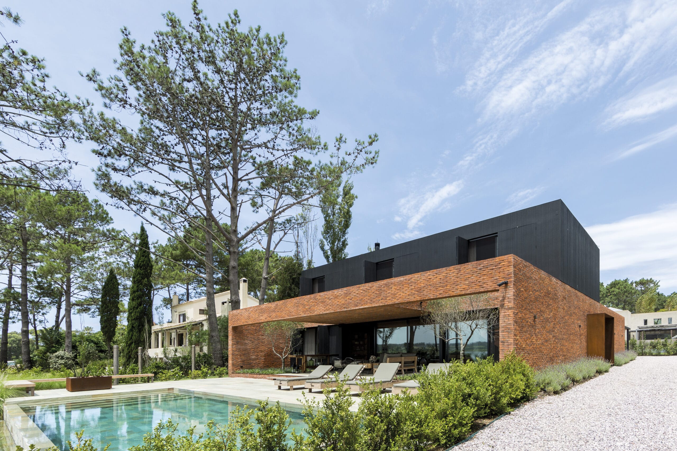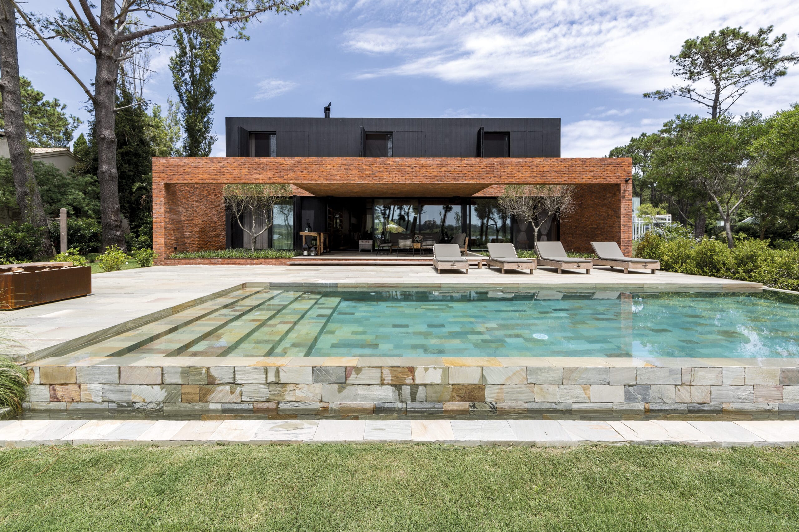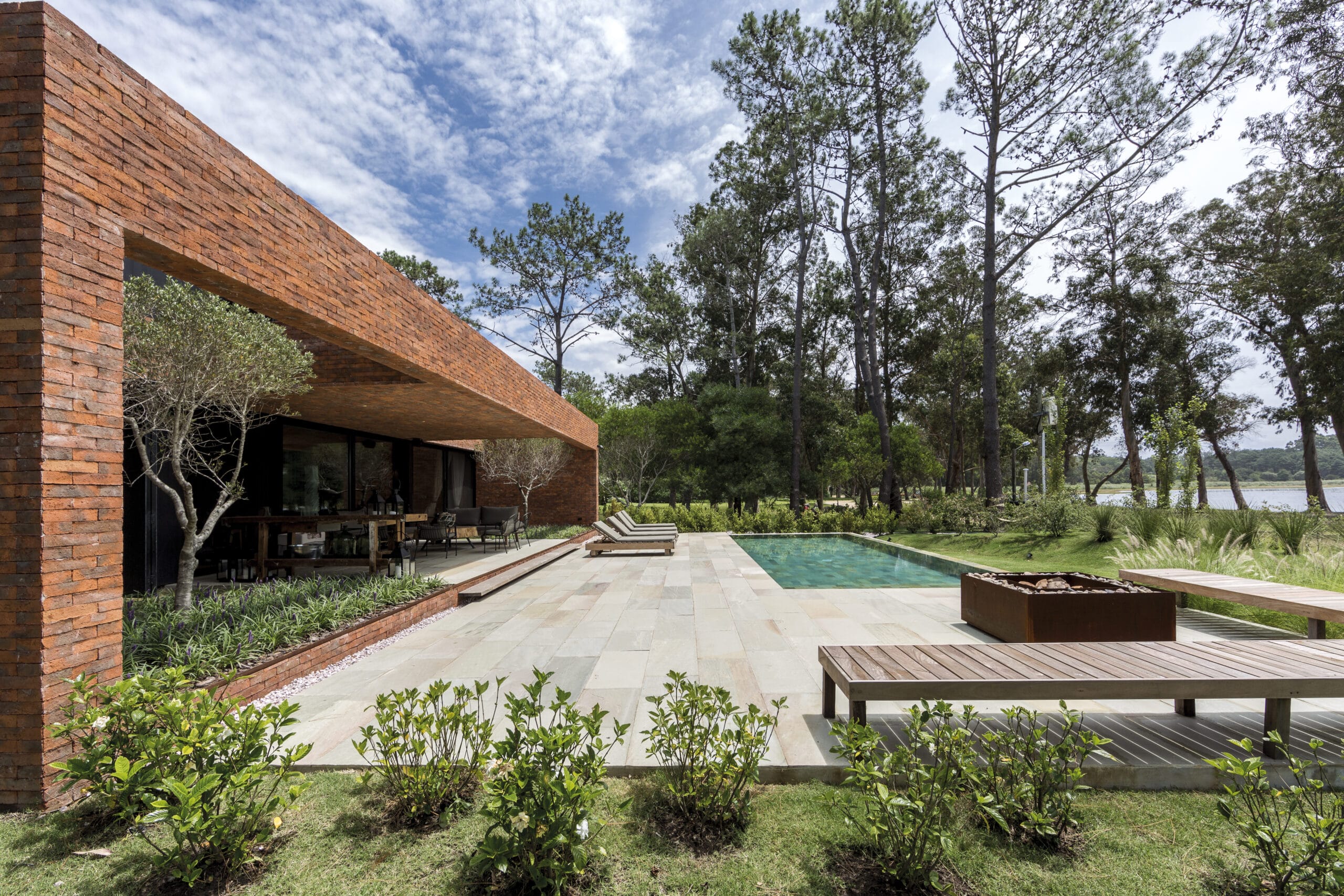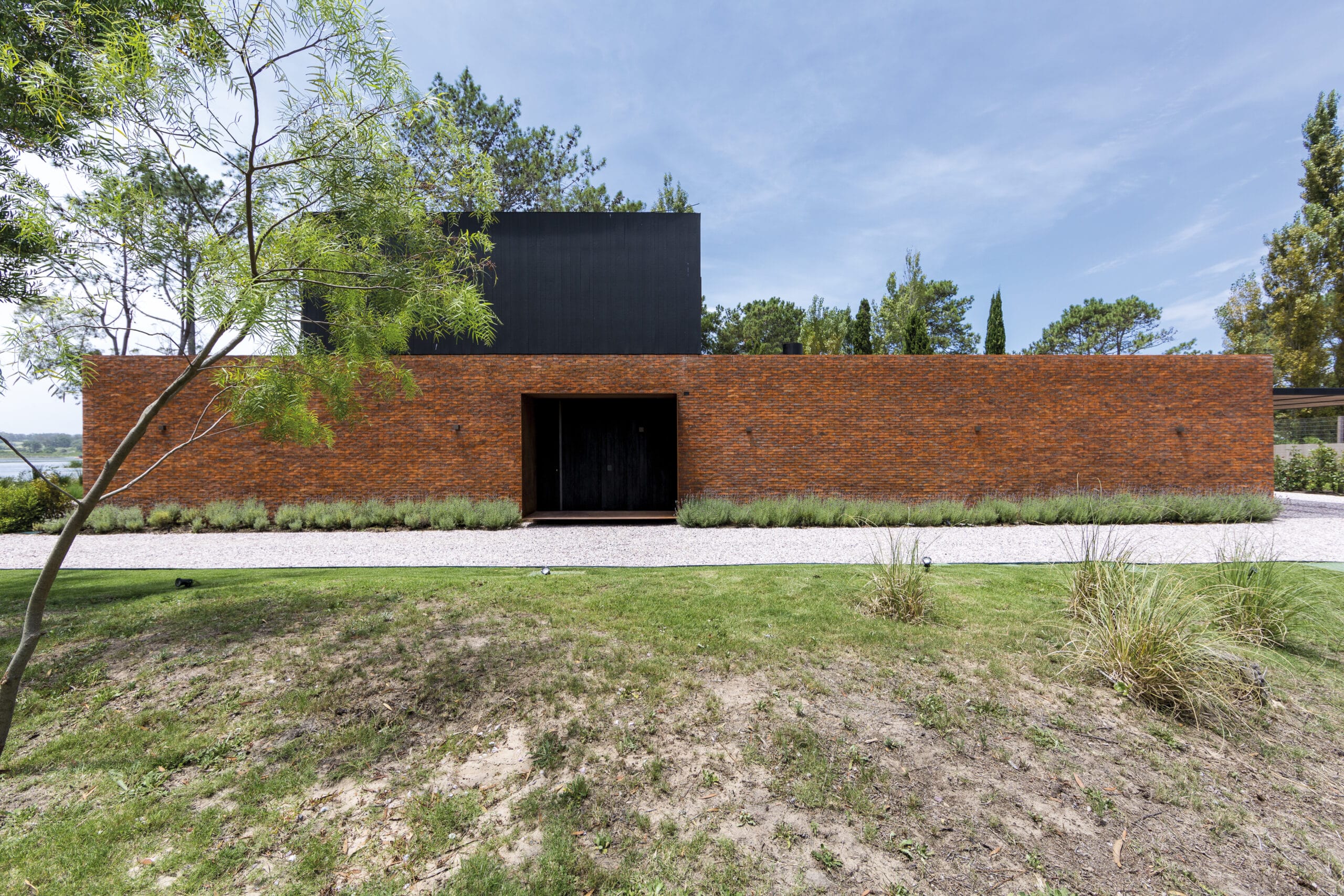 Esta obra, ubicada en la urbanización Laguna Blanca, se define como una casa residencial de dos plantas claramente determinadas. La estructura central presenta un gran volumen de madera de eucaliptus negro que ejerce de semilla en la distribución de la composición, esta estructura es contenida en su envolvente por otro volumen de ladrillo que acompaña y define al conjunto de forma exuberante. De esta forma, se generan distintos juegos de planos llenos y vacíos a través de los materiales. Para esta obra, los proyectistas decidieron apostar a una composición de materiales tradicionales, el núcleo central de la casa fue resuelto en madera, el ladrillo complementa esta matriz actuando como cerramiento para los módulos que se abren al exterior. La fachada principal de la casa se muestra como una gran estructura cerrada que únicamente determina el ingreso. La gran sala principal oficia de living-comedor modera su espacialidad con paredes y cielorraso revestidos en lapacho y, como contrapunto, los claros de la piedra laja regular en el piso y las grandes aberturas de aluminio negro que integran al exterior. Este gran ambiente distribuye su espacialidad por medio del mobiliario seleccionado. La división del espacio está ordenada por aberturas de aluminio de tiro completo que al abrirse generan un gran espacio interior exterior que se asoma a la gran piscina de losa y se entrega al paisaje. En planta alta se encuentran los dormitorios y áreas privadas de la casa.