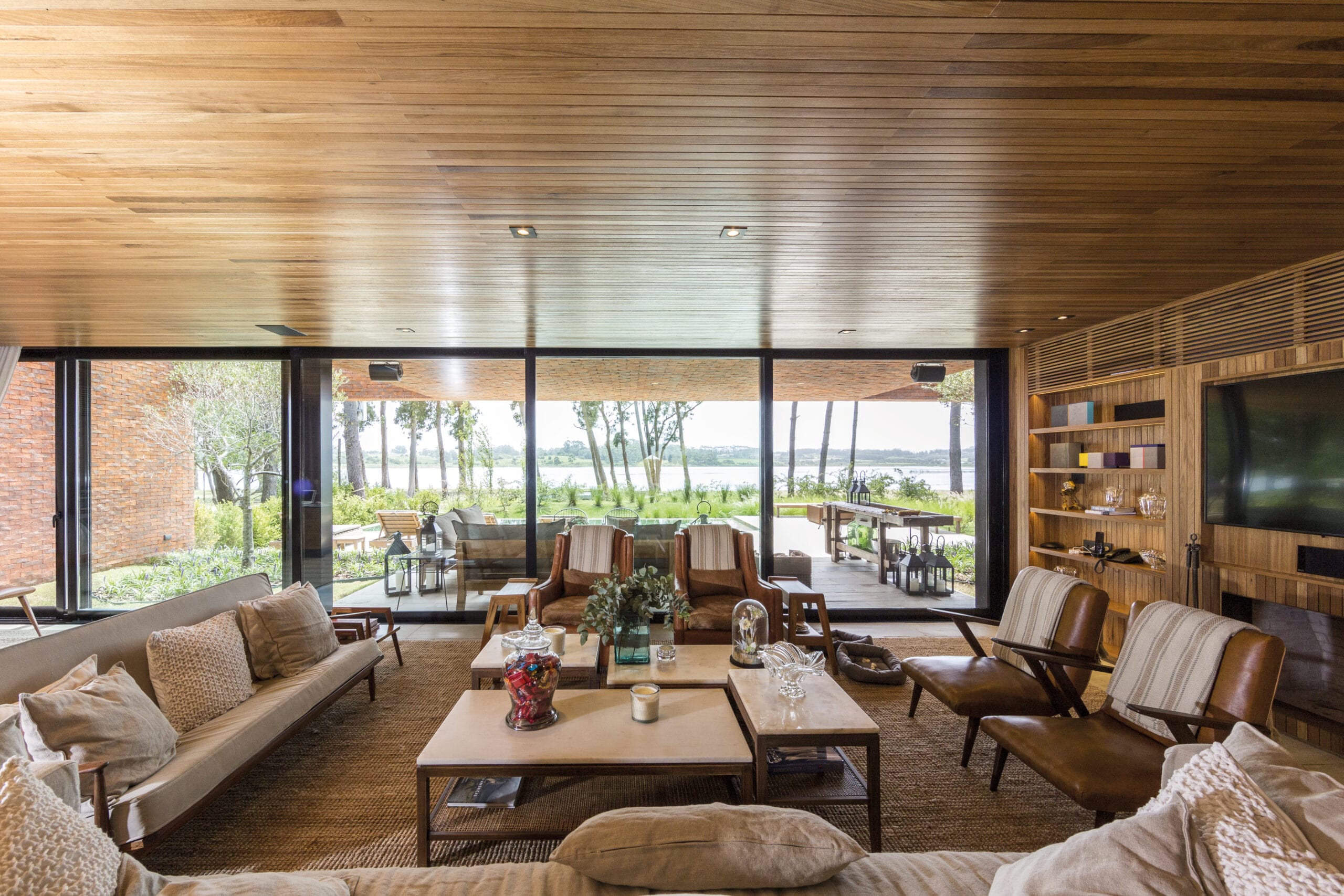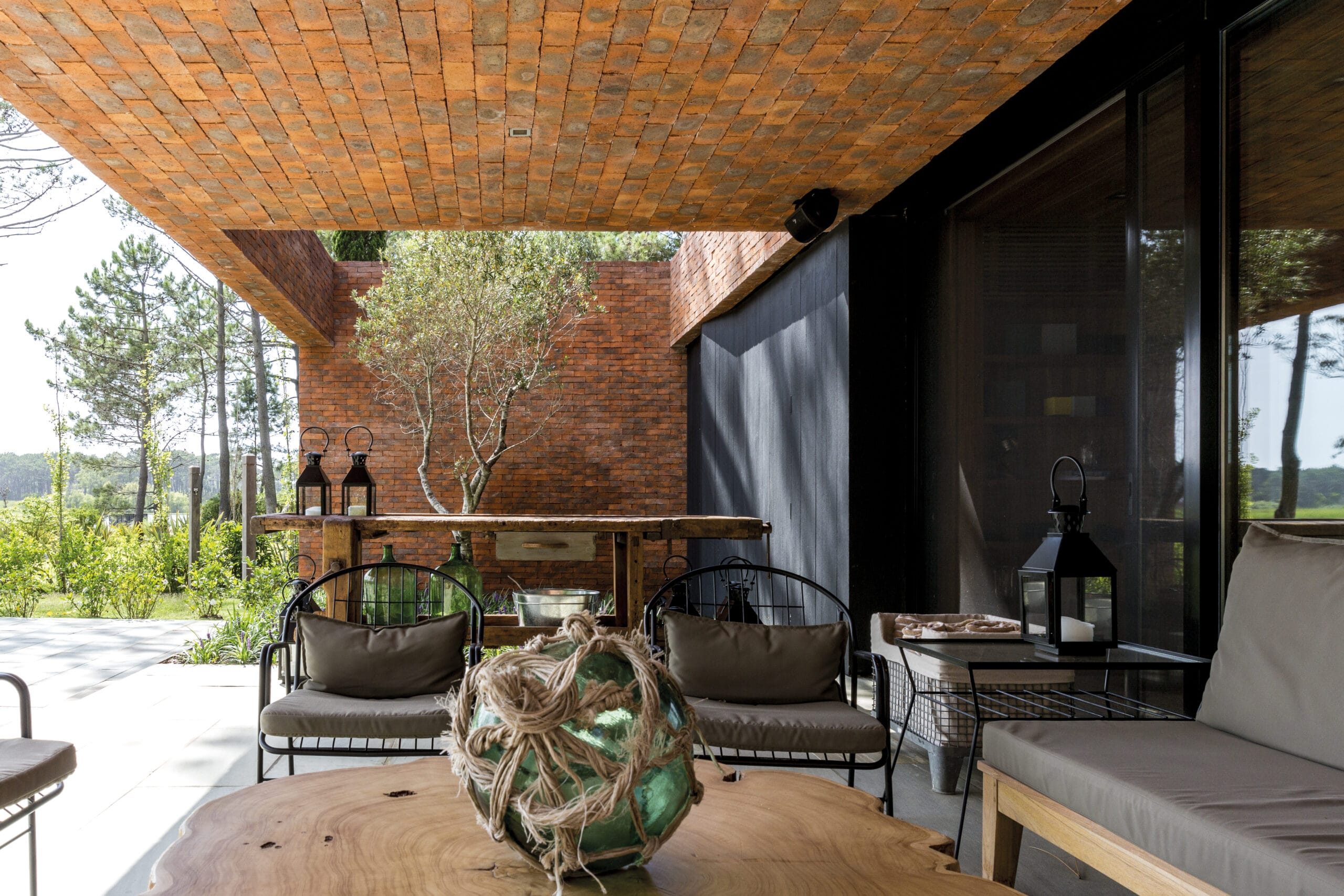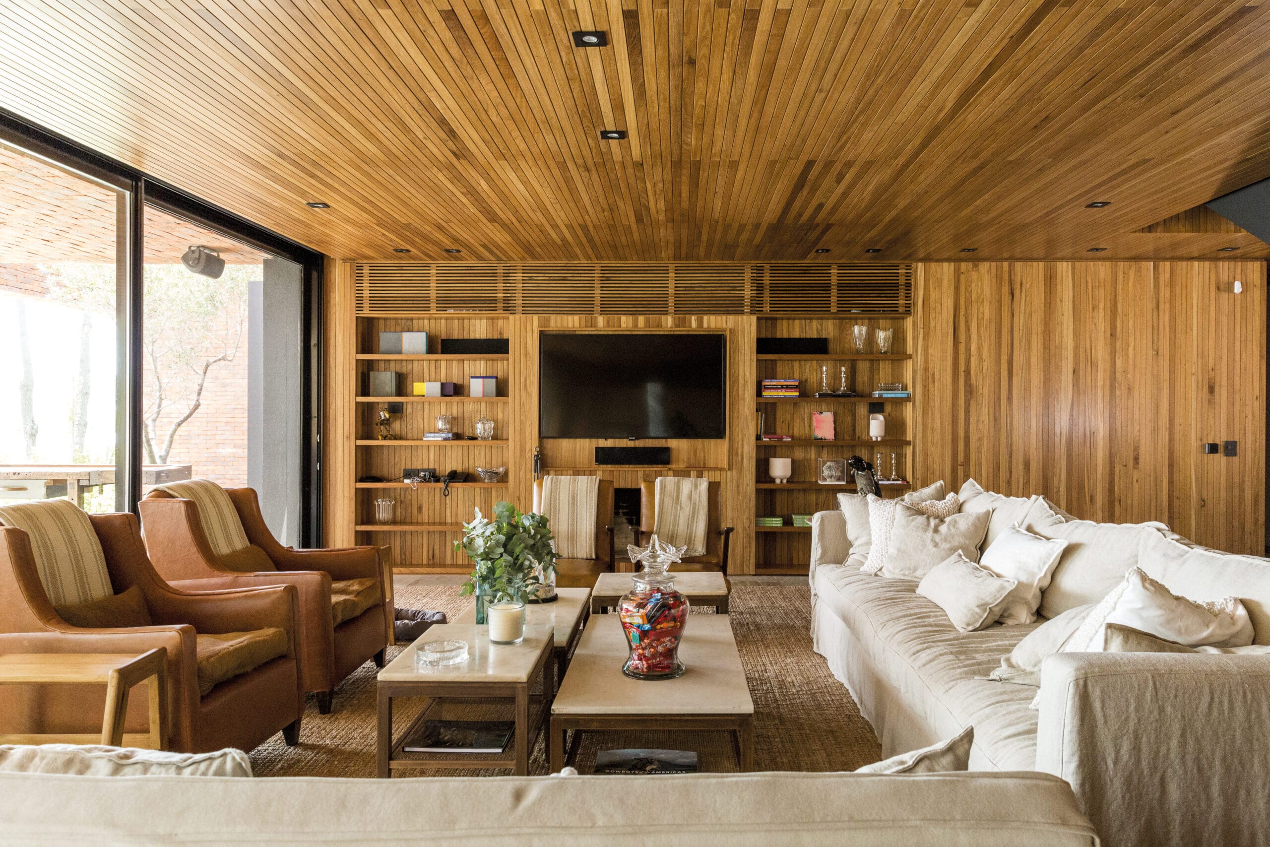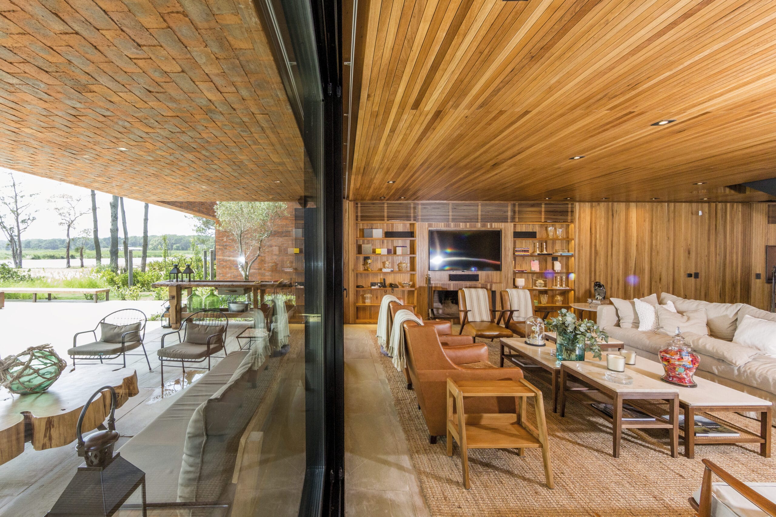 Esta obra, ubicada en la urbanización Laguna Blanca, se define como una casa residencial de dos plantas claramente determinadas. La estructura central presenta un gran volumen de madera de eucaliptus negro que ejerce de semilla en la distribución de la composición, esta estructura es contenida en su envolvente por otro volumen de ladrillo que acompaña y define al conjunto de forma exuberante. De esta forma, se generan distintos juegos de planos llenos y vacíos a través de los materiales. Para esta obra, los proyectistas decidieron apostar a una composición de materiales tradicionales, el núcleo central de la casa fue resuelto en madera, el ladrillo complementa esta matriz actuando como cerramiento para los módulos que se abren al exterior. La fachada principal de la casa se muestra como una gran estructura cerrada que únicamente determina el ingreso. La gran sala principal oficia de living-comedor modera su espacialidad con paredes y cielorraso revestidos en lapacho y, como contrapunto, los claros de la piedra laja regular en el piso y las grandes aberturas de aluminio negro que integran al exterior. Este gran ambiente distribuye su espacialidad por medio del mobiliario seleccionado. La división del espacio está ordenada por aberturas de aluminio de tiro completo que al abrirse generan un gran espacio interior exterior que se asoma a la gran piscina de losa y se entrega al paisaje. En planta alta se encuentran los dormitorios y áreas privadas de la casa.