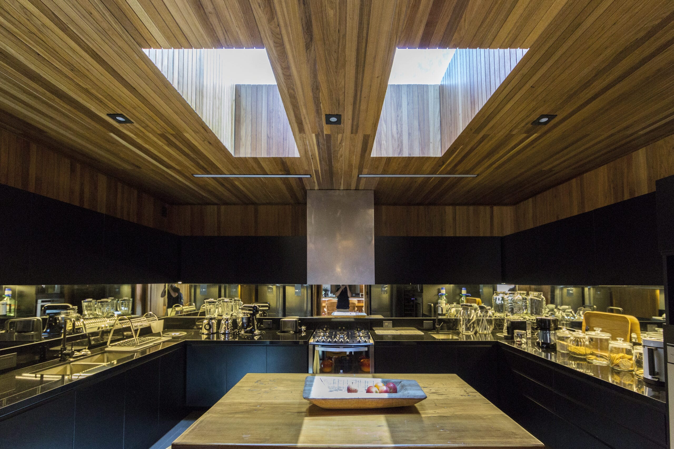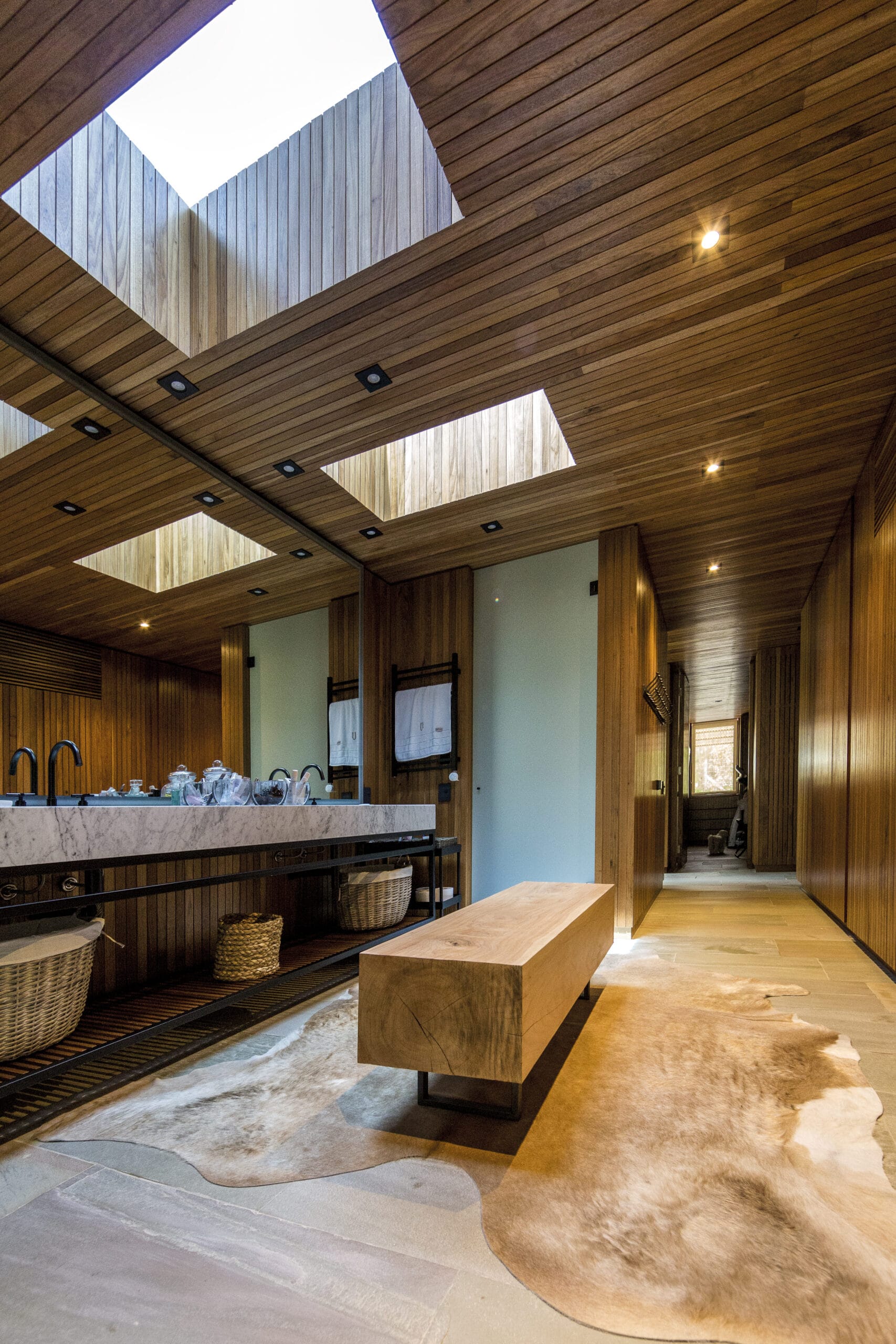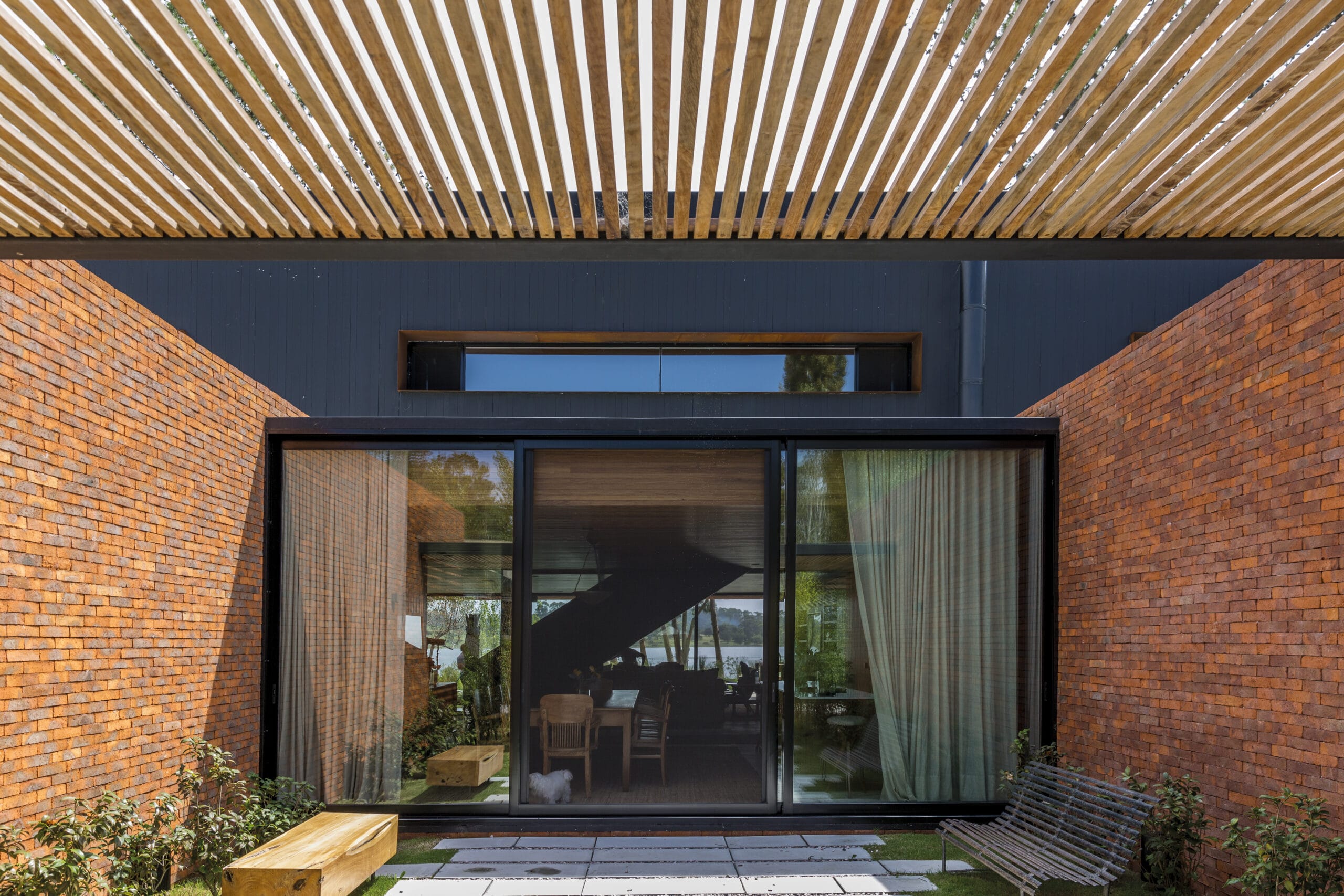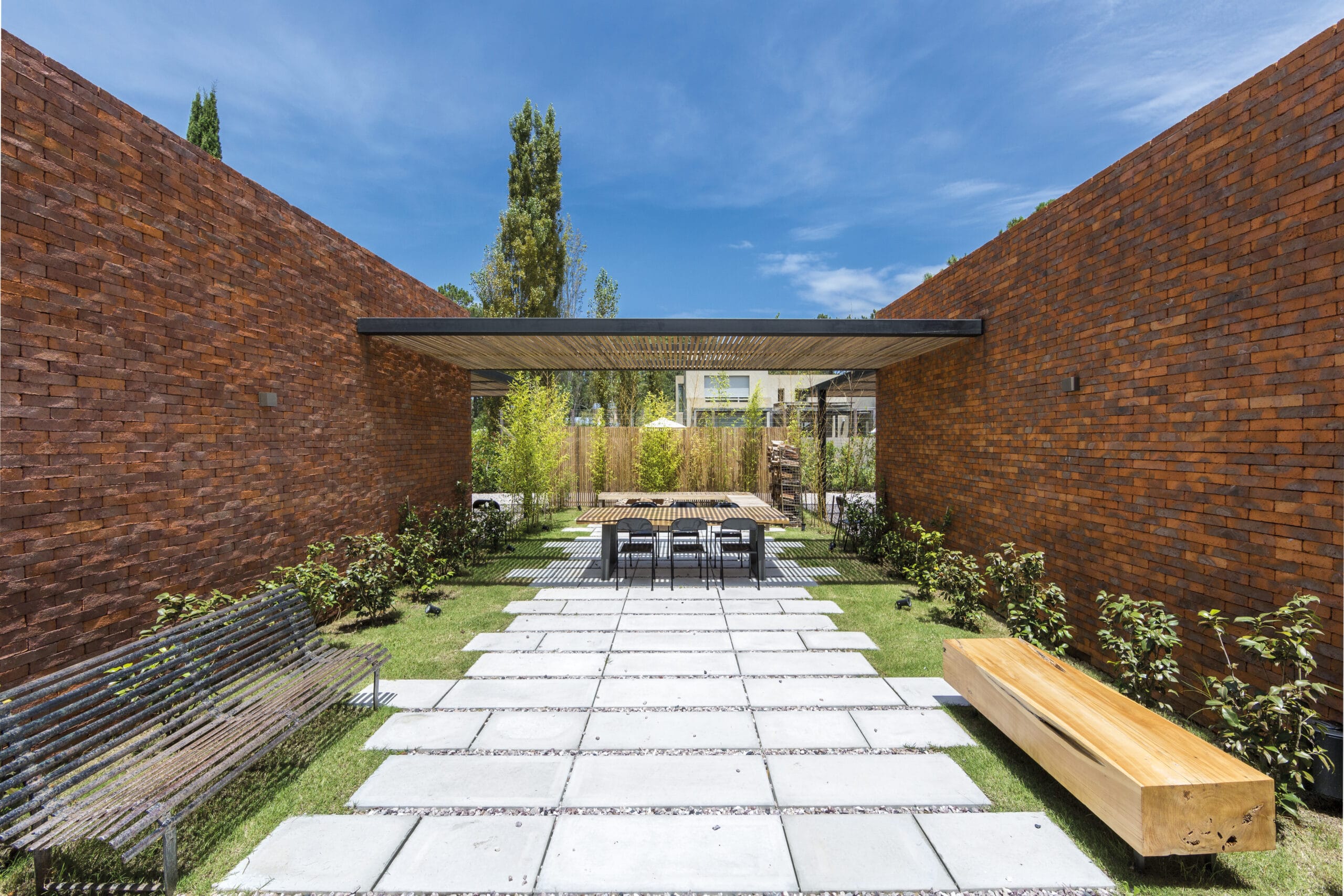 Esta obra, ubicada en la urbanización Laguna Blanca, se define como una casa residencial de dos plantas claramente determinadas. La estructura central presenta un gran volumen de madera de eucaliptus negro que ejerce de semilla en la distribución de la composición, esta estructura es contenida en su envolvente por otro volumen de ladrillo que acompaña y define al conjunto de forma exuberante. De esta forma, se generan distintos juegos de planos llenos y vacíos a través de los materiales. Para esta obra, los proyectistas decidieron apostar a una composición de materiales tradicionales, el núcleo central de la casa fue resuelto en madera, el ladrillo complementa esta matriz actuando como cerramiento para los módulos que se abren al exterior. La fachada principal de la casa se muestra como una gran estructura cerrada que únicamente determina el ingreso. La gran sala principal oficia de living-comedor modera su espacialidad con paredes y cielorraso revestidos en lapacho y, como contrapunto, los claros de la piedra laja regular en el piso y las grandes aberturas de aluminio negro que integran al exterior. Este gran ambiente distribuye su espacialidad por medio del mobiliario seleccionado. La división del espacio está ordenada por aberturas de aluminio de tiro completo que al abrirse generan un gran espacio interior exterior que se asoma a la gran piscina de losa y se entrega al paisaje. En planta alta se encuentran los dormitorios y áreas privadas de la casa.