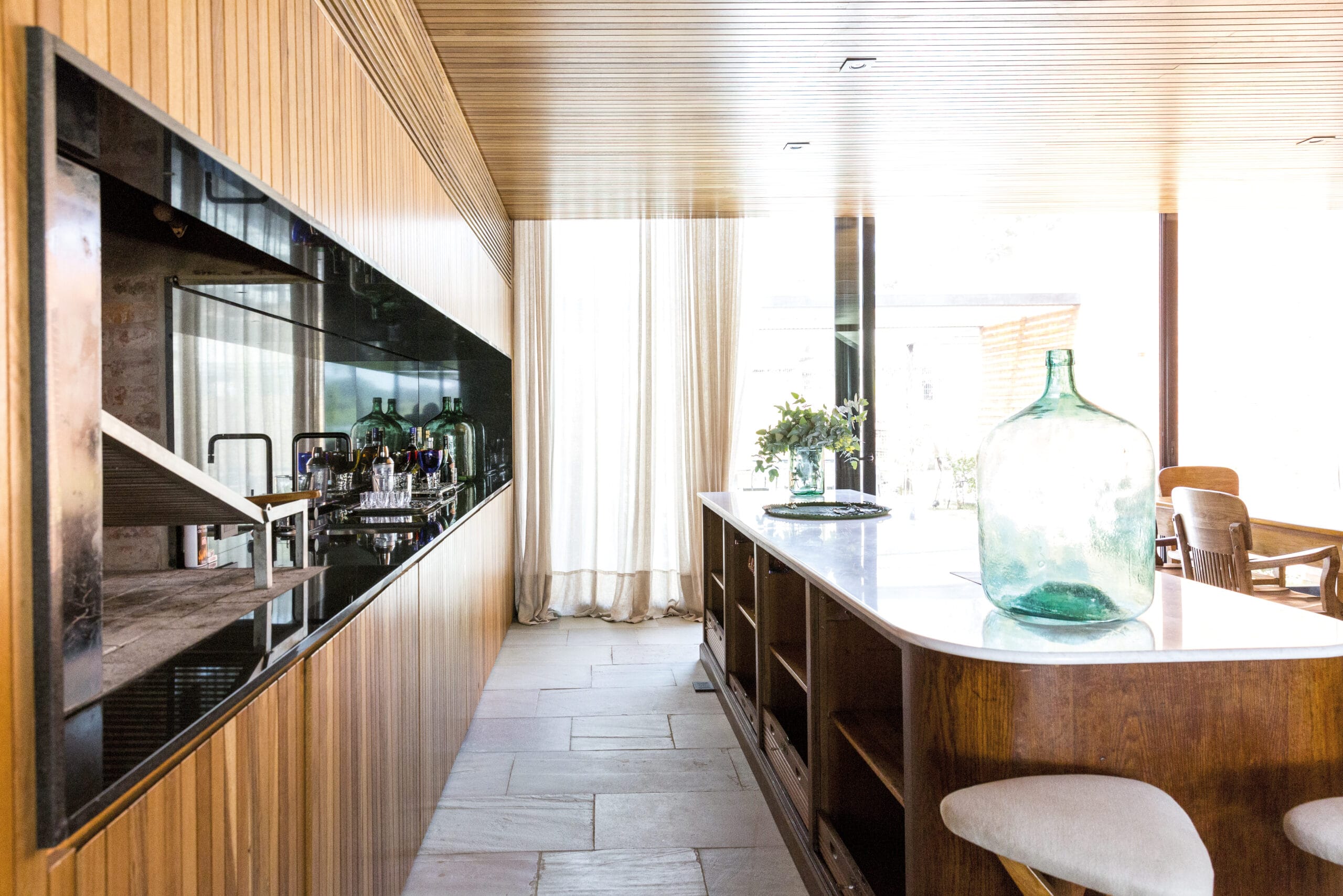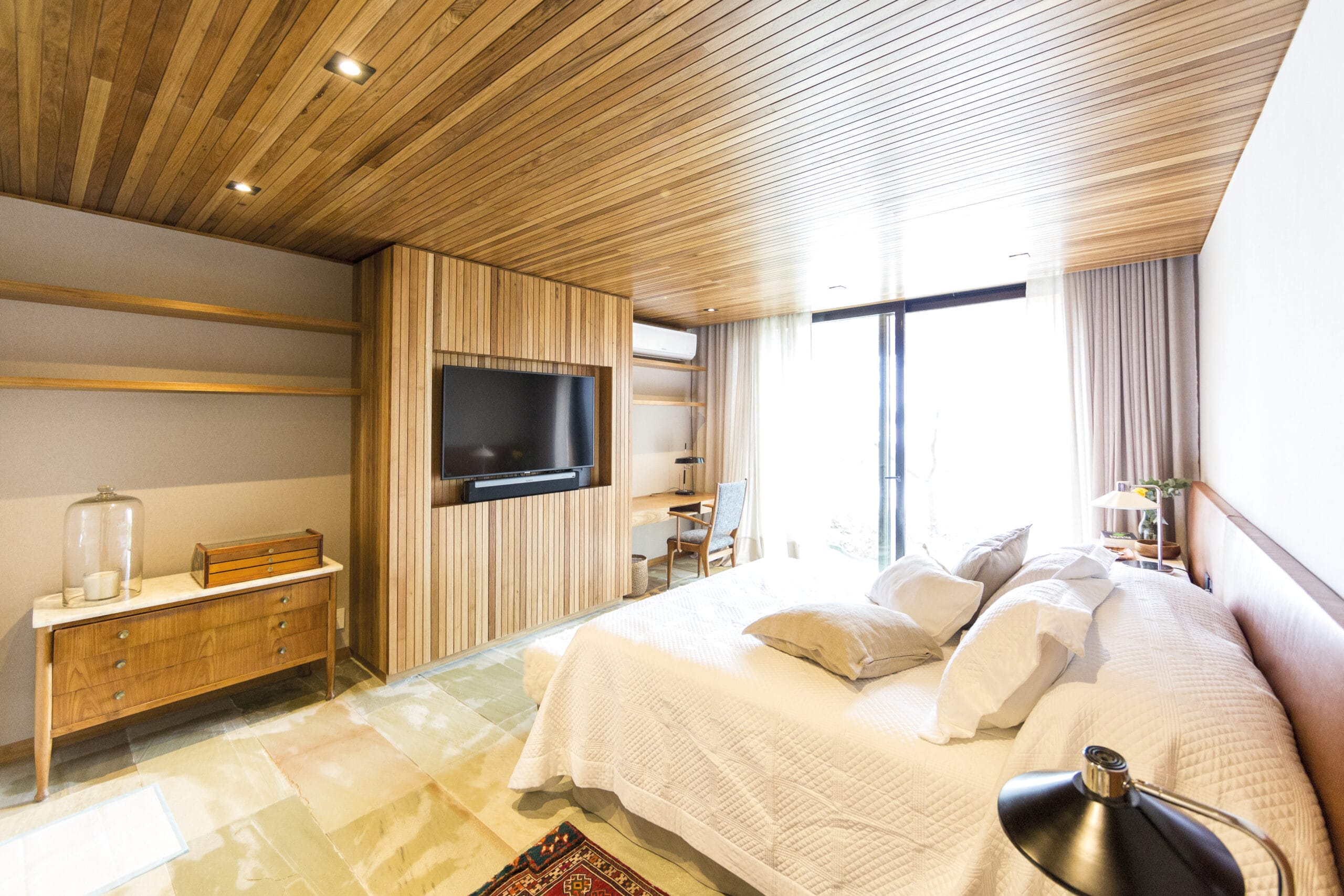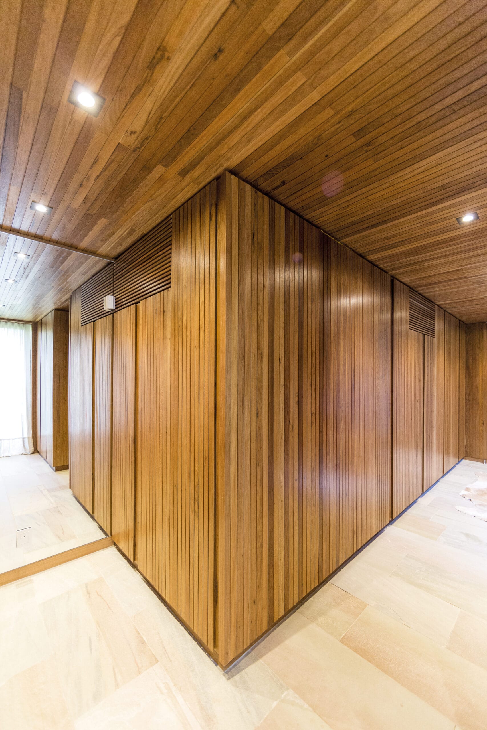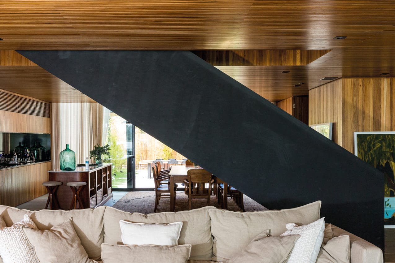 Esta obra, ubicada en la urbanización Laguna Blanca, se define como una casa residencial de dos plantas claramente determinadas. La estructura central presenta un gran volumen de madera de eucaliptus negro que ejerce de semilla en la distribución de la composición, esta estructura es contenida en su envolvente por otro volumen de ladrillo que acompaña y define al conjunto de forma exuberante. De esta forma, se generan distintos juegos de planos llenos y vacíos a través de los materiales. Para esta obra, los proyectistas decidieron apostar a una composición de materiales tradicionales, el núcleo central de la casa fue resuelto en madera, el ladrillo complementa esta matriz actuando como cerramiento para los módulos que se abren al exterior. La fachada principal de la casa se muestra como una gran estructura cerrada que únicamente determina el ingreso. La gran sala principal oficia de living-comedor modera su espacialidad con paredes y cielorraso revestidos en lapacho y, como contrapunto, los claros de la piedra laja regular en el piso y las grandes aberturas de aluminio negro que integran al exterior. Este gran ambiente distribuye su espacialidad por medio del mobiliario seleccionado. La división del espacio está ordenada por aberturas de aluminio de tiro completo que al abrirse generan un gran espacio interior exterior que se asoma a la gran piscina de losa y se entrega al paisaje. En planta alta se encuentran los dormitorios y áreas privadas de la casa.