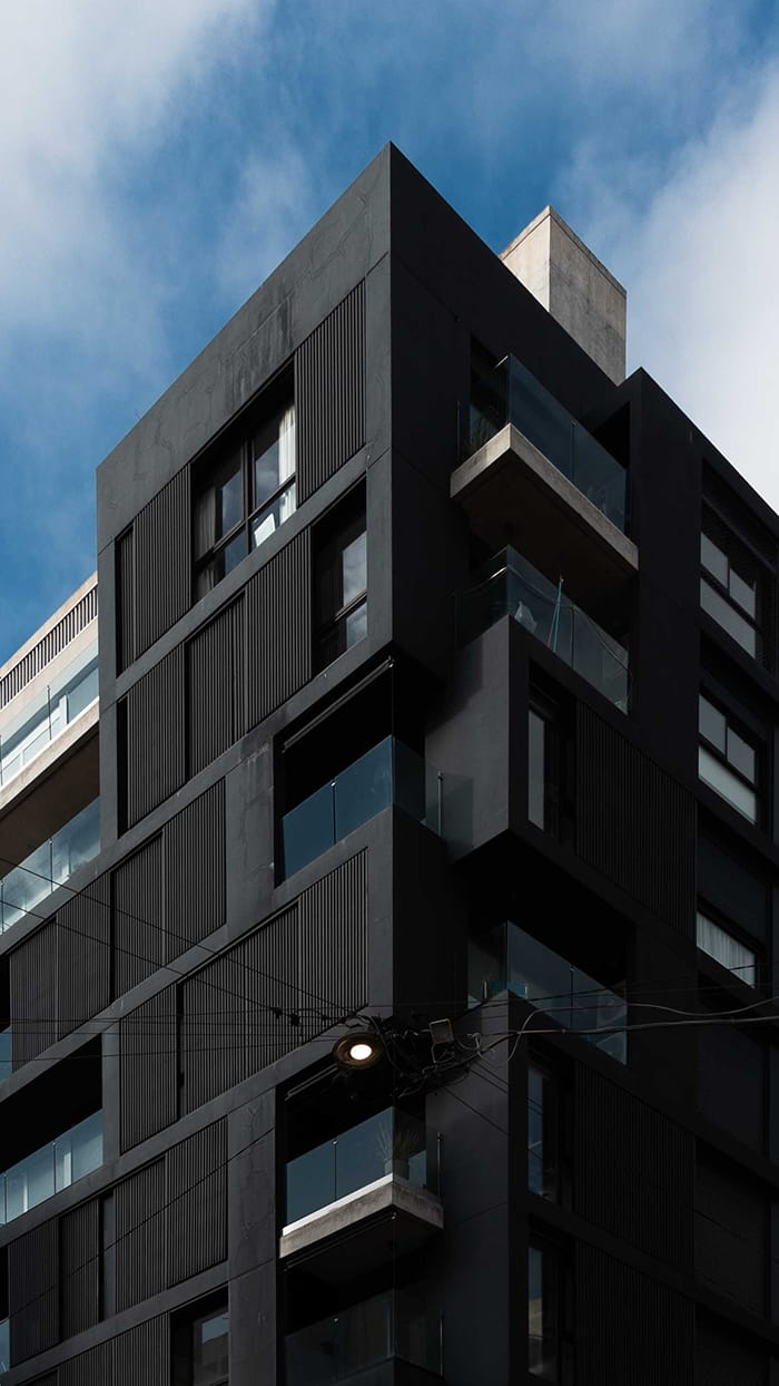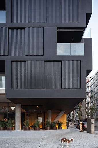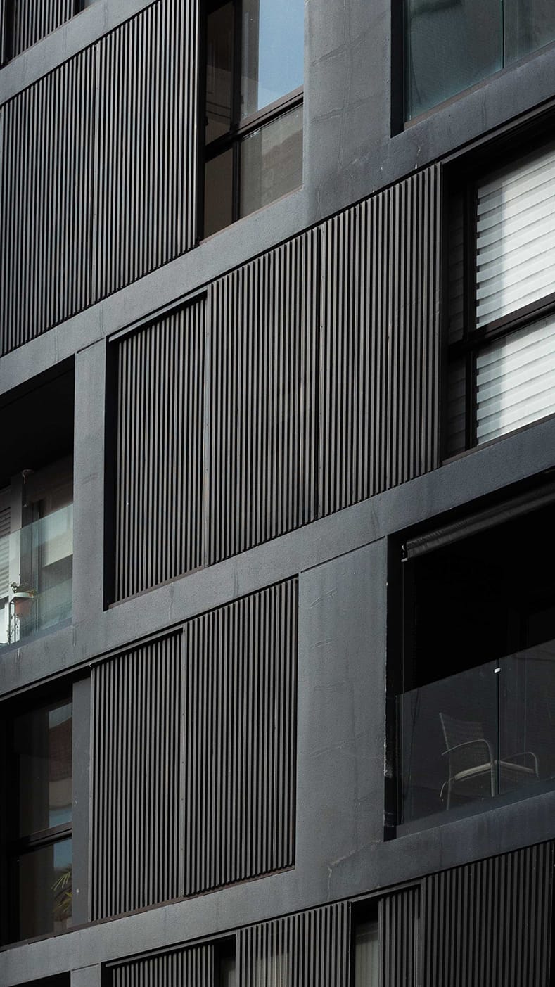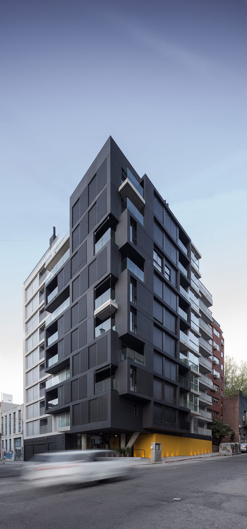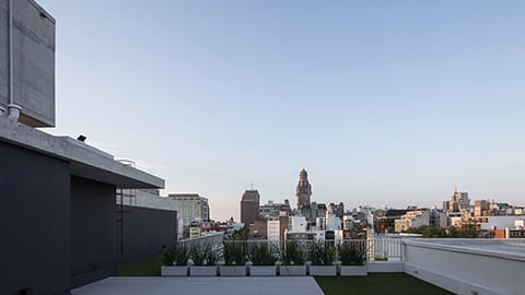 La propuesta asume la condición de predio en esquina y se inscribe en el marco normativo que la afecta. De esta forma, se plantea una pieza de fuerte presencia urbana, mediando entre las distintas situaciones linderas y la relación del edificio con la calle y la esquina. En este punto, el proyecto se distingue por su singular resolución volumétrica, con una suerte de apilamiento transescalar que se apodera y cambia la arista de la esquina por una resolución de encastre tipo «finger joint».
