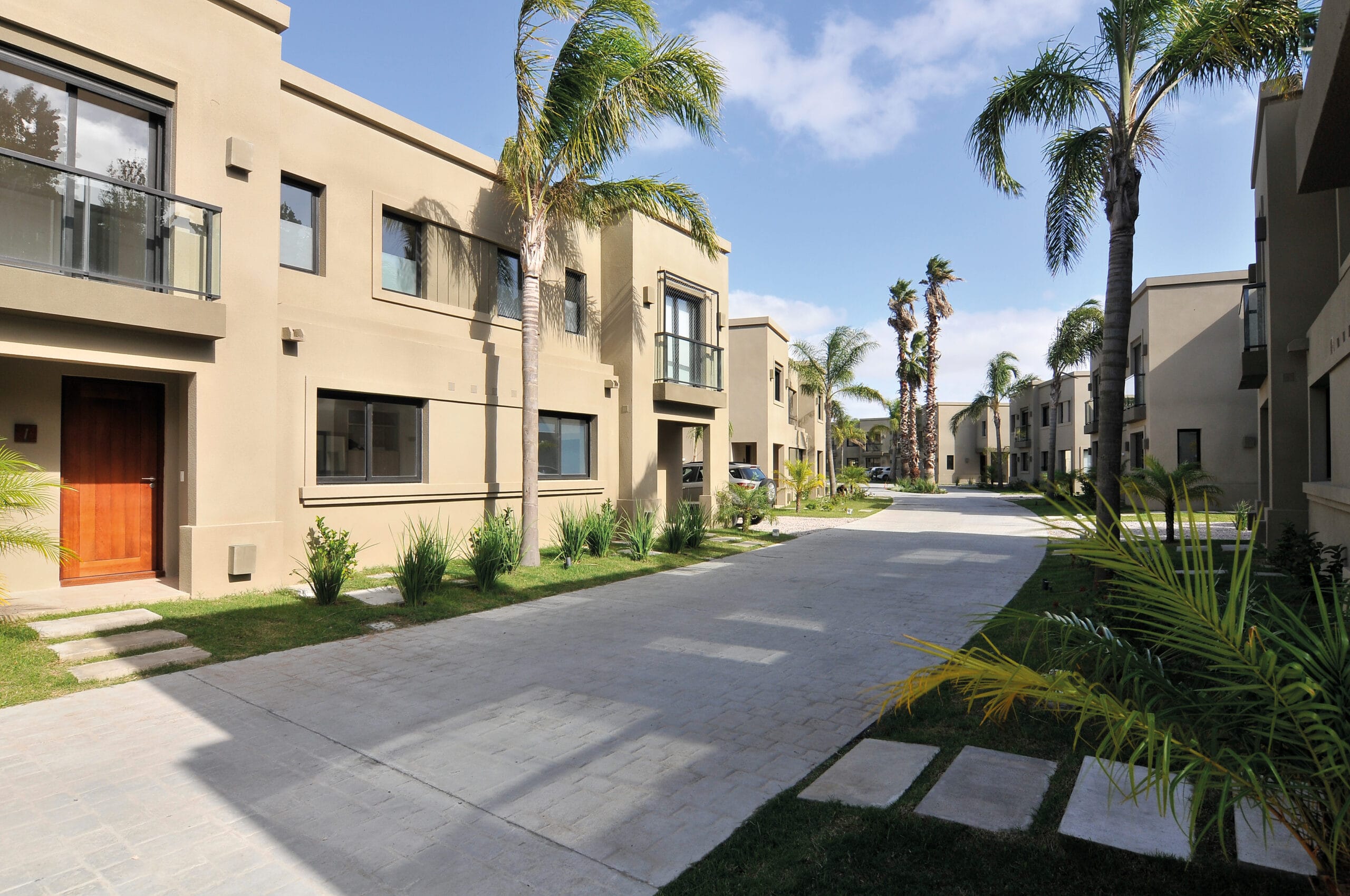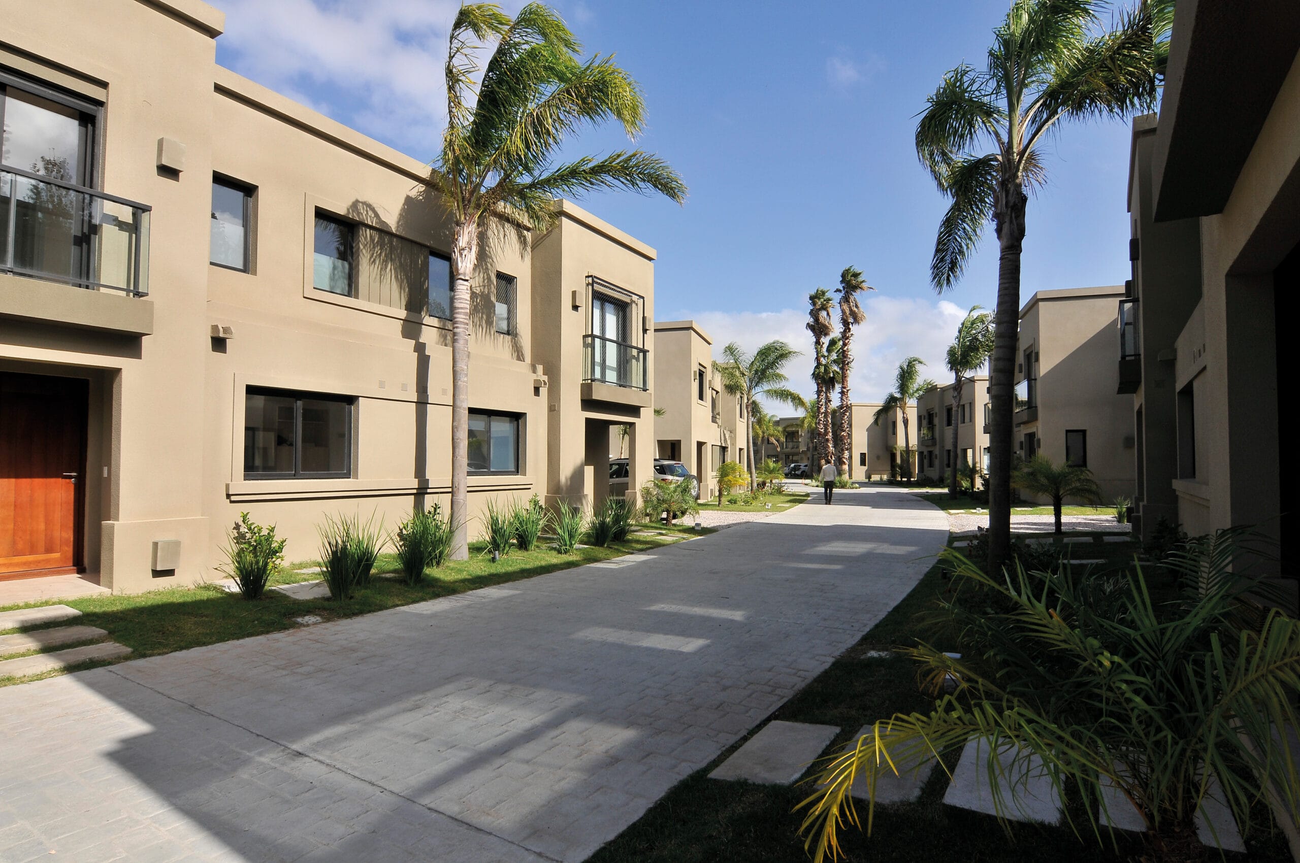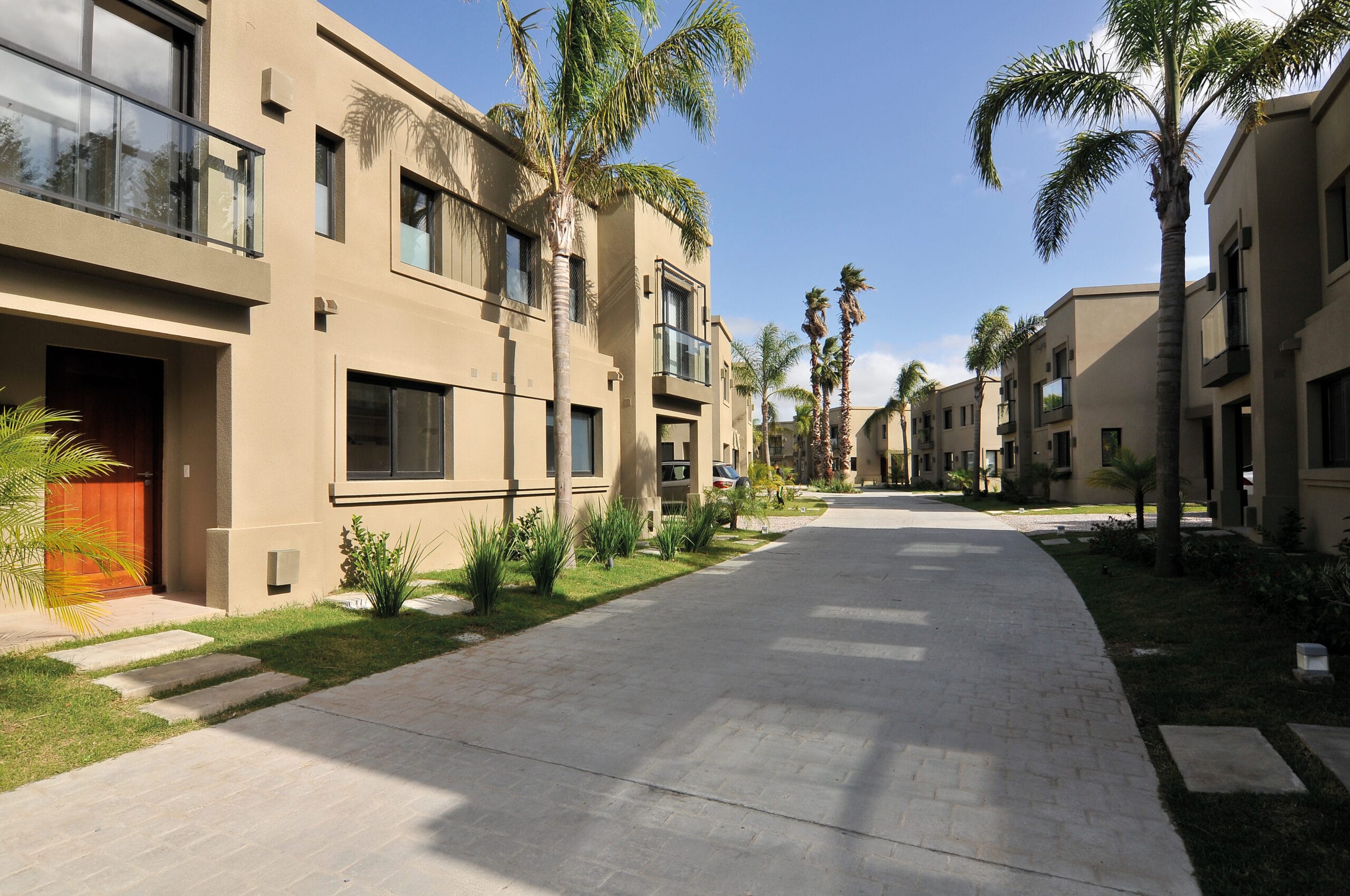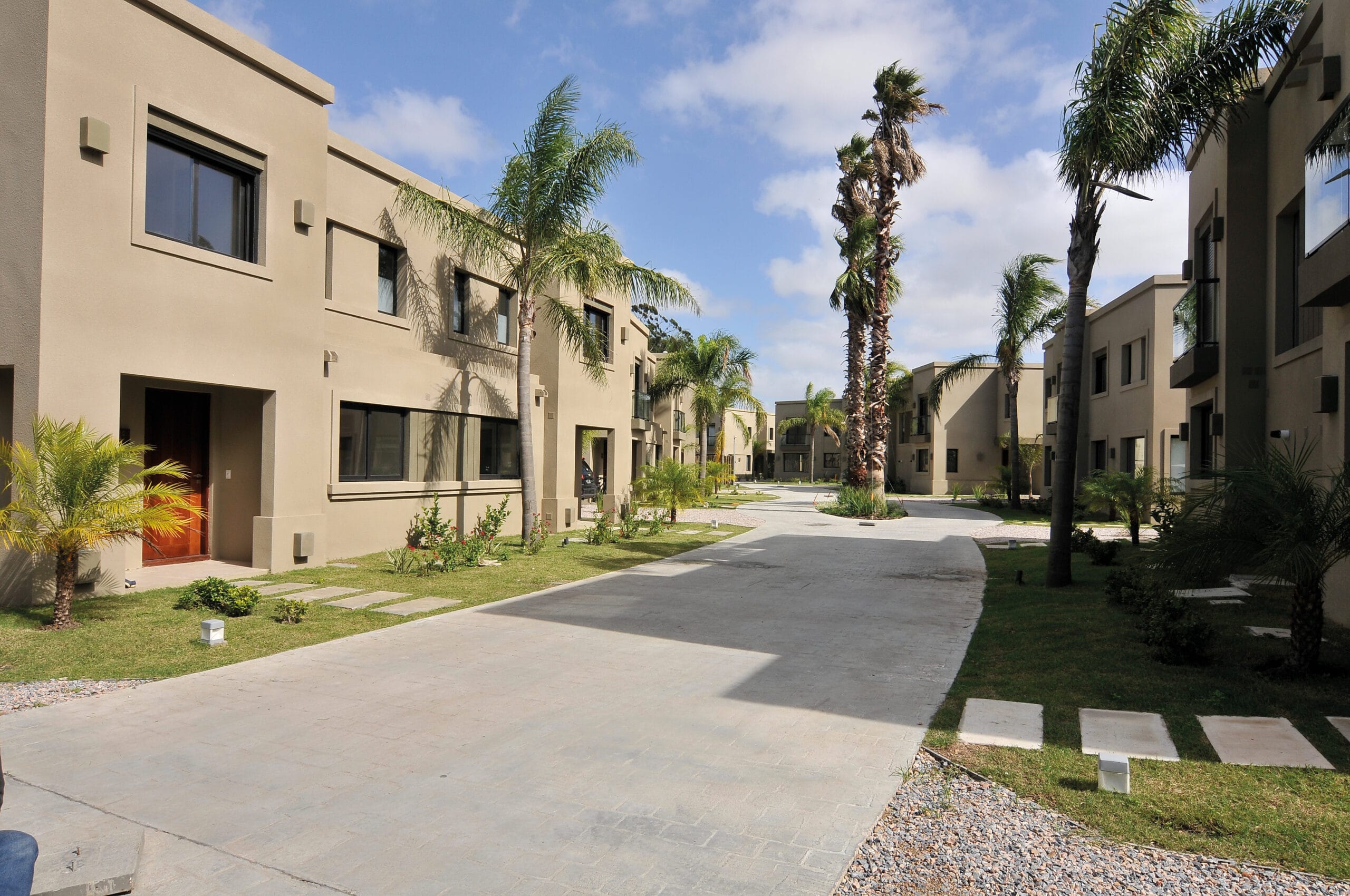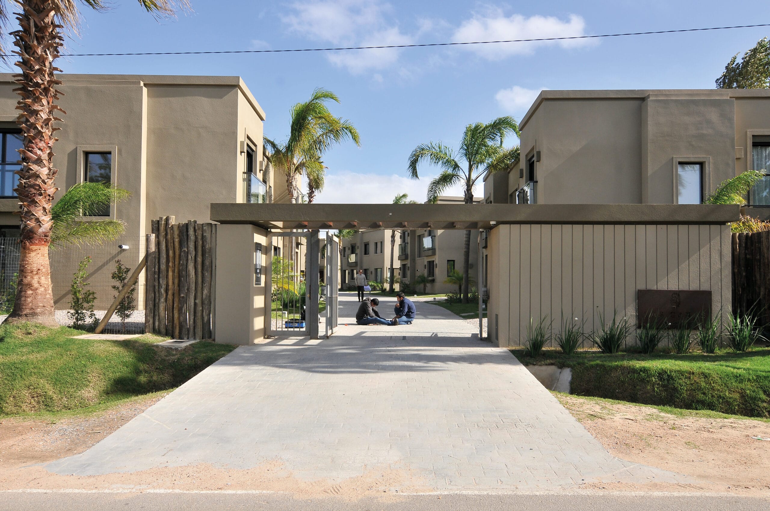 La ubicación y disposición física del terreno los animó a concebir un ámbito cerrado, dentro del cual generaron un conjunto de casas apareadas. La distribución de los bloques, diez en total, se solucionó al partir en dos el terreno y generar una gran calle central que distribuye y organiza los lotes. El resultado es que esa gran calle revestida en piedra adoquín genera una suave pero marcada curva que propone un trazado muy británico para esta pequeña urbanización. La disposición de los bloques mantiene un ángulo que enriquece el paseo.