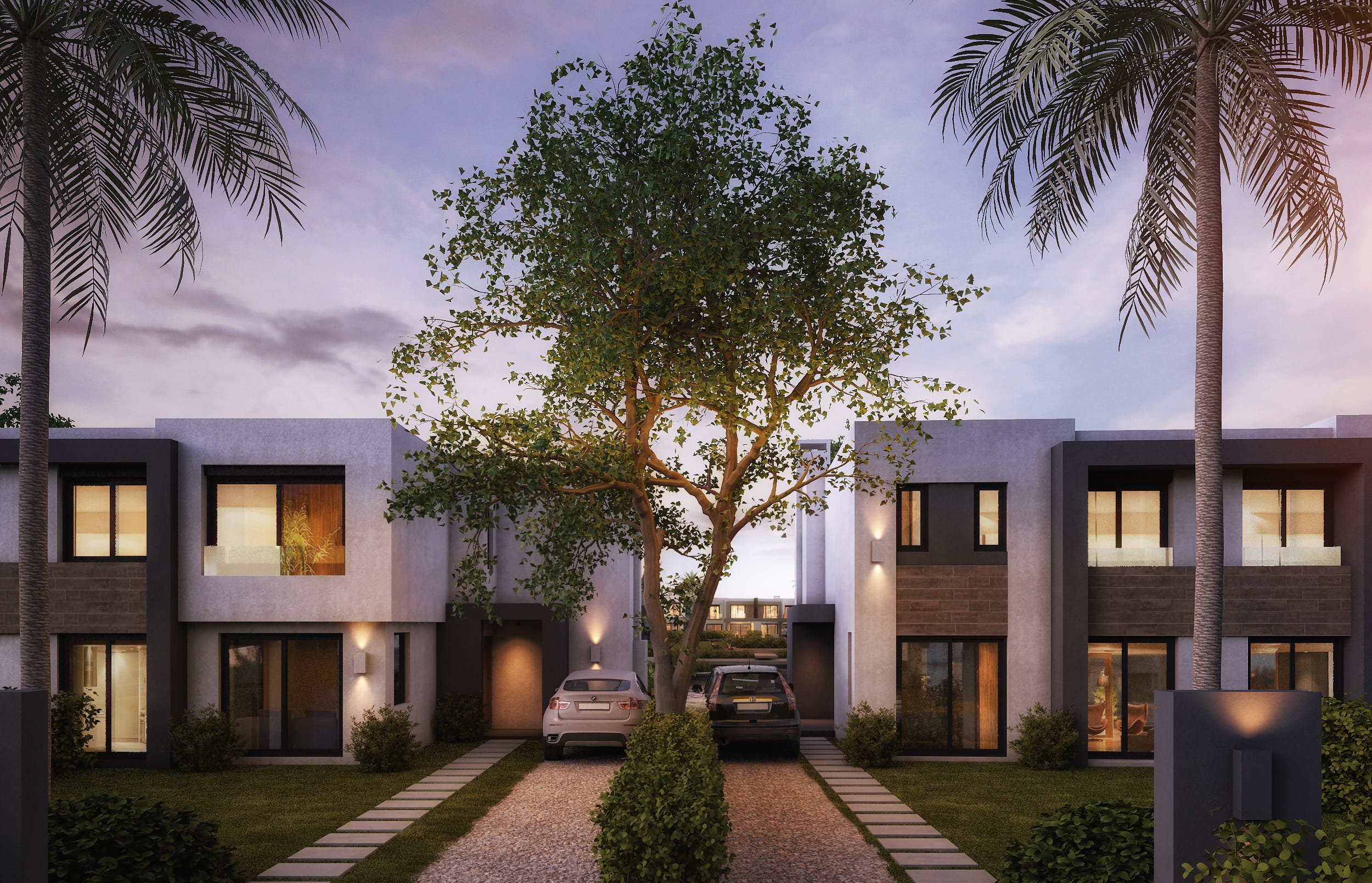 El conjunto está conformado por trece casas agrupadas en pares y con suficiente espacio de separación entre cada unidad. La implantación garantiza un óptimo asoleamiento y una abundante presencia vegetal. Así, cada casa cuenta con retiro frontal, cochera y jardín posterior de uso exclusivo.