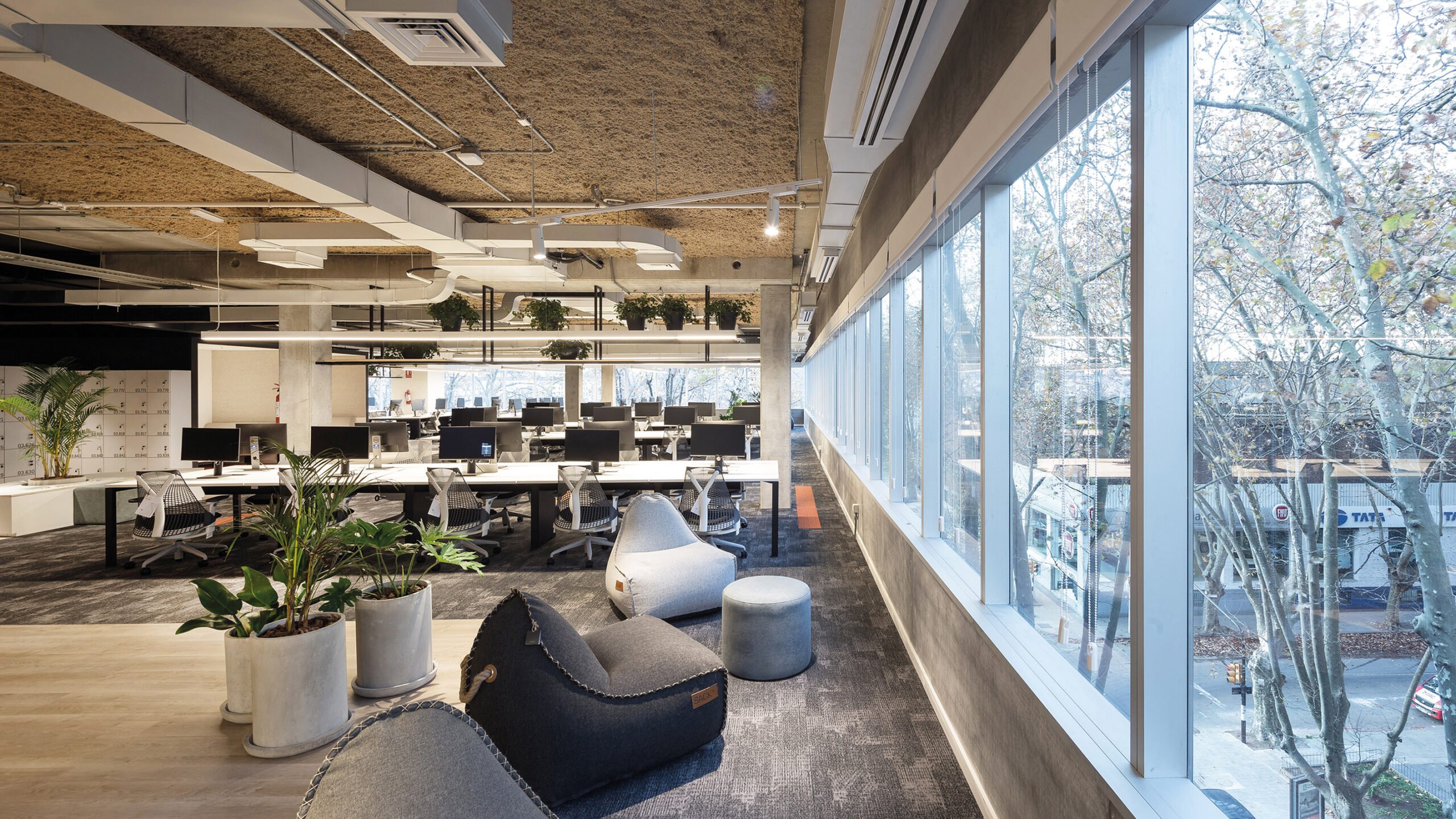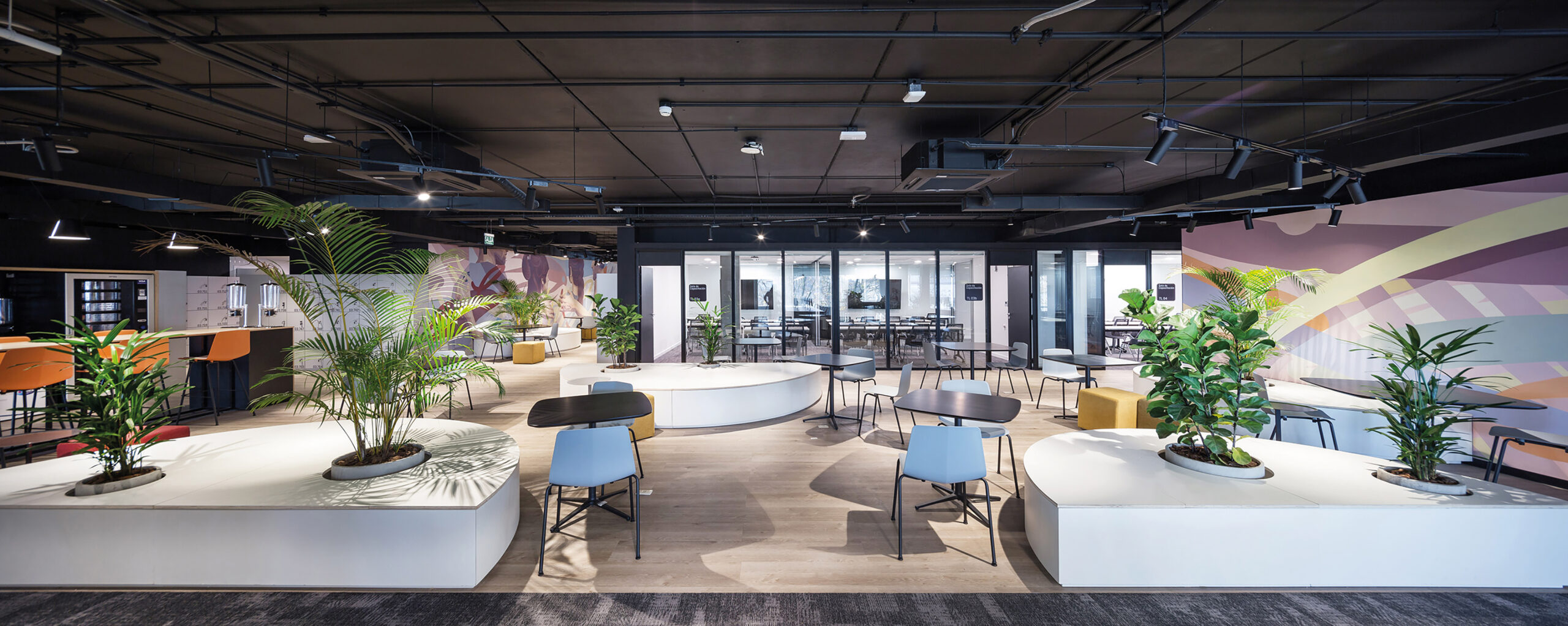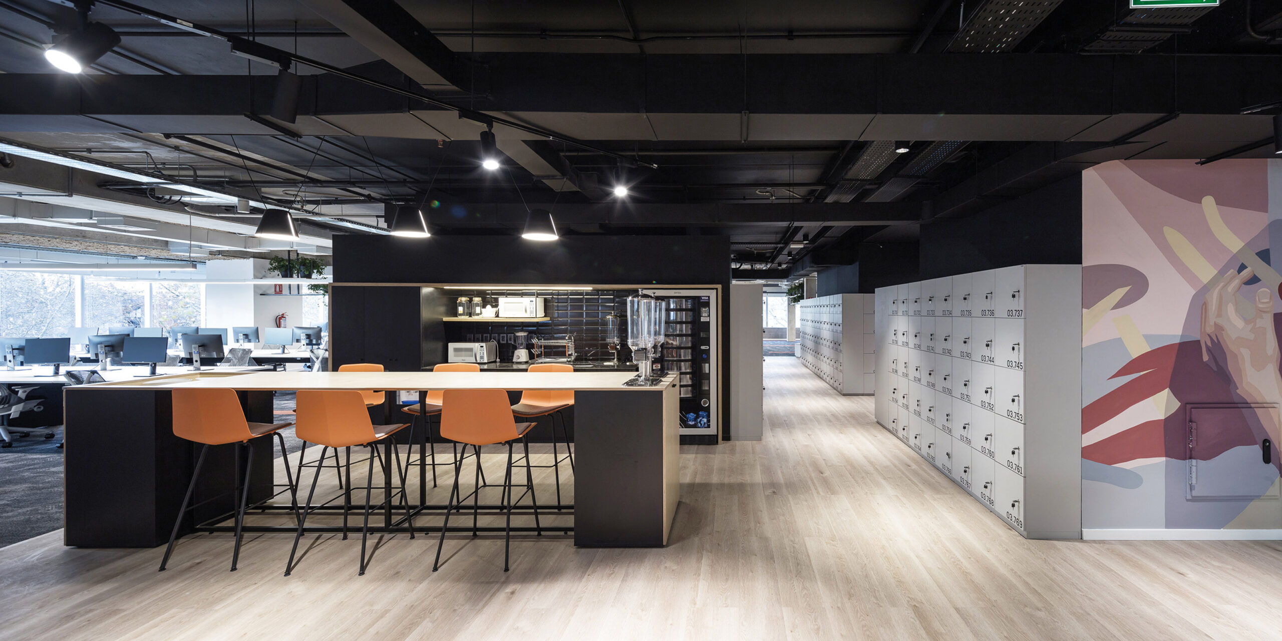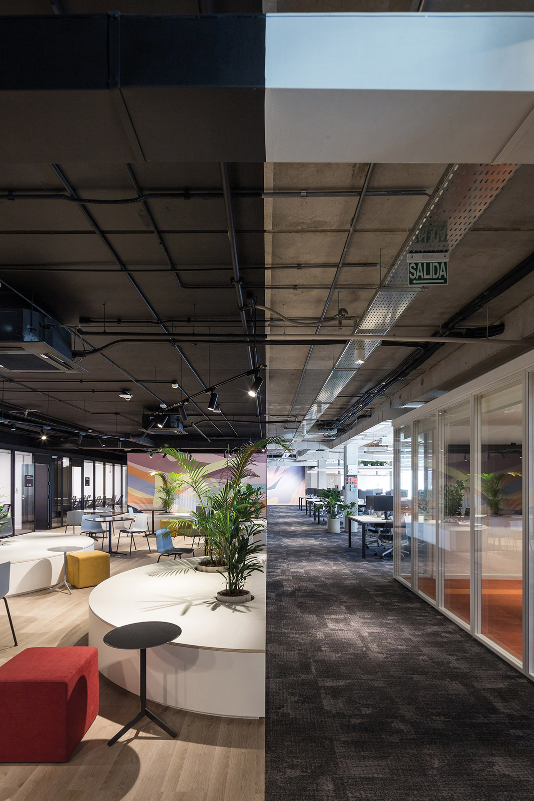 A diferencia de los lugares de trabajo tradicionales, la paleta de color se manejó de manera consciente y creativa al mismo tiempo que se utilizaron materiales novedosos, alcanzando espacios de fuerte expresividad. La incorporación de vegetación y la integración de murales artísticos dentro de la oficina apuntan a la urbanización del espacio de trabajo, generando una atmosfera distendida y brindando ambientes que evoquen comodidad y bienestar para los colaboradores.