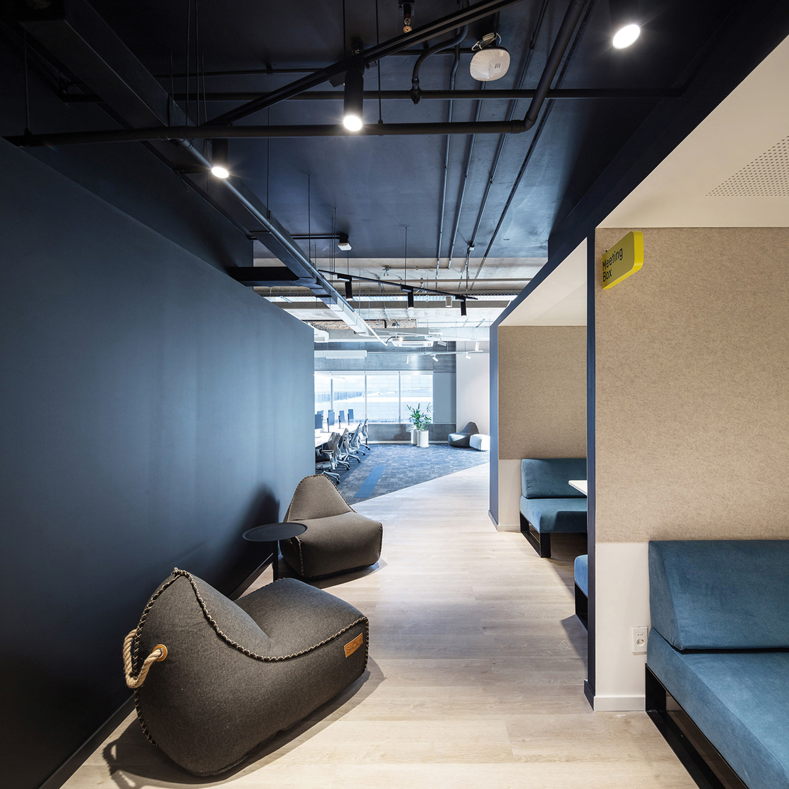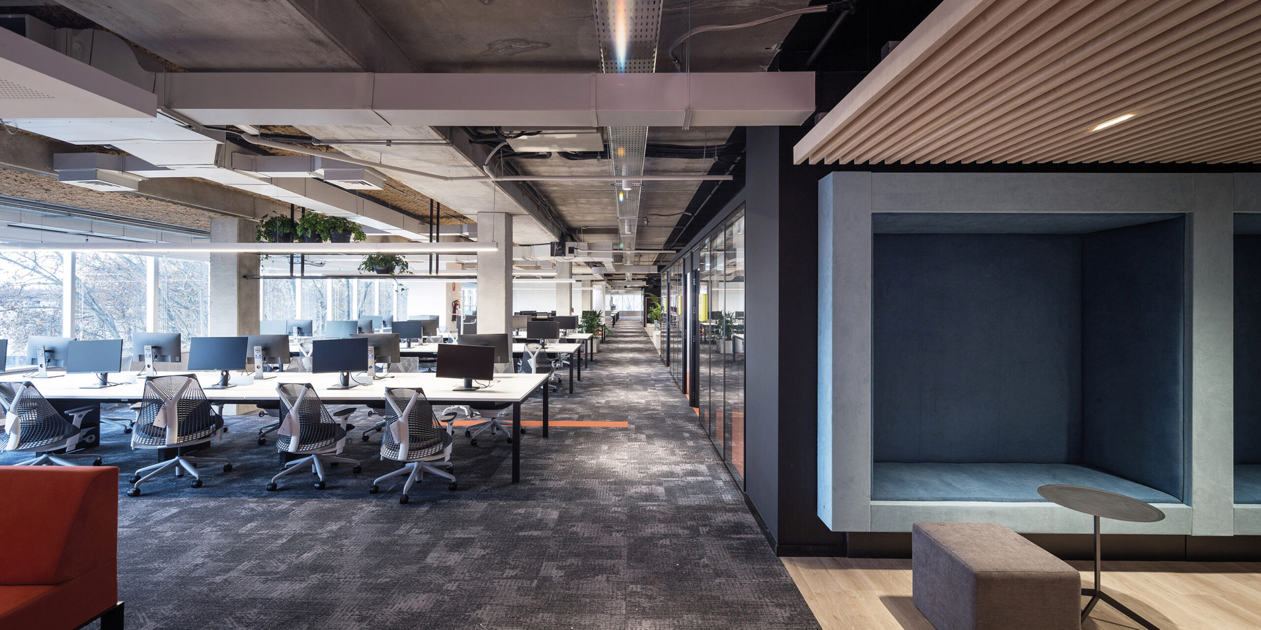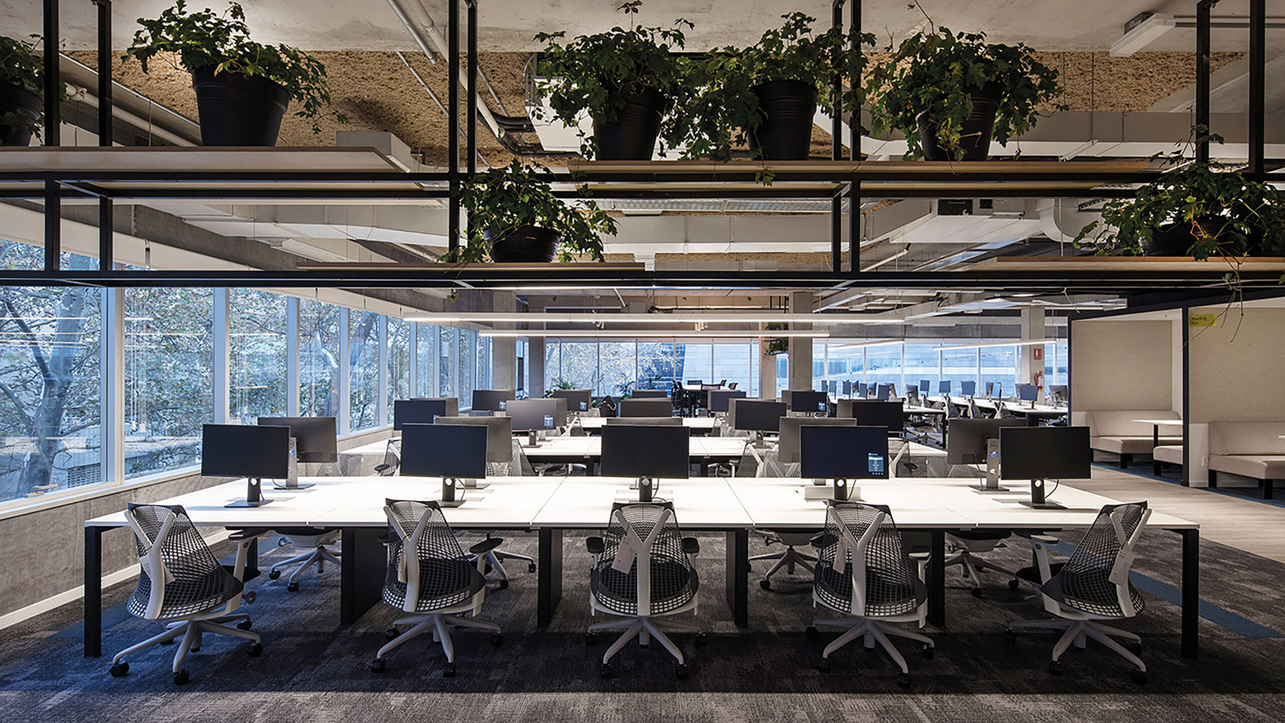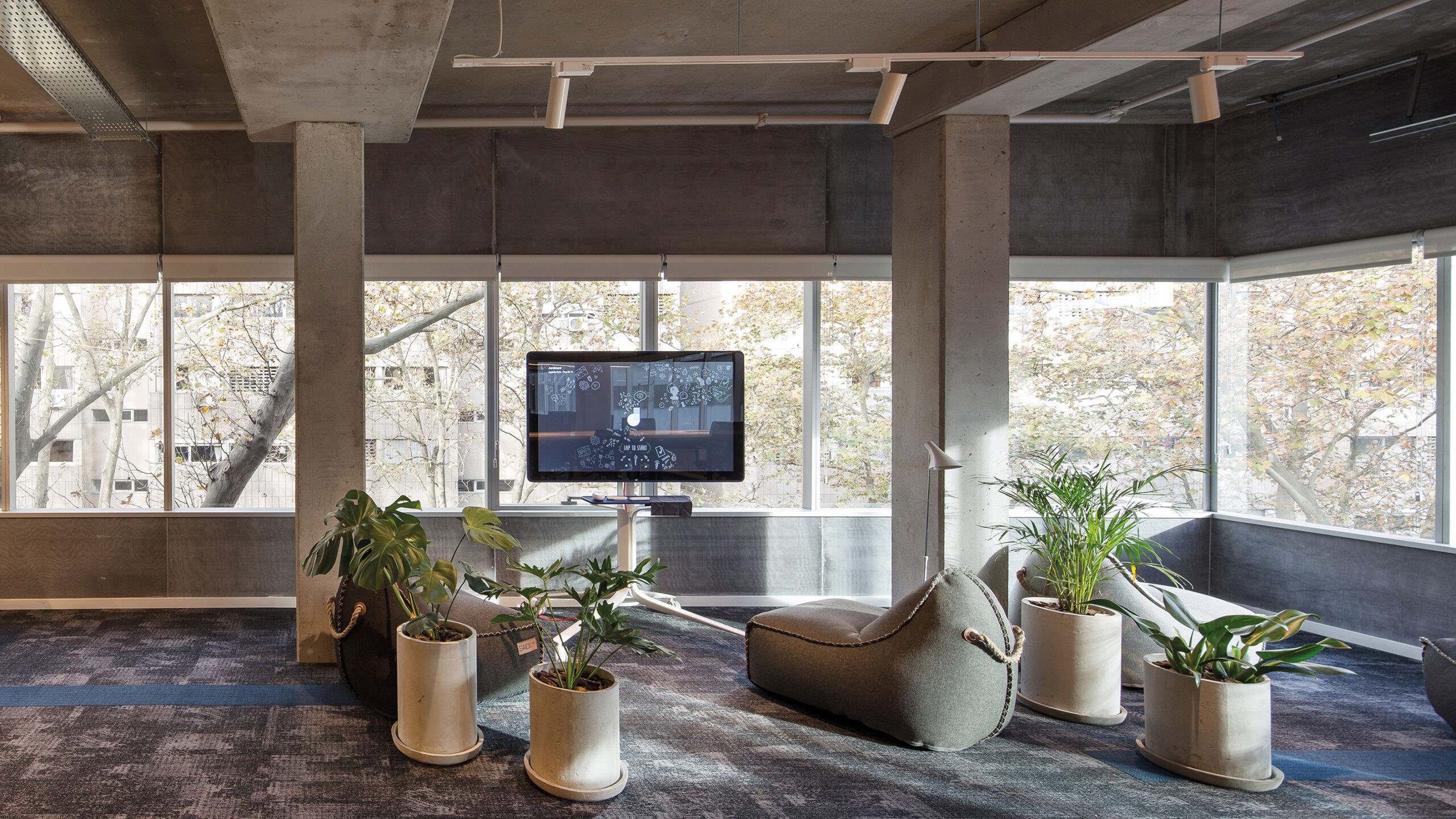 A diferencia de los lugares de trabajo tradicionales, la paleta de color se manejó de manera consciente y creativa al mismo tiempo que se utilizaron materiales novedosos, alcanzando espacios de fuerte expresividad. La incorporación de vegetación y la integración de murales artísticos dentro de la oficina apuntan a la urbanización del espacio de trabajo, generando una atmosfera distendida y brindando ambientes que evoquen comodidad y bienestar para los colaboradores.