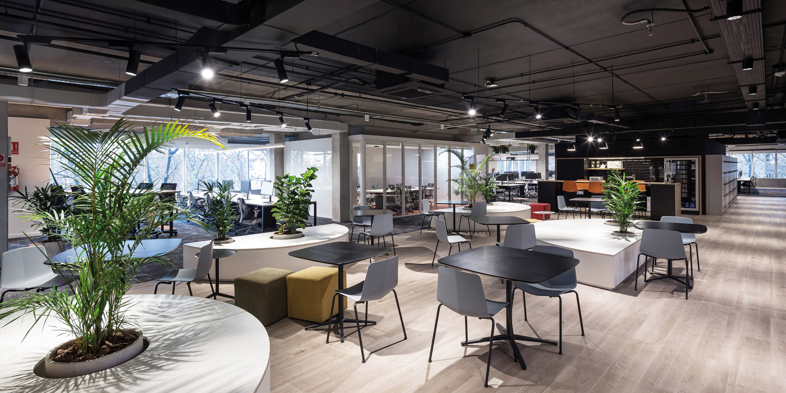 El proyecto se articula entorno a una zona de plaza, de fácil acceso, que actúa como el “backbone” del proyecto y aloja diferentes sectores denominados Coffee Points como nutrientes de los espacios de recreación que alberga esta plaza. Están compuestos por un área que presta servicios y una superficie adyacente que no sólo le permite al colaborador tener un ámbito de trabajo más relajado y descontracturado, sino que también, una mayor interacción con sus pares. La plaza se identifica y resalta por su look and feel cálido y doméstico, logrado a partir del tipo de texturas y colores seleccionadas, el negro de su cielorraso y los coloridos murales artísticos representan la urbanidad que caracteriza el espíritu de esta plaza. Además, el equipamiento es un elemento clave para acentuar y reforzar el contraste con la zona de trabajo: los asientos-maceteros blancos con forma de semicírculo enmarcan la plaza y el equipamiento móvil apunta a la flexibilidad del espacio.