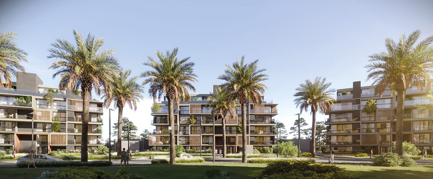 La severidad proyectual, que prevé absolutamente todo desde el primer movimiento de tierra, se ha concentrado en la preparación del terreno, que ya luce con su caminería central, una suerte de boulevard acompañado por palmeras, que recorre todo el predio de norte a sur, articulando los accesos a todas las estructuras previstas. A la vez los jardines ya están plantados y crecerán junto con la obra. Una gran plaza central enmarcada por la gran estructura desplegada en arco y concebida para usos mixtos, cuenta con una importante escultura de Diego Benites, que señala con énfasis la voluntad de DDC por apostar a la integración de las obras de arte a sus emprendimientos.