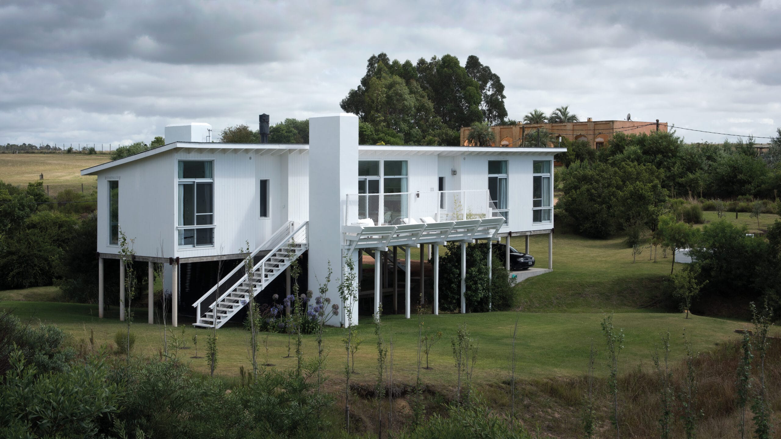 Hipnotizado por aquella frase se tomó el primer avión a Punta del Este en busca de un terreno. A seiscientos metros del mar, con vista al este y al oeste, encontró cuatro mil quinientos metros cuadrados con mucho desnivel, atravesados por una cañada o pequeño arroyo que serpentea a lo largo del terreno guiando la recolección del agua de lluvia que baja de los campos para desembocar en el océano Atlántico. Estas particularidades topográficas para muchos podrían resultar un escollo difícil de sortear, pero para este soñador se presentaron como una gran oportunidad para diseñar una casa que se levantara sobre pilotes.