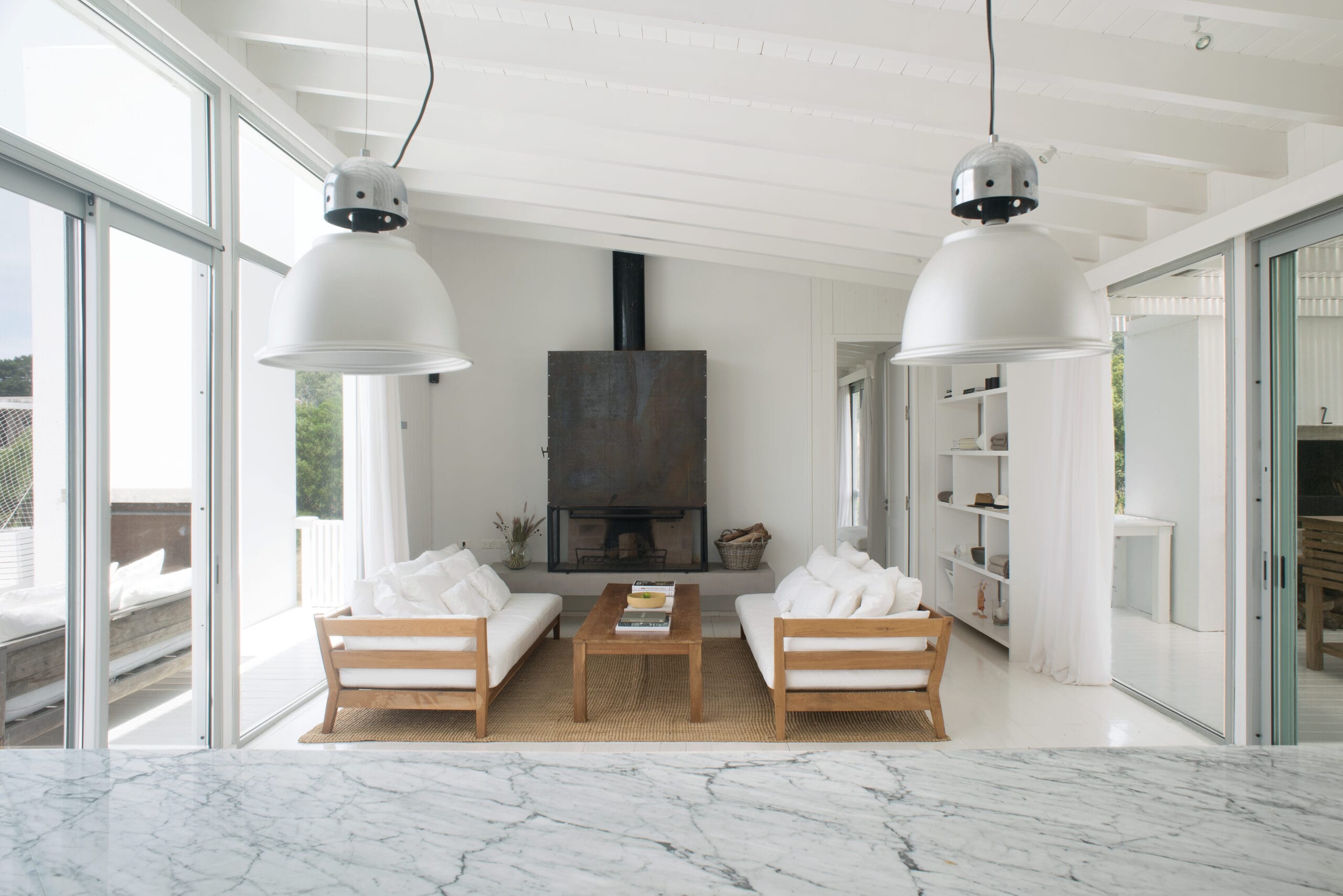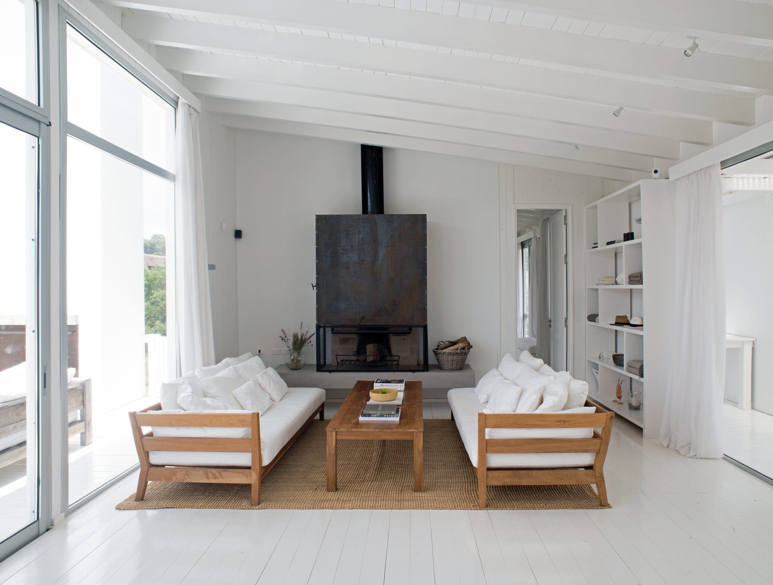 Este proyecto fue concebido para la construcción de una casa de playa, la elección de los materiales también. Las casas de verano pueden pasar mucho tiempo cerradas. Llegar, abrirlas y encontrar todo seco, sin ningún rastro de humedad, es solo posible eligiendo materiales no hidrófugos.  Losa de hormigón y paredes de material solo en los baños, siendo uno de ellos medianero con el muro de la estufa a leña interior, lo que le da enorme eficiencia en invierno.