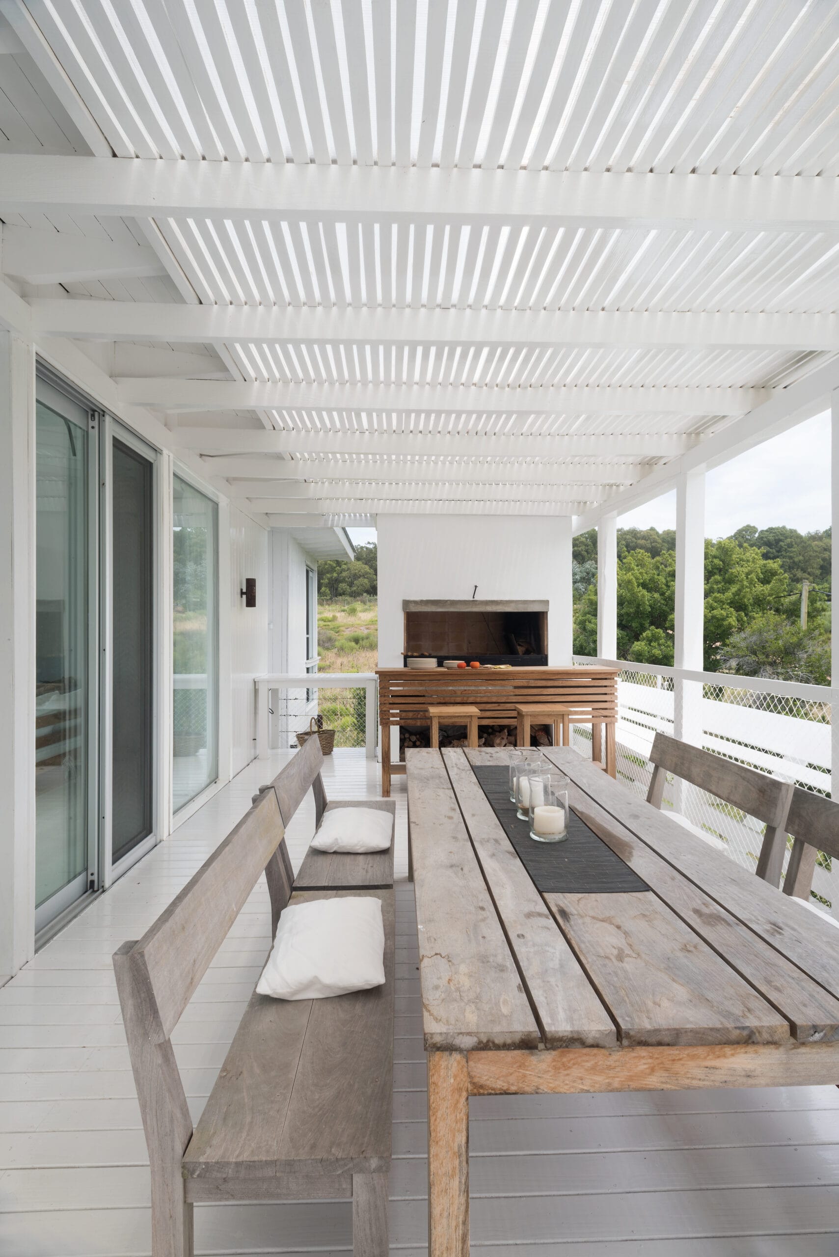 En el deck exterior se construyó una larga mesa en madera de lapacho, con bancos con respaldo diseñados para extender la sobremesa.