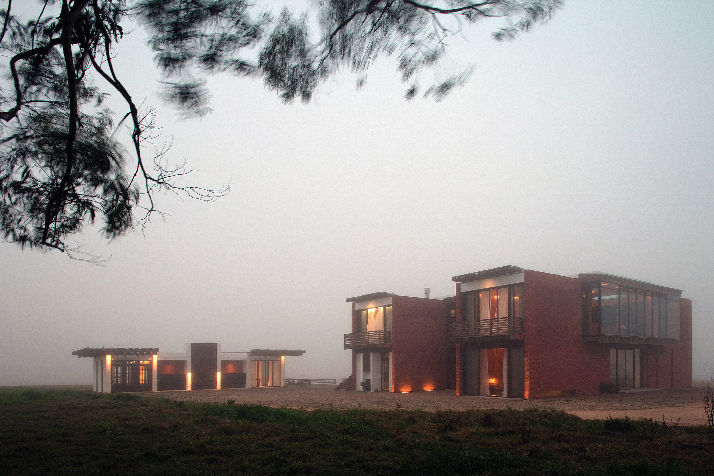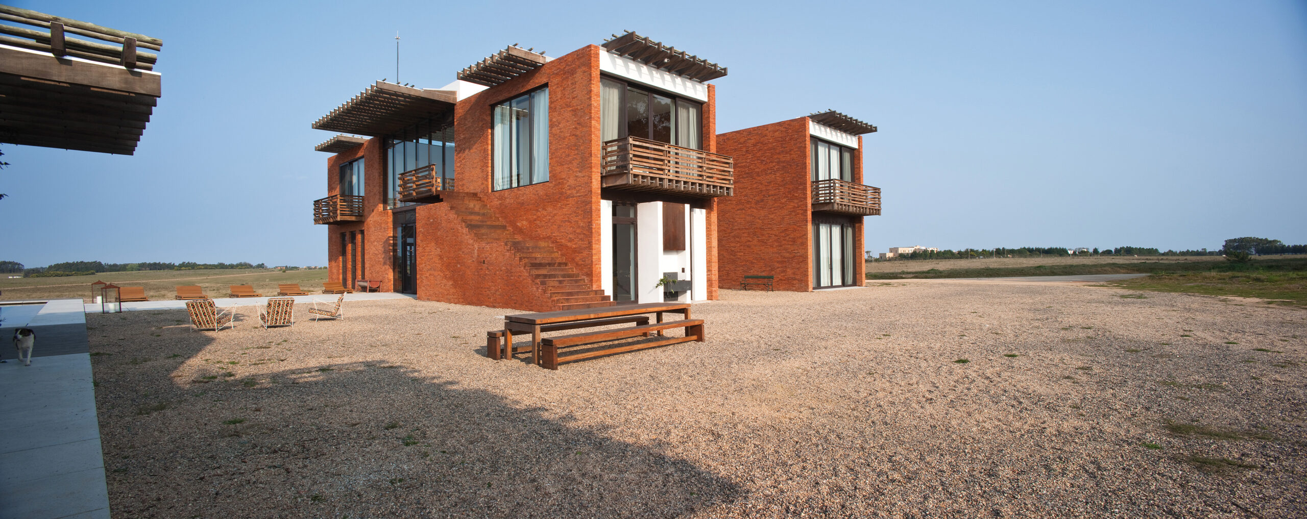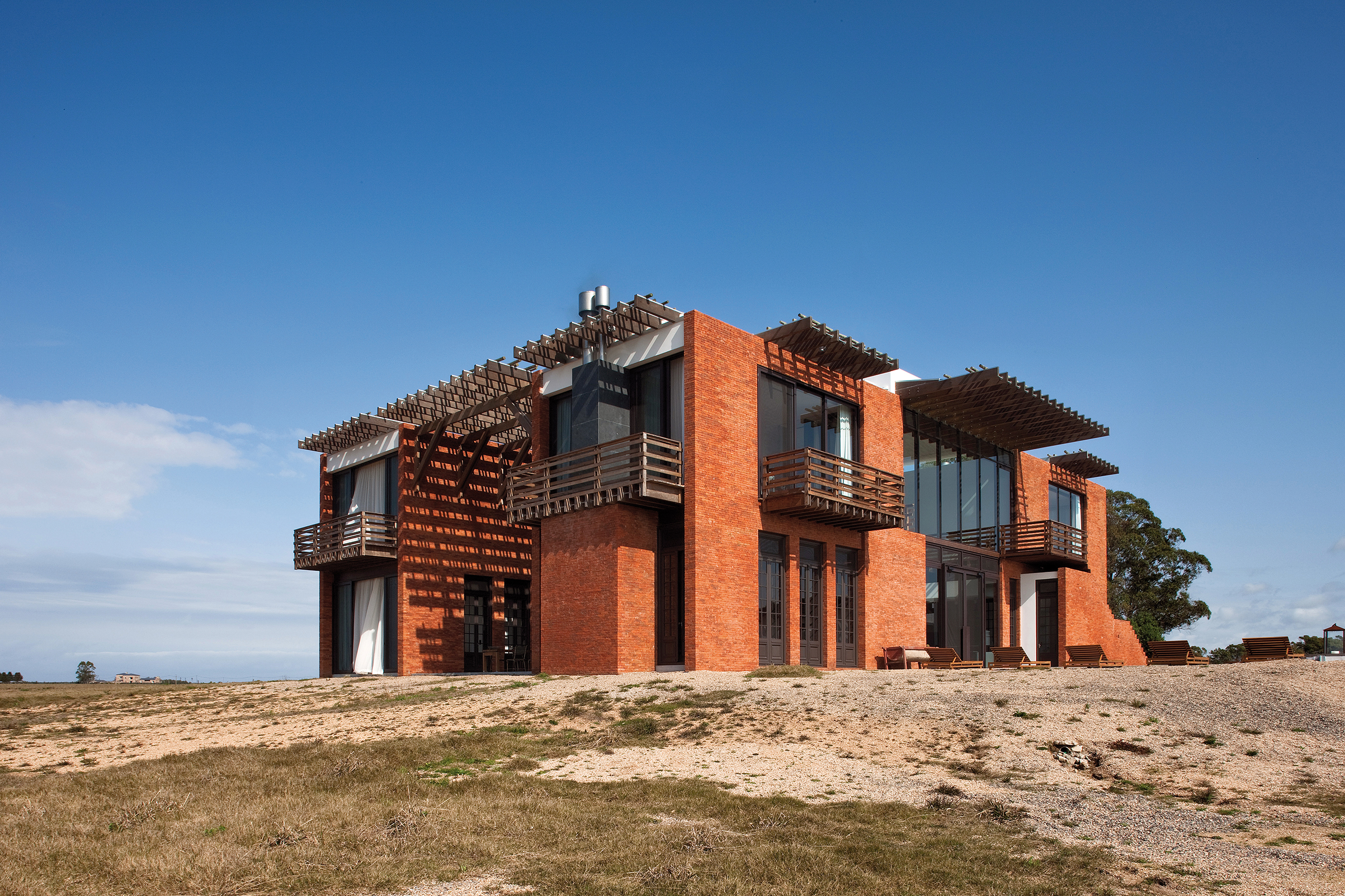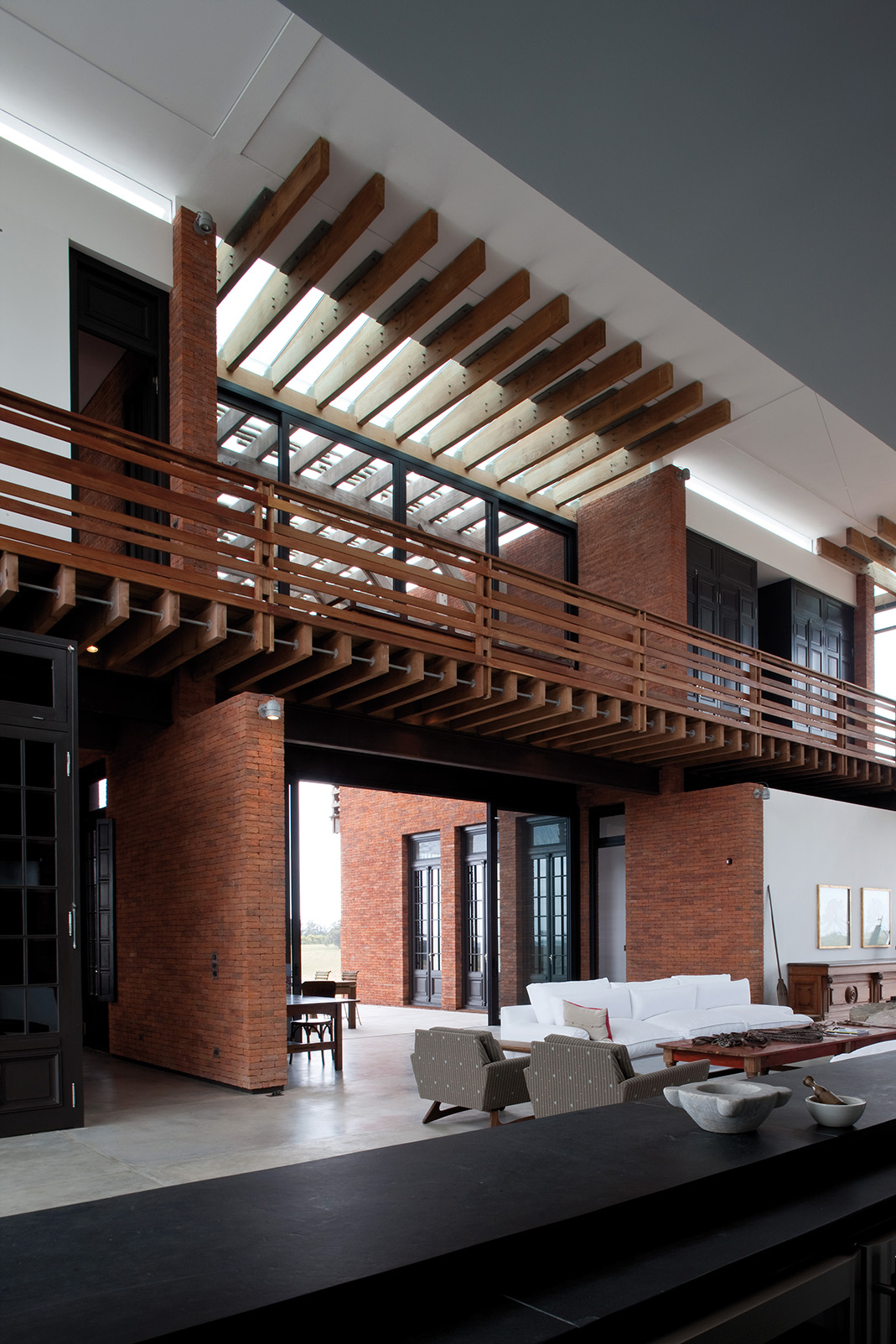 En la planta alta, un pasillo común en forma de U rodea la doble altura del living y conduce a las habitaciones. El pasillo flota sobre el vacío, lo que lo convierte en una verdadera pasarela a través de la cual se visualiza la planta baja. En sus dos ensanches, el pasillo configura espacios de permanencia desde donde contemplar el exterior que se filtra a través de las envolventes vidriadas. Cada uno de los extremos de los dos bloques da lugar a impresionantes suites. Estas, además disfrutar de generosas áreas, poseen amplias vistas sobre el paisaje.