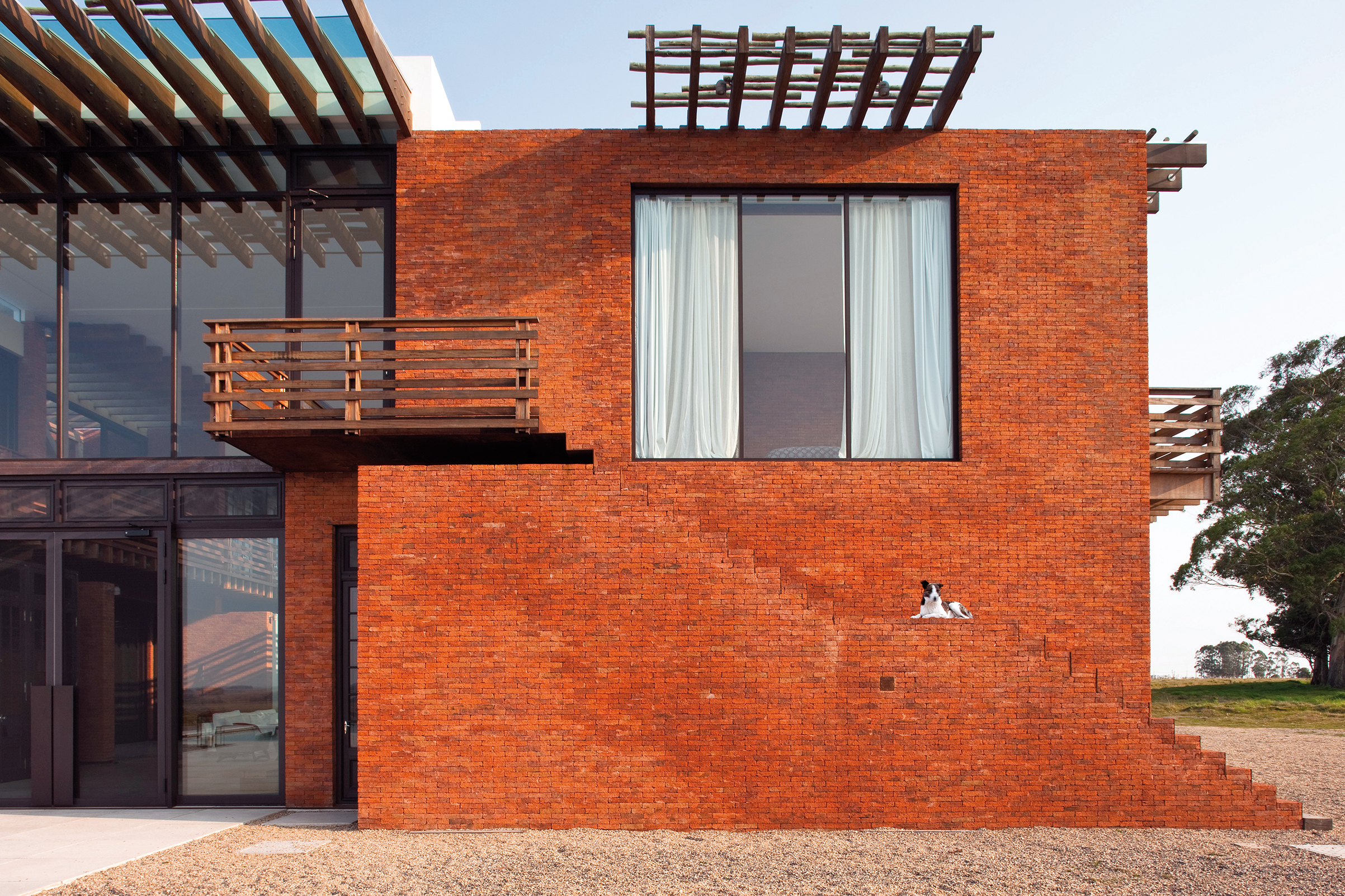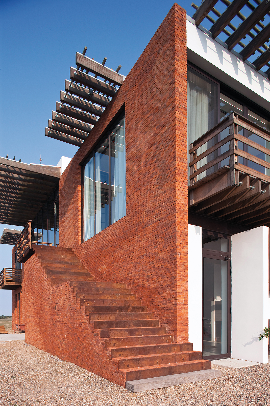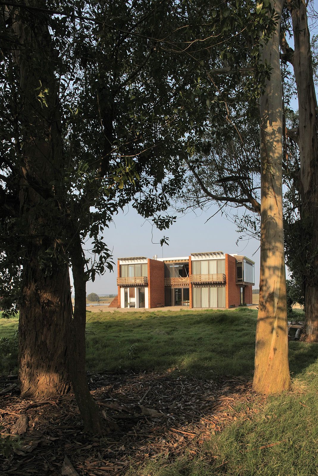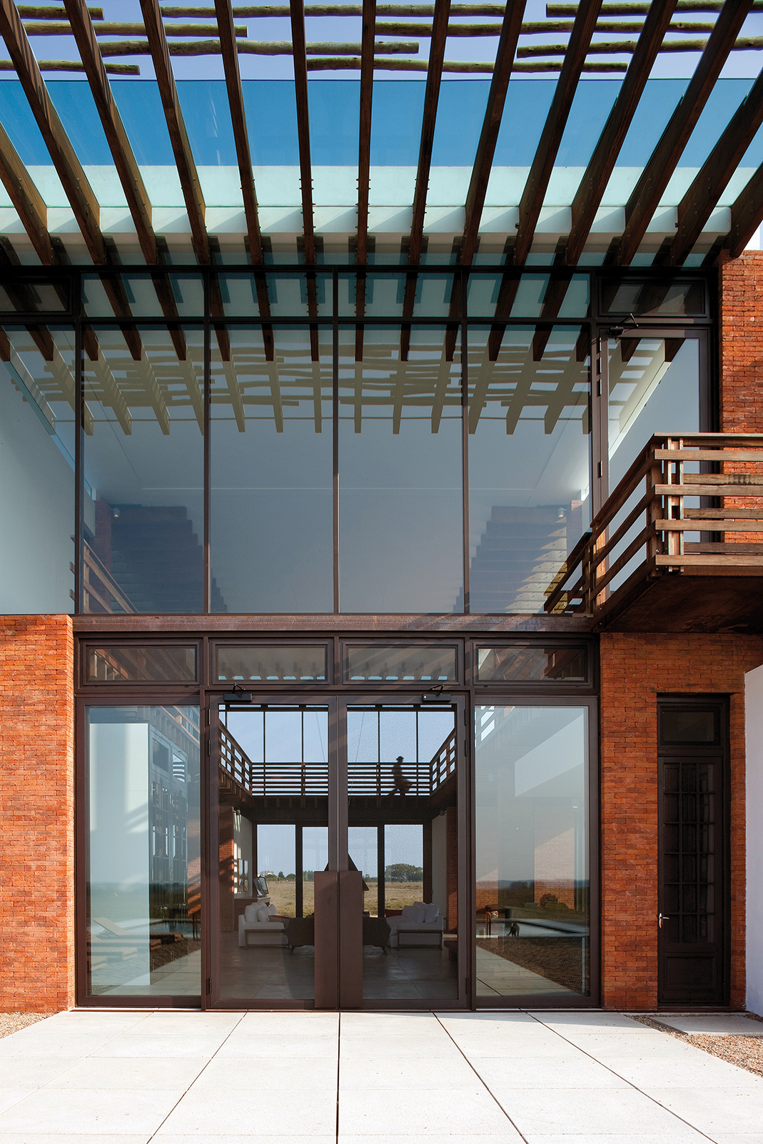 En la planta alta, un pasillo común en forma de U rodea la doble altura del living y conduce a las habitaciones. El pasillo flota sobre el vacío, lo que lo convierte en una verdadera pasarela a través de la cual se visualiza la planta baja. En sus dos ensanches, el pasillo configura espacios de permanencia desde donde contemplar el exterior que se filtra a través de las envolventes vidriadas. Cada uno de los extremos de los dos bloques da lugar a impresionantes suites. Estas, además disfrutar de generosas áreas, poseen amplias vistas sobre el paisaje.