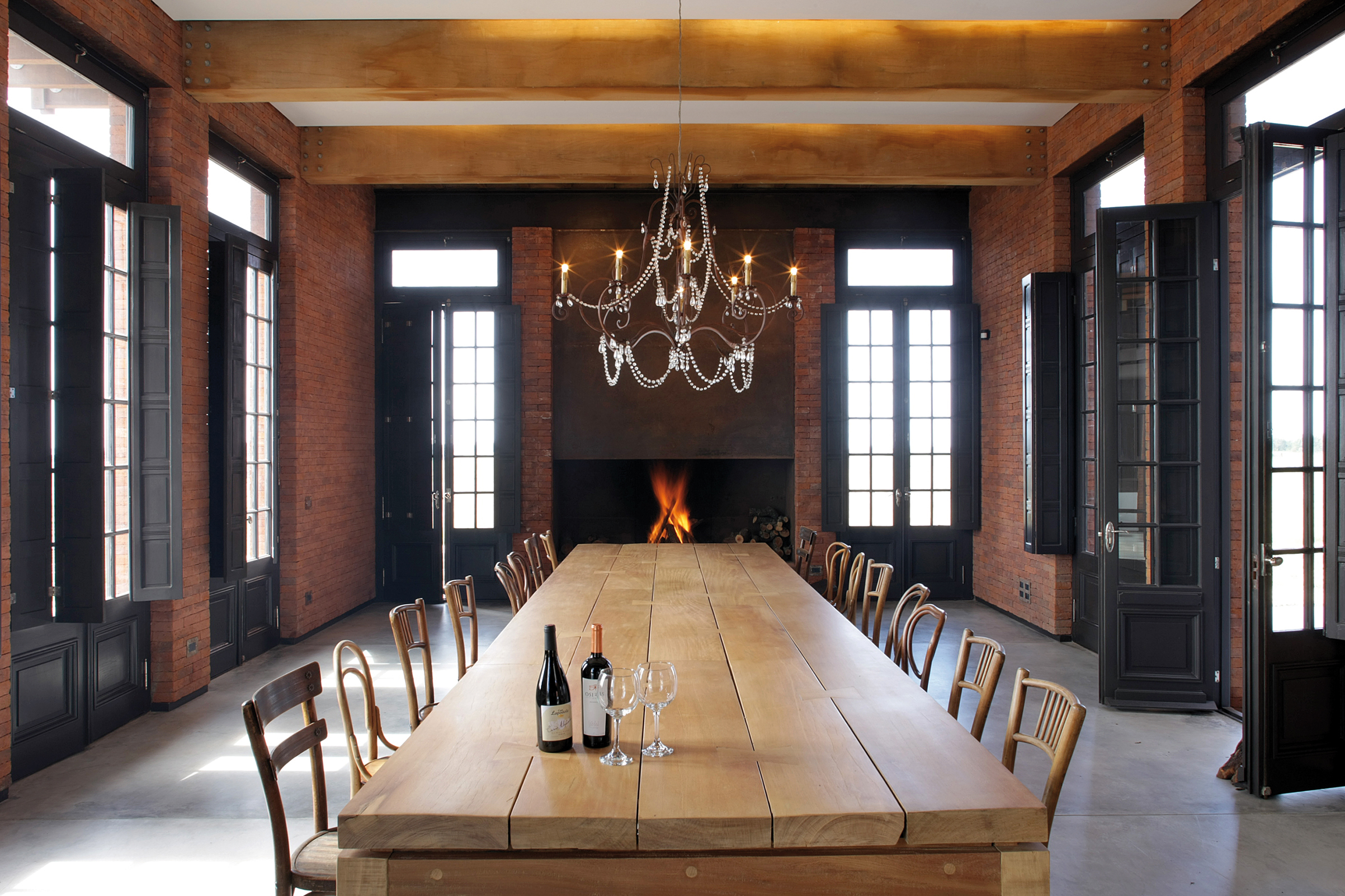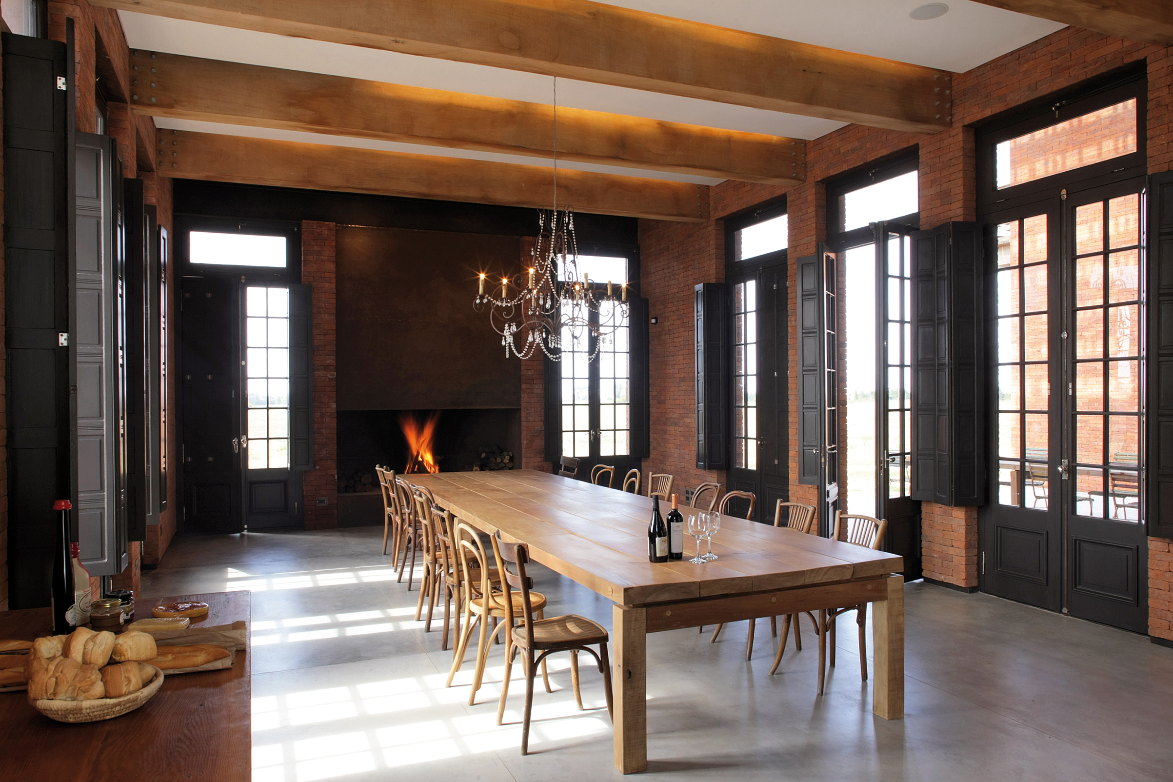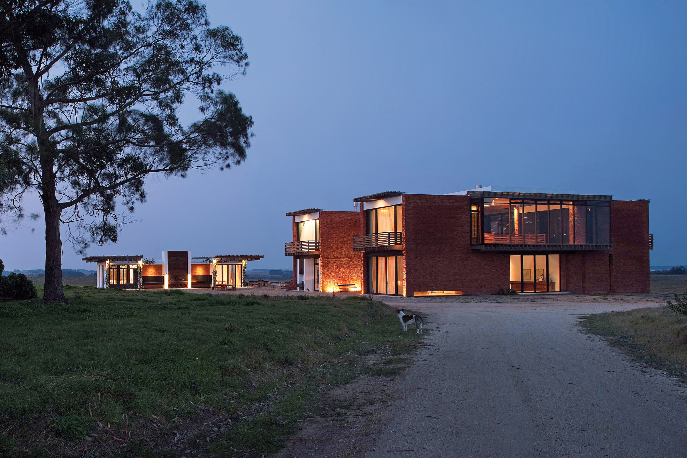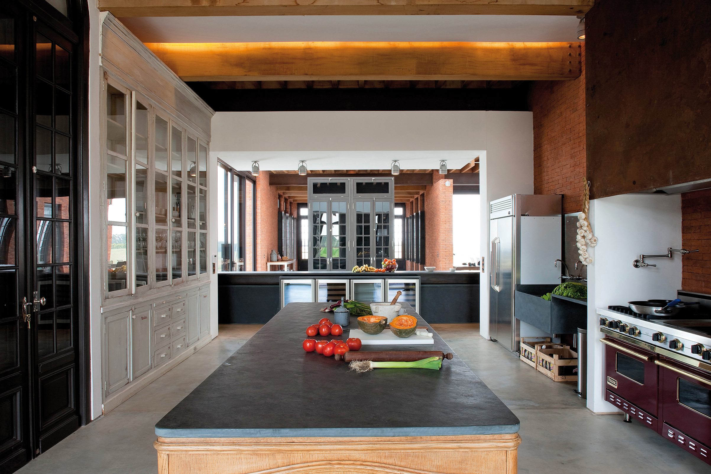 Cruzando el living, un segundo eje atraviesa los dos bloques distribuyendo la circulación hacia los demás espacios que completan el programa de planta baja: cuarto de huéspedes, oficina, un gran comedor con capacidad para 20 comensales y la generosa cocina que le sirve. Este segundo eje se extiende más allá de la casa para conducir a la piscina y la terraza.