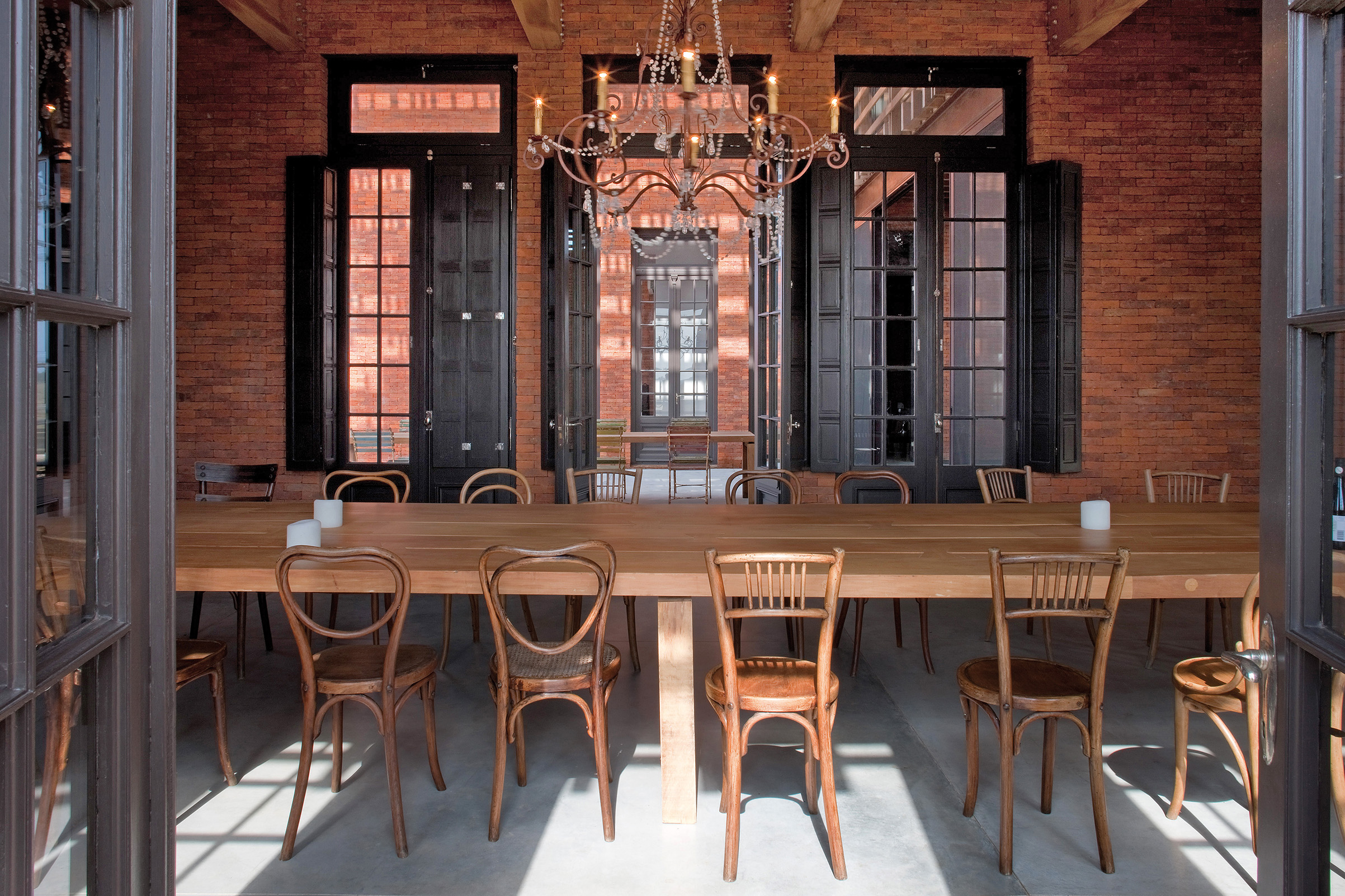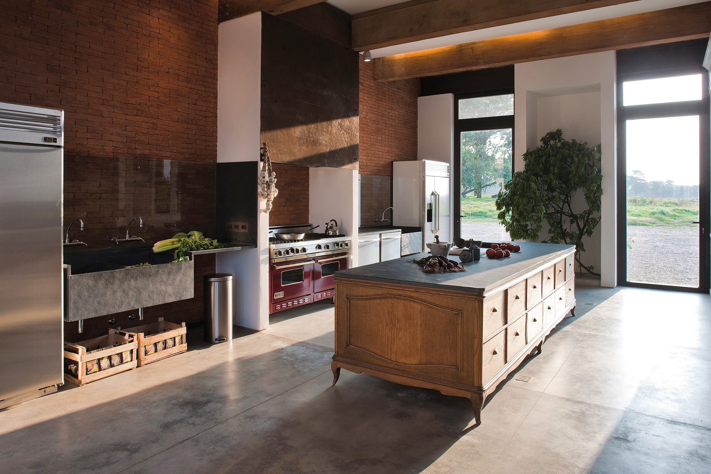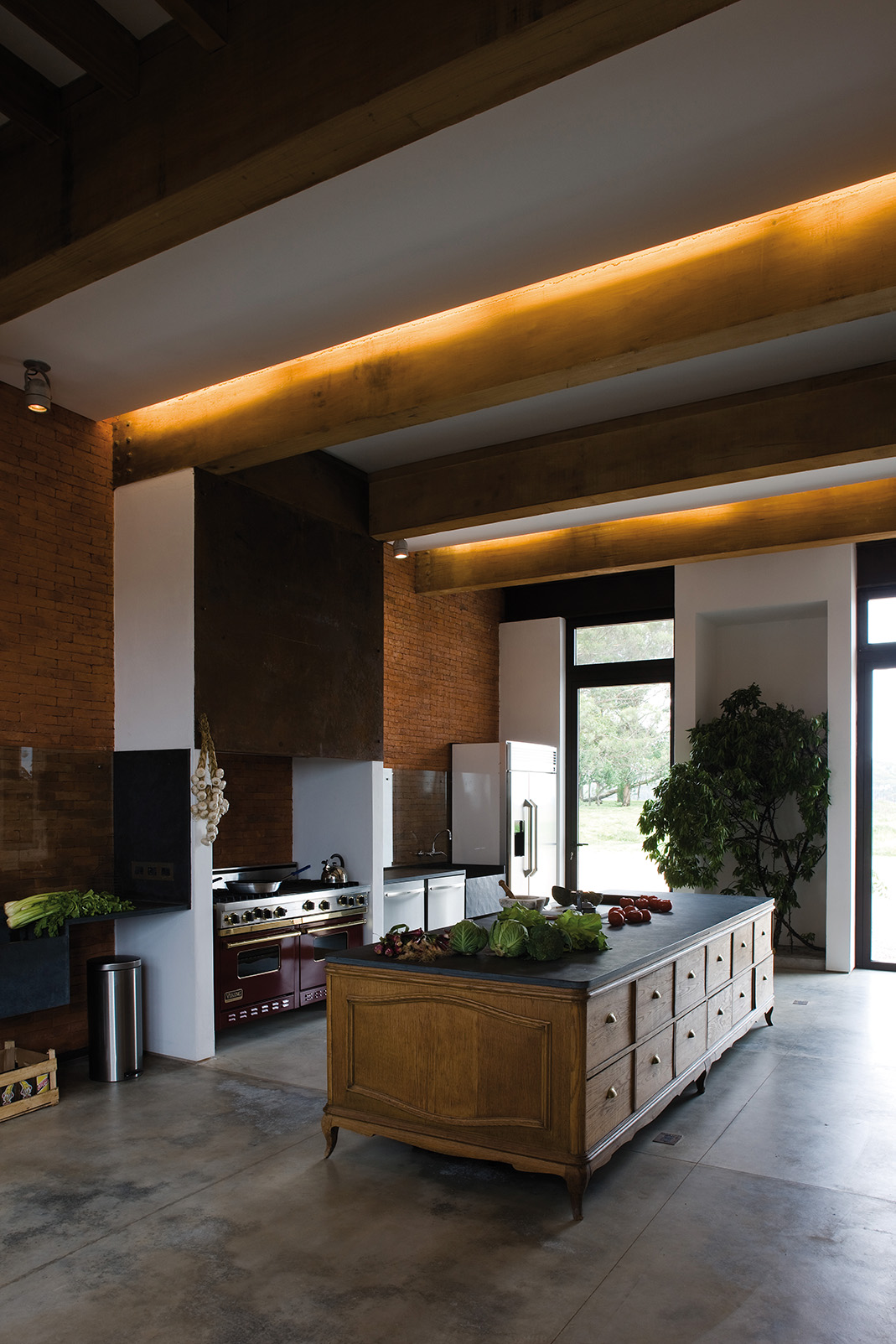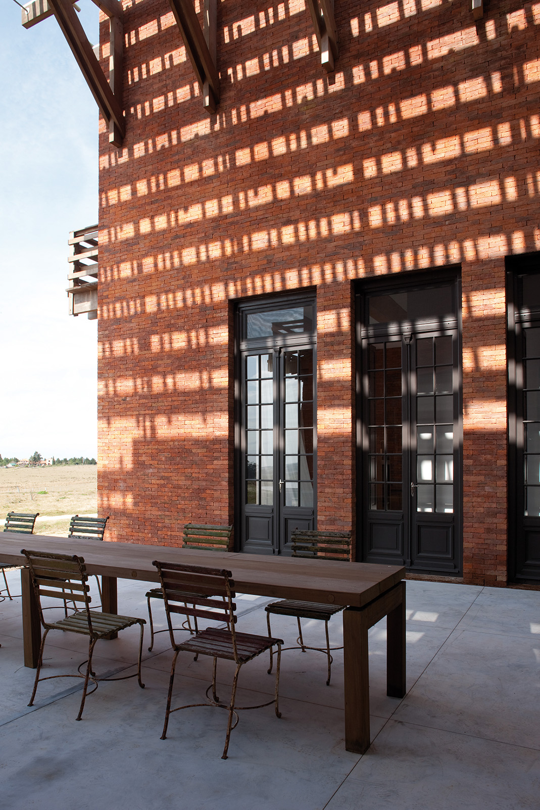 Cruzando el living, un segundo eje atraviesa los dos bloques distribuyendo la circulación hacia los demás espacios que completan el programa de planta baja: cuarto de huéspedes, oficina, un gran comedor con capacidad para 20 comensales y la generosa cocina que le sirve. Este segundo eje se extiende más allá de la casa para conducir a la piscina y la terraza.
