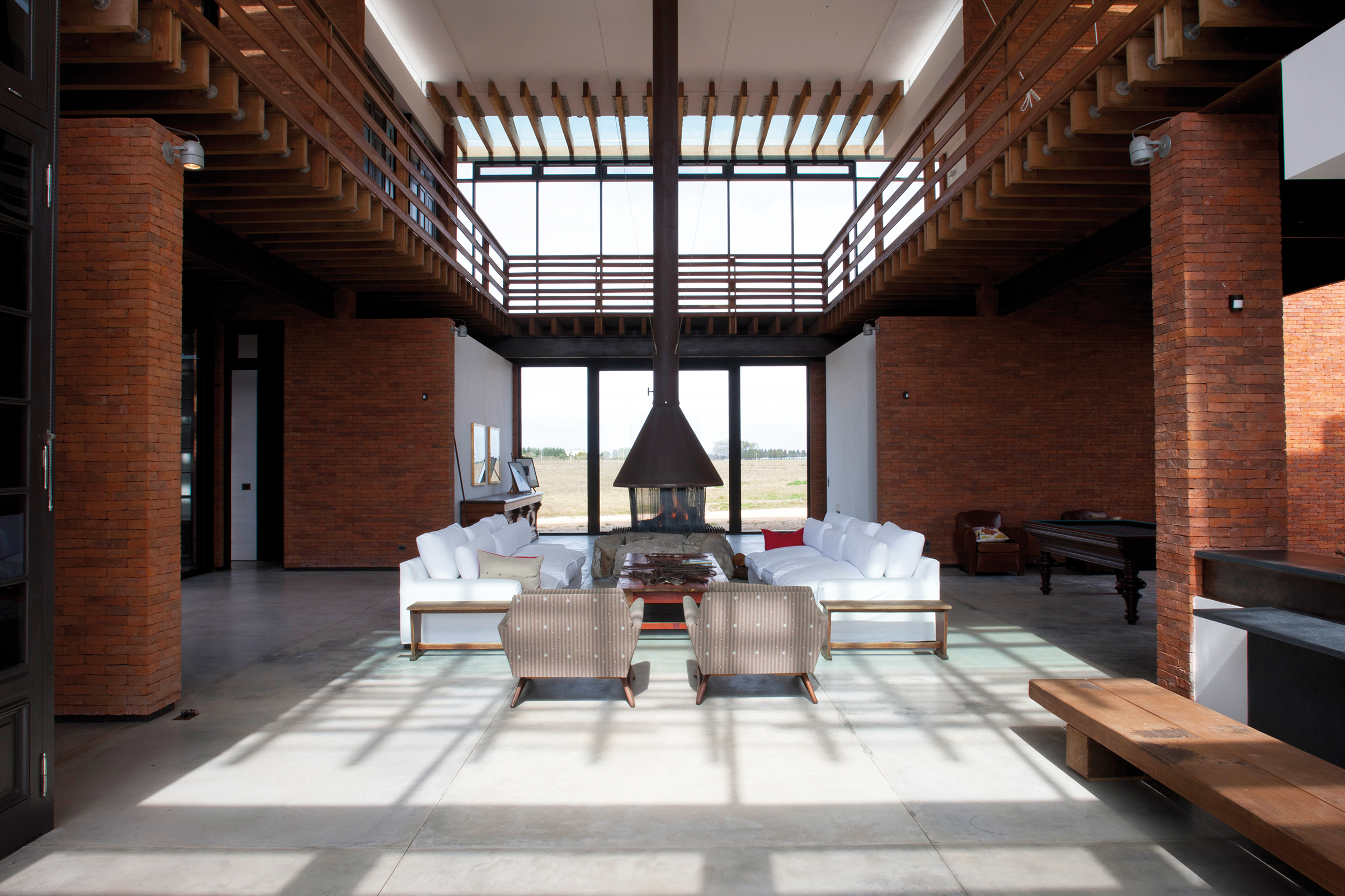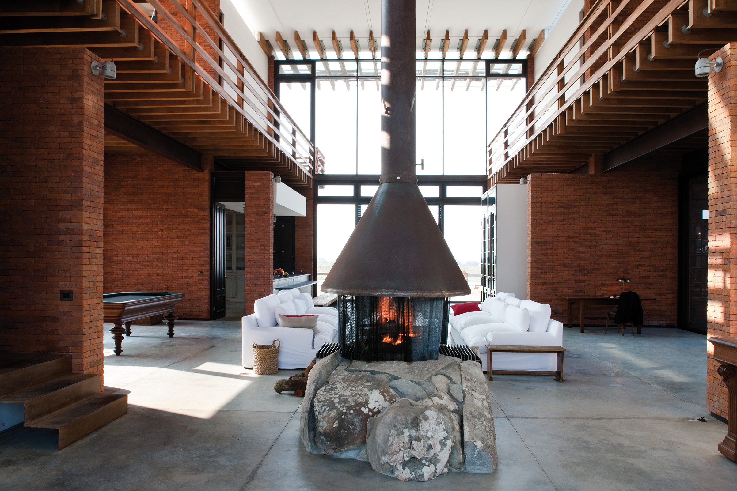 Una vez dentro de la edificación, el esquema inicial de H se descompone en dos prismas alineados al eje longitudinal de la planta. El área central es ocupada por el living. Con su doble altura funge como ordenador espacial de la casa. La presencia de este imponente espacio se ve reforzada por un escultórico fogón que se eleva a través de todo el interior sobrepasando la cubierta central.