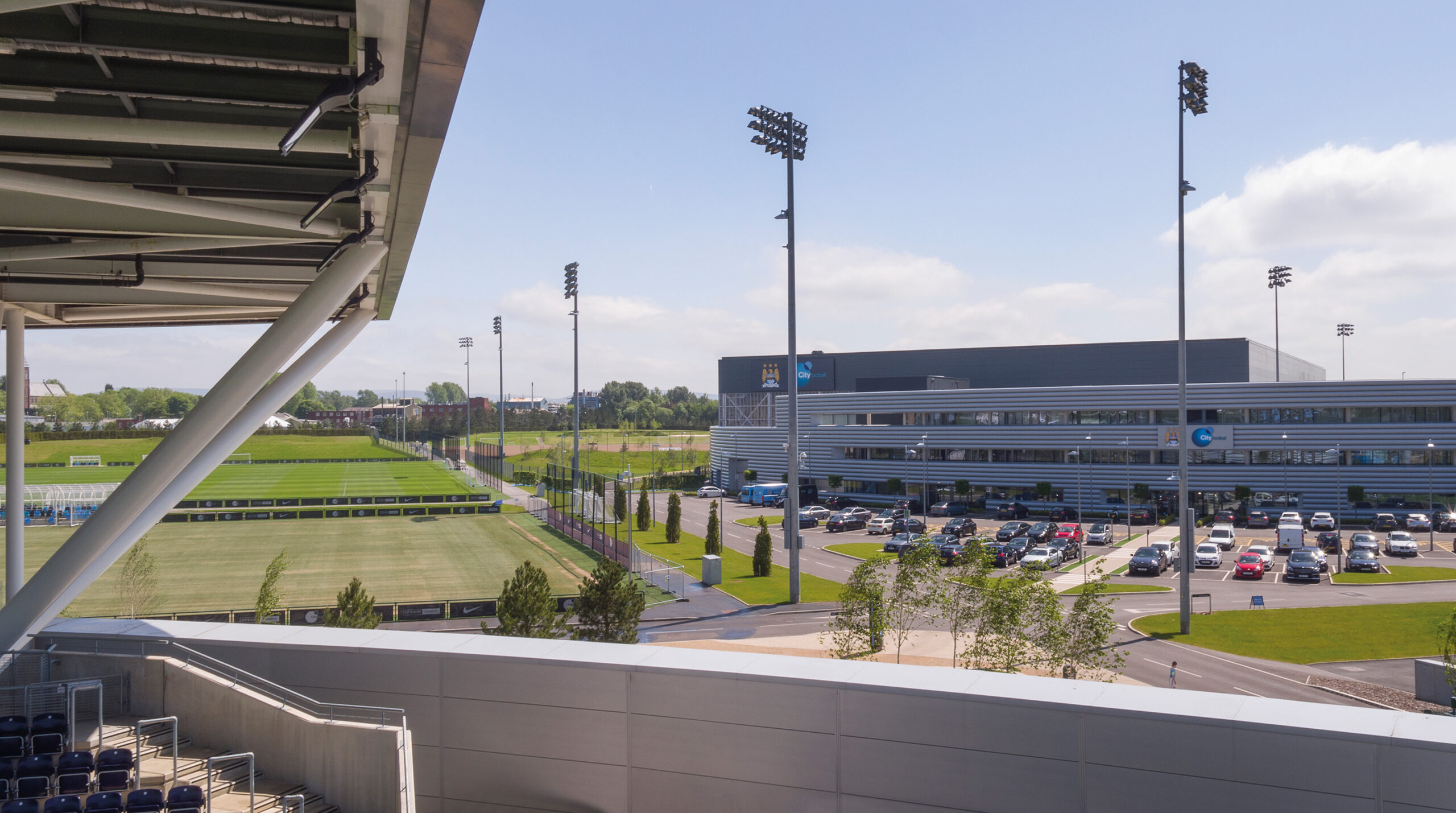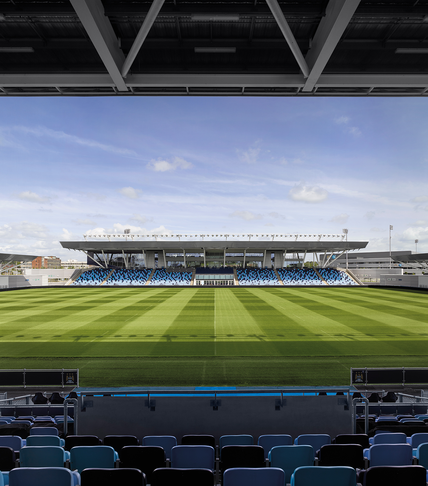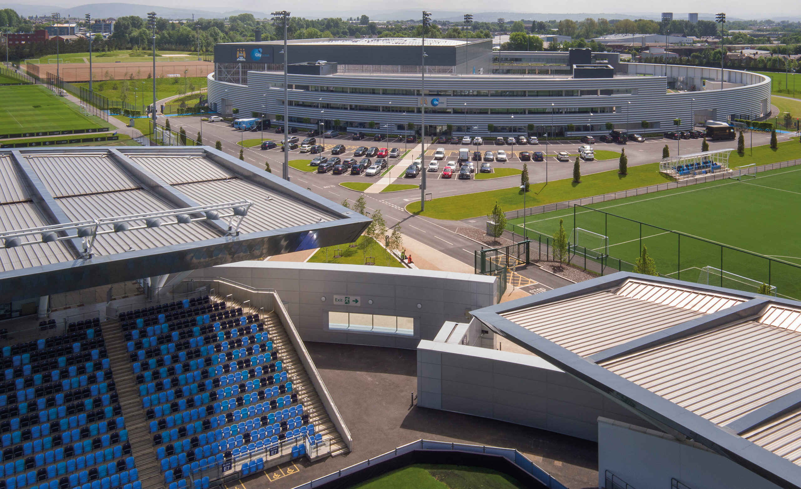 Al noroeste del edificio central se levanta un estadio con capacidad para 7.000 espectadores, acompañado por la sede global del club y su centro de medios. Estos programas se integran en una única estructura, envuelta por una piel metálica corrugada que refuerza su unidad formal. El edificio de la sede, predominantemente transparente, no es un gesto casual: expresa la voluntad del club de mostrarse abierto, accesible, parte activa de la comunidad de Manchester.