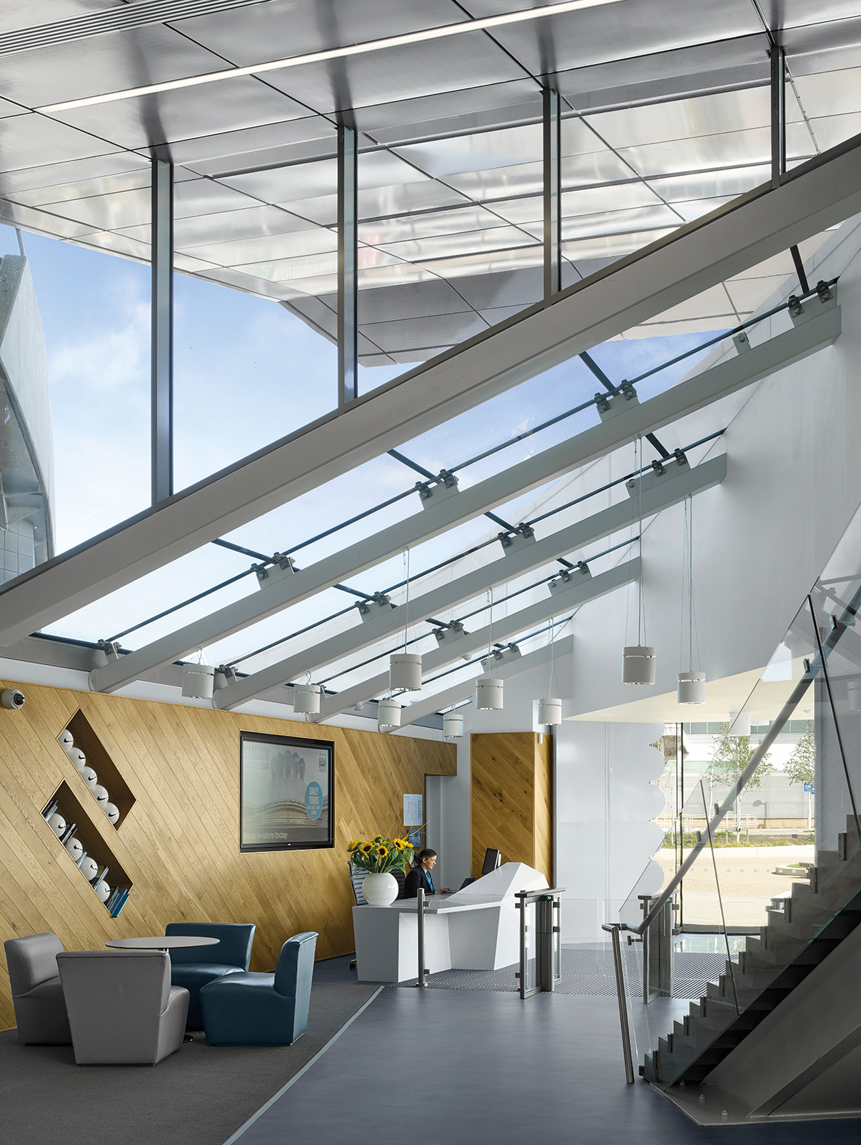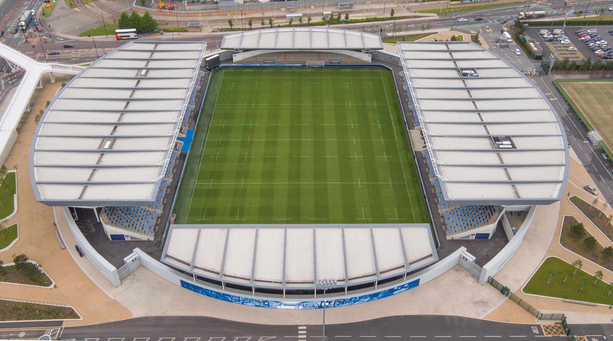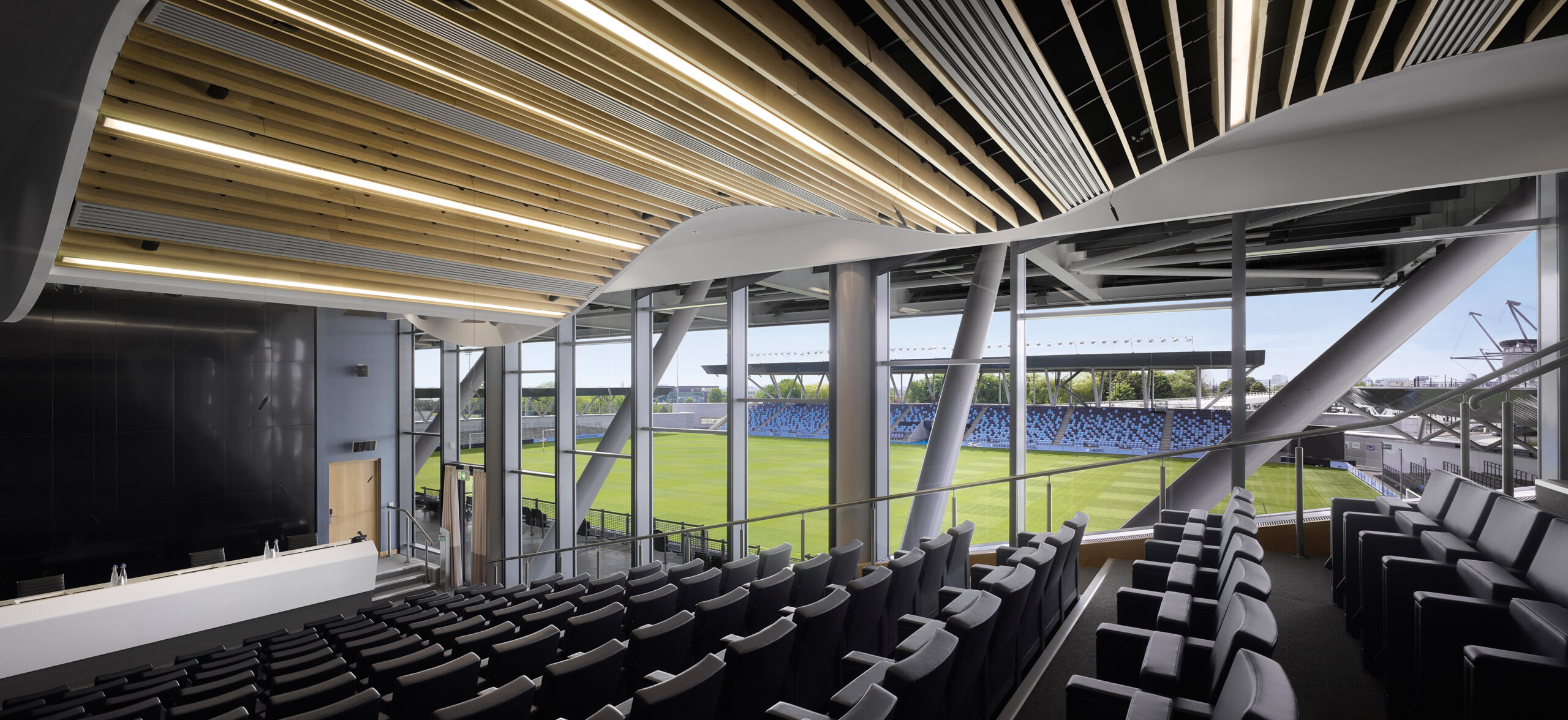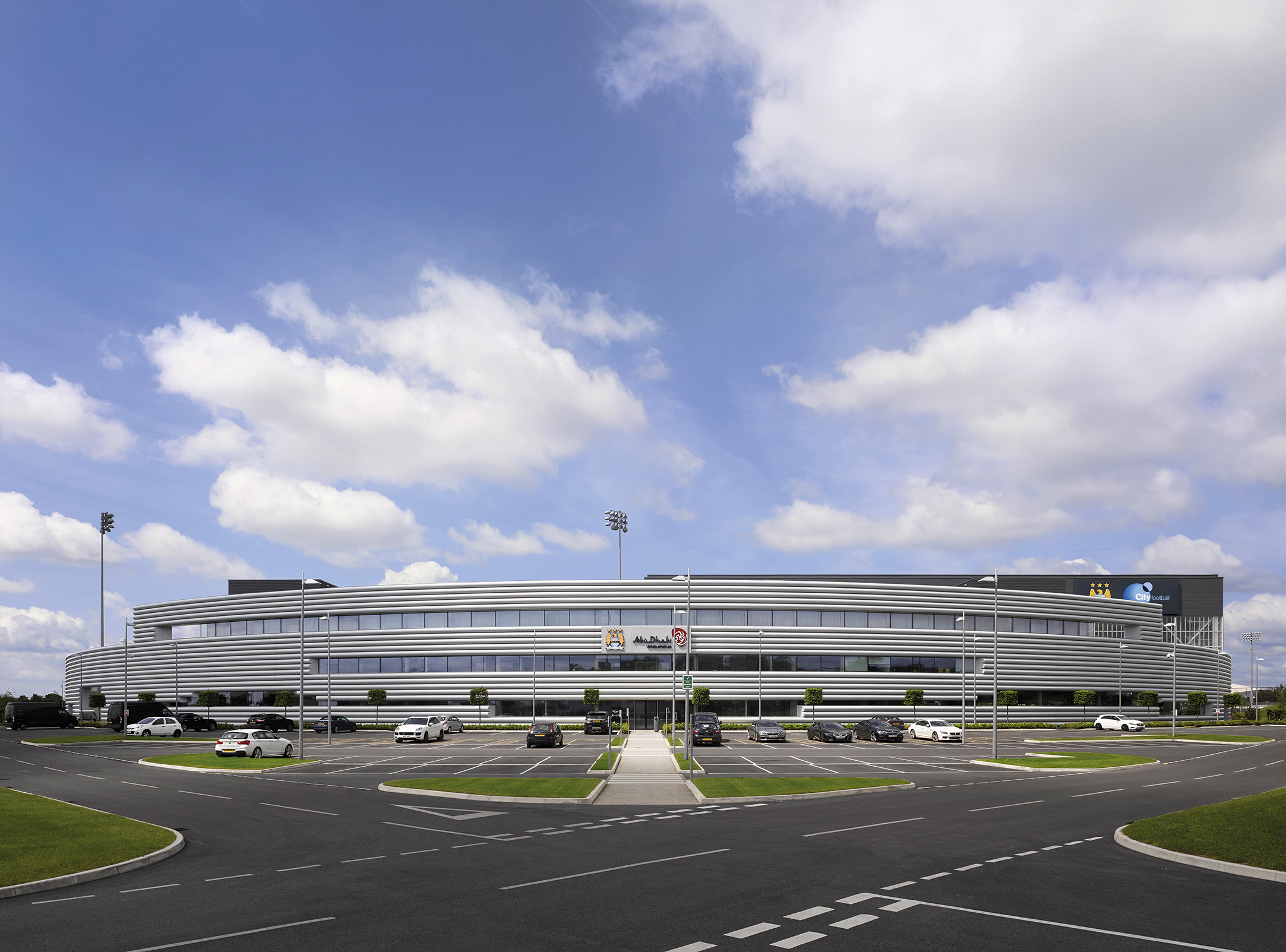Al noroeste del edificio central se levanta un estadio con capacidad para 7.000 espectadores, acompañado por la sede global del club y su centro de medios. Estos programas se integran en una única estructura, envuelta por una piel metálica corrugada que refuerza su unidad formal. El edificio de la sede, predominantemente transparente, no es un gesto casual: expresa la voluntad del club de mostrarse abierto, accesible, parte activa de la comunidad de Manchester.