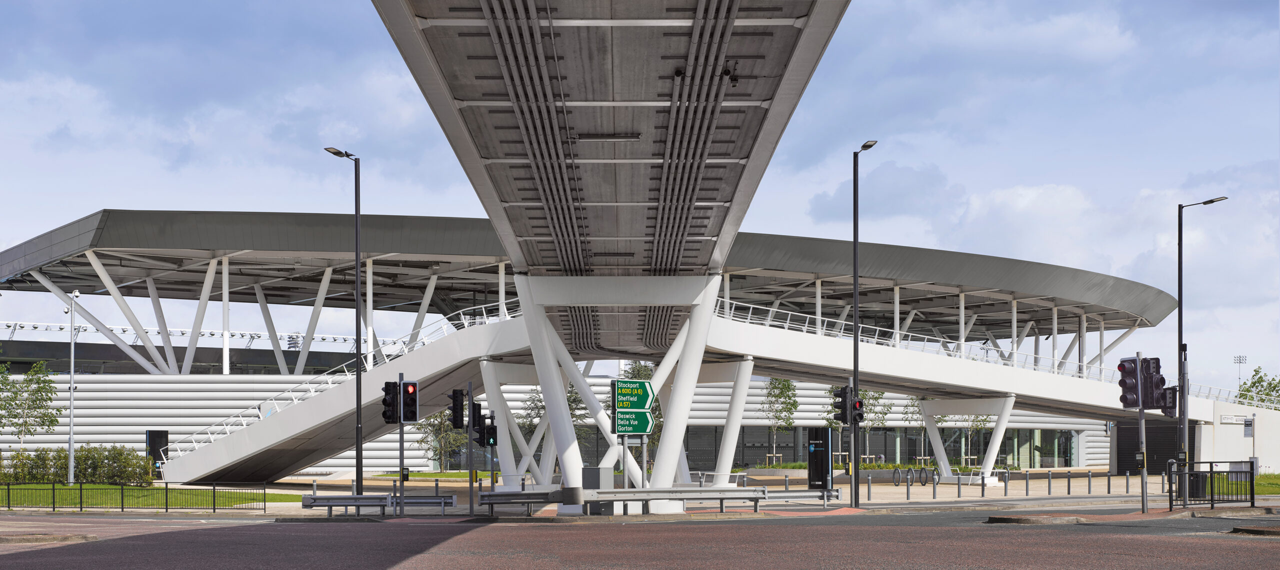 El proyecto establece además un vínculo físico y simbólico con el Etihad Stadium. Un puente de diseño inconfundible, con su arco de cruce característico y un tablero suspendido de acero compuesto, permite el desplazamiento de miles de aficionados antes y después de los partidos. Más que una conexión funcional, el puente actúa como un pasaje ritual, una transición entre la ciudad cotidiana y el territorio emocional del fútbol.