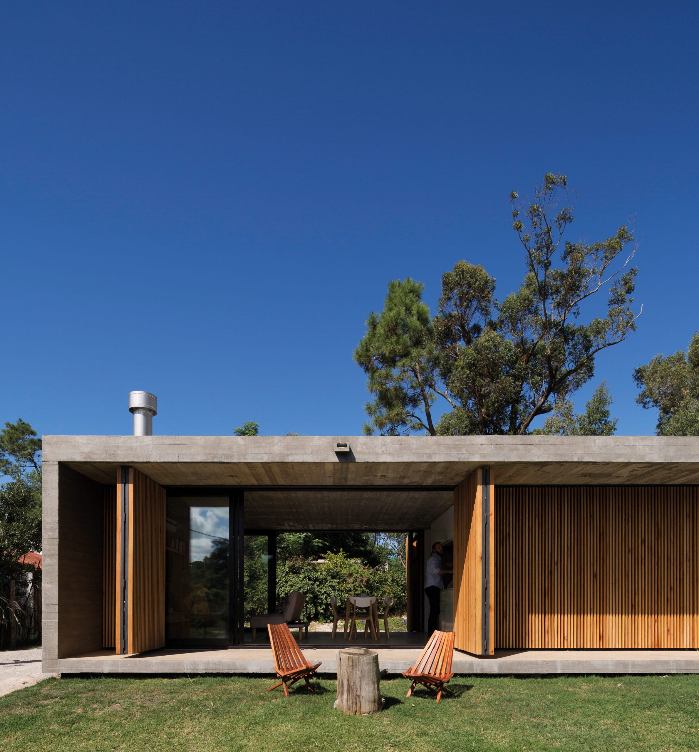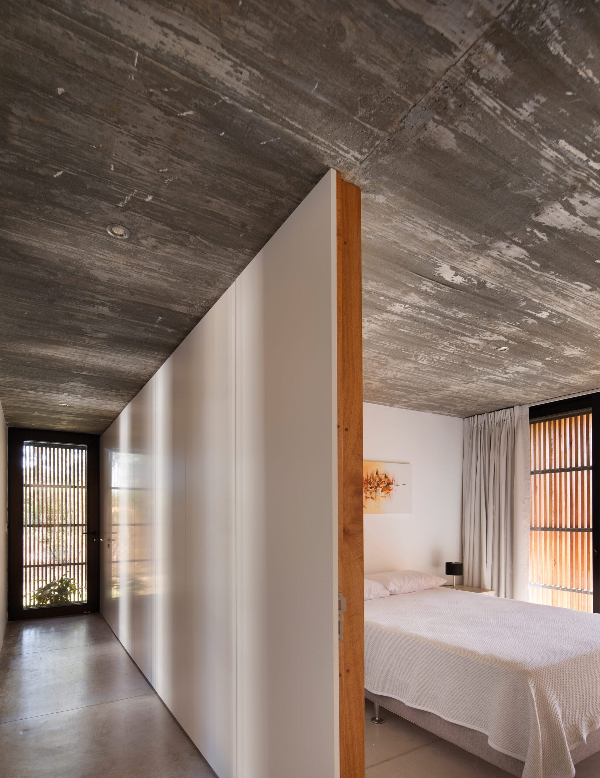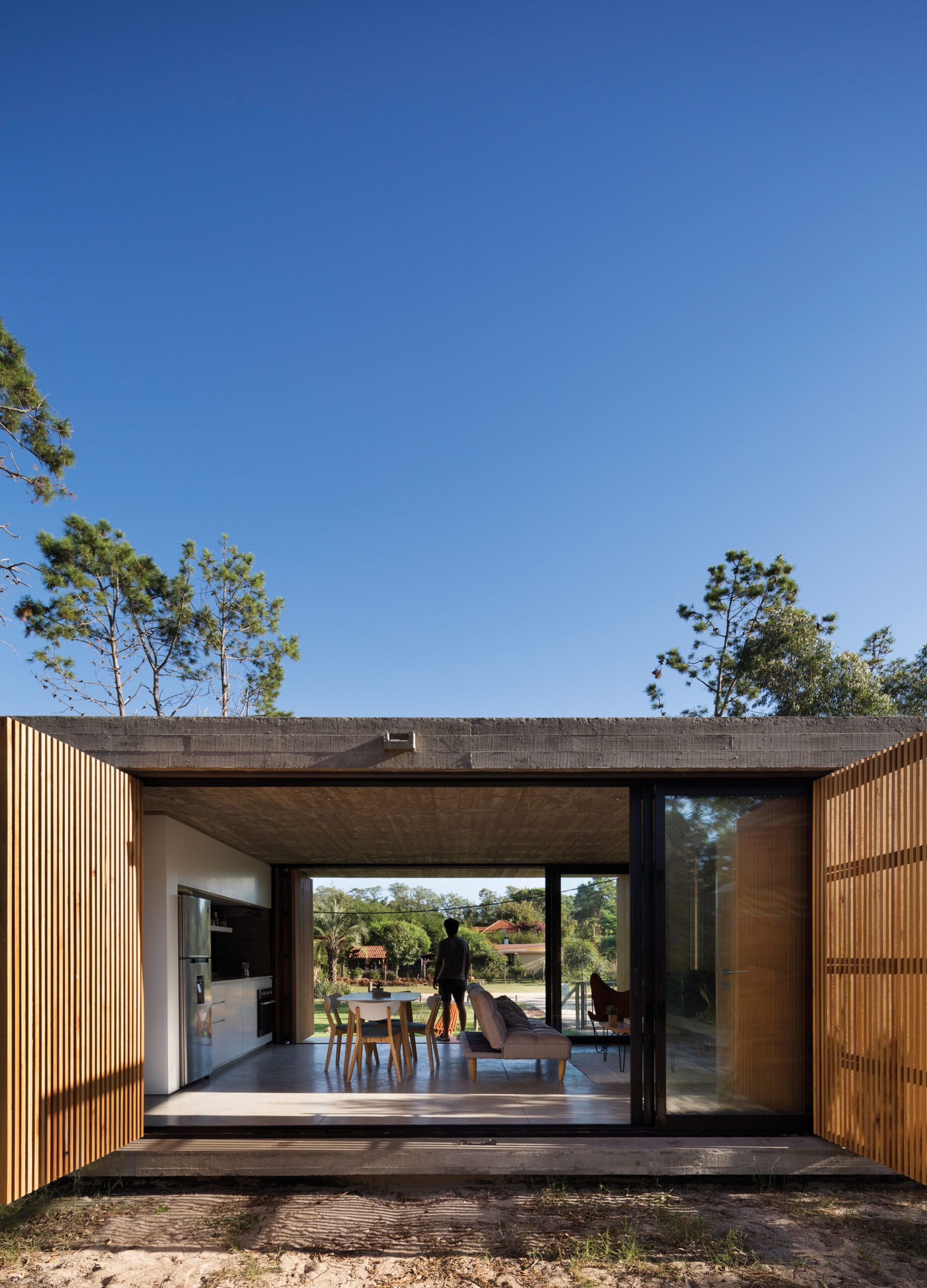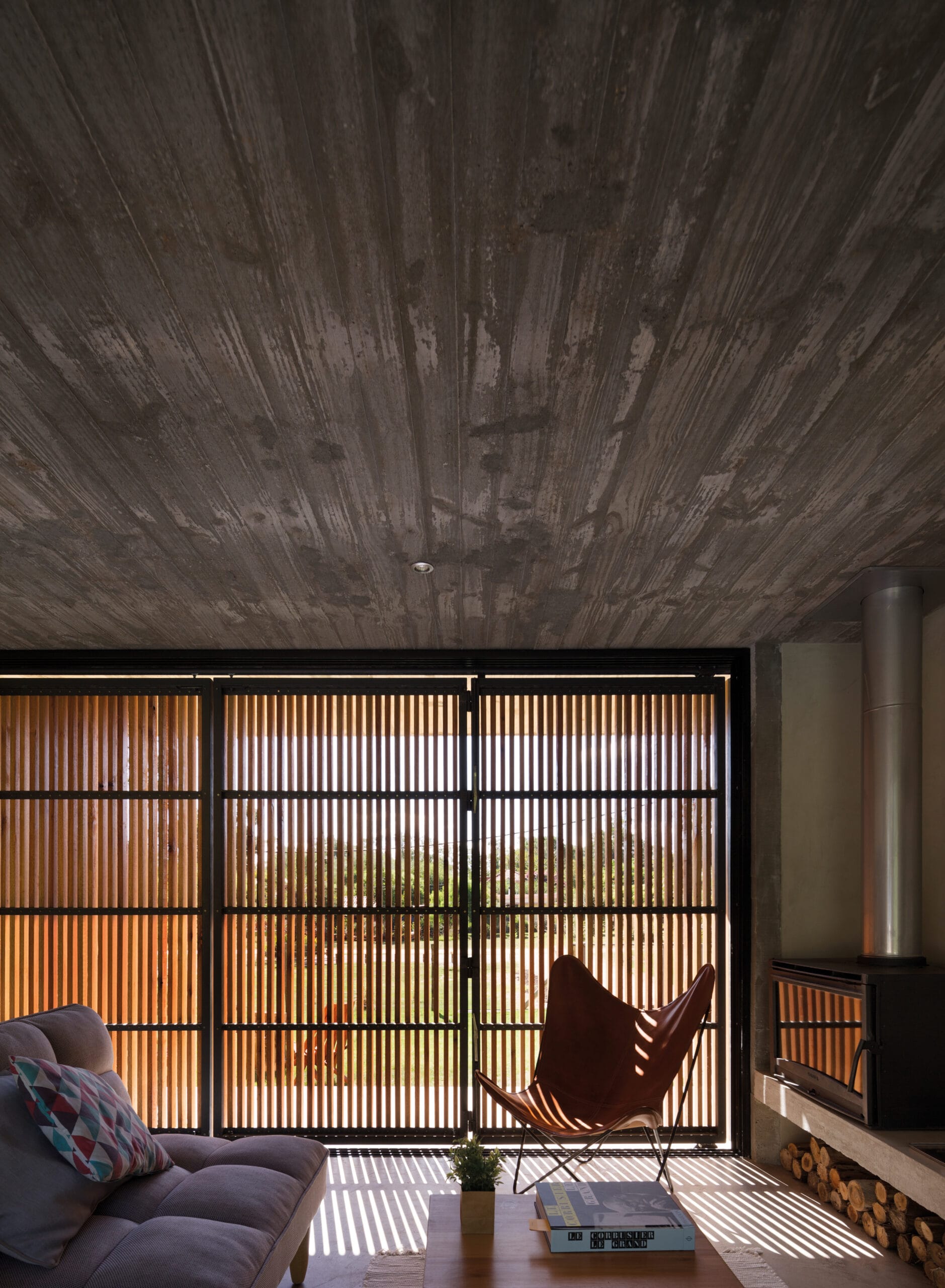 Artificial, natural. Natural y artificial son términos complementarios que se definen por contraste y se refuerzan en su presencia mutua. El paisaje natural se ve potenciado con la geometría de la construcción, y la casa, parece mas habitable y protectora en presencia de un paisaje natural más salvaje y virgen. La envolvente se plantea como un filtro que difumina los bordes, un velo, capaz de ser abierto de par en par, dejando entrar a la naturaleza a la domesticidad del hogar.