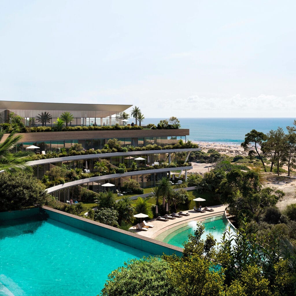 Médano El Pinar, el último proyecto diseñado por el renombrado arquitecto Rafael Viñoly, es un desarrollo residencial multifamiliar de lujo, innovador, ultra sustentable que está ubicado a solo quince minutos de Montevideo, que ocupa el único terreno de la Ciudad de la Costa que no está separado de la playa por una carretera. La ubicación única frente al mar se encuentra justo detrás de las dunas en el borde de un vecindario residencial de poca altura. La forma larga, baja y vigorosa del edificio lo integra con el paisaje de su entorno prístino para minimizar su impacto visual en el vecindario y hacerlo completamente invisible desde la playa pública. Aproximadamente ciento veinte unidades frente a la playa con tipologías que parten de un dormitorio y llegan hasta los cinco dormitorios están dispuestas a lo largo de los 425 metros de longitud del edificio en una configuración de terrazas que ofrece a casi todos los apartamentos jardines abiertos al cielo de generosas proporciones con vistas a la playa hacia el sur o hacia una gran laguna hacia el norte. Todas las unidades orientadas al sur cuentan con áreas de estacionamiento privadas adyacentes o garajes contiguos cerrados, y todas las unidades orientadas al norte disfrutan de estacionamiento cubierto a no más de treinta metros de sus puertas principales.
