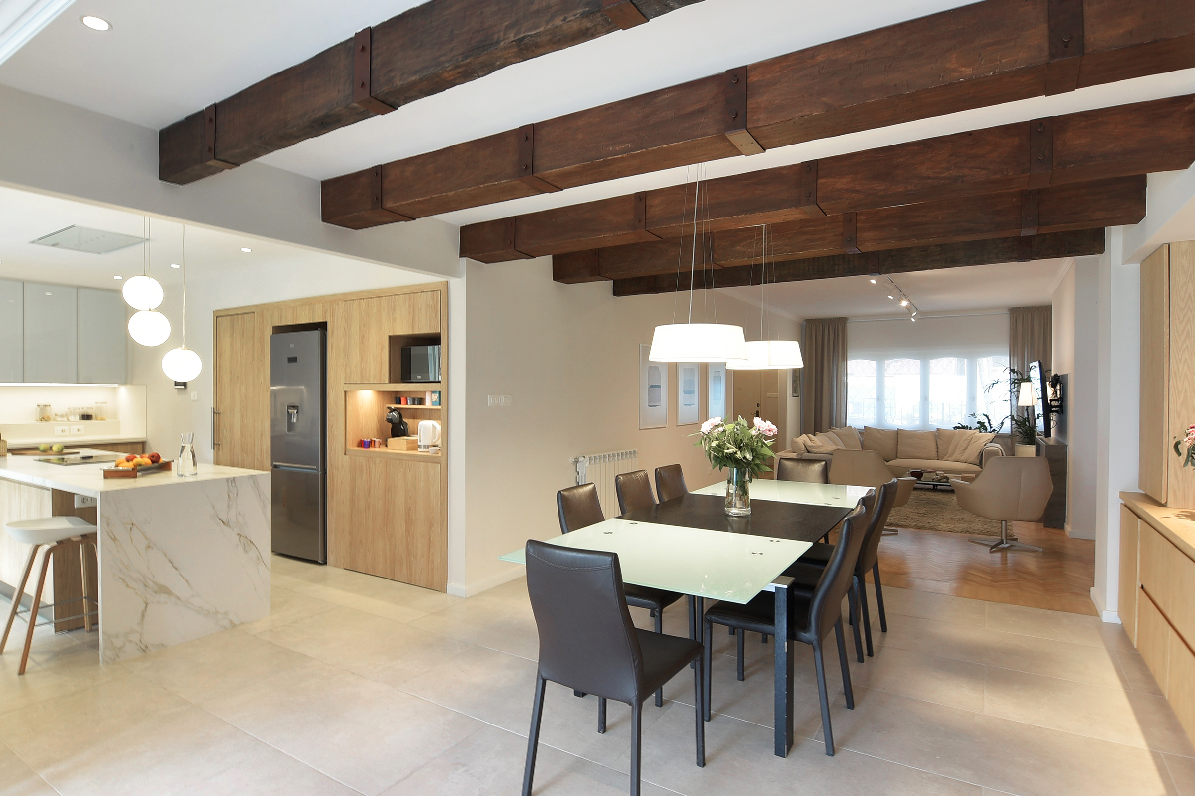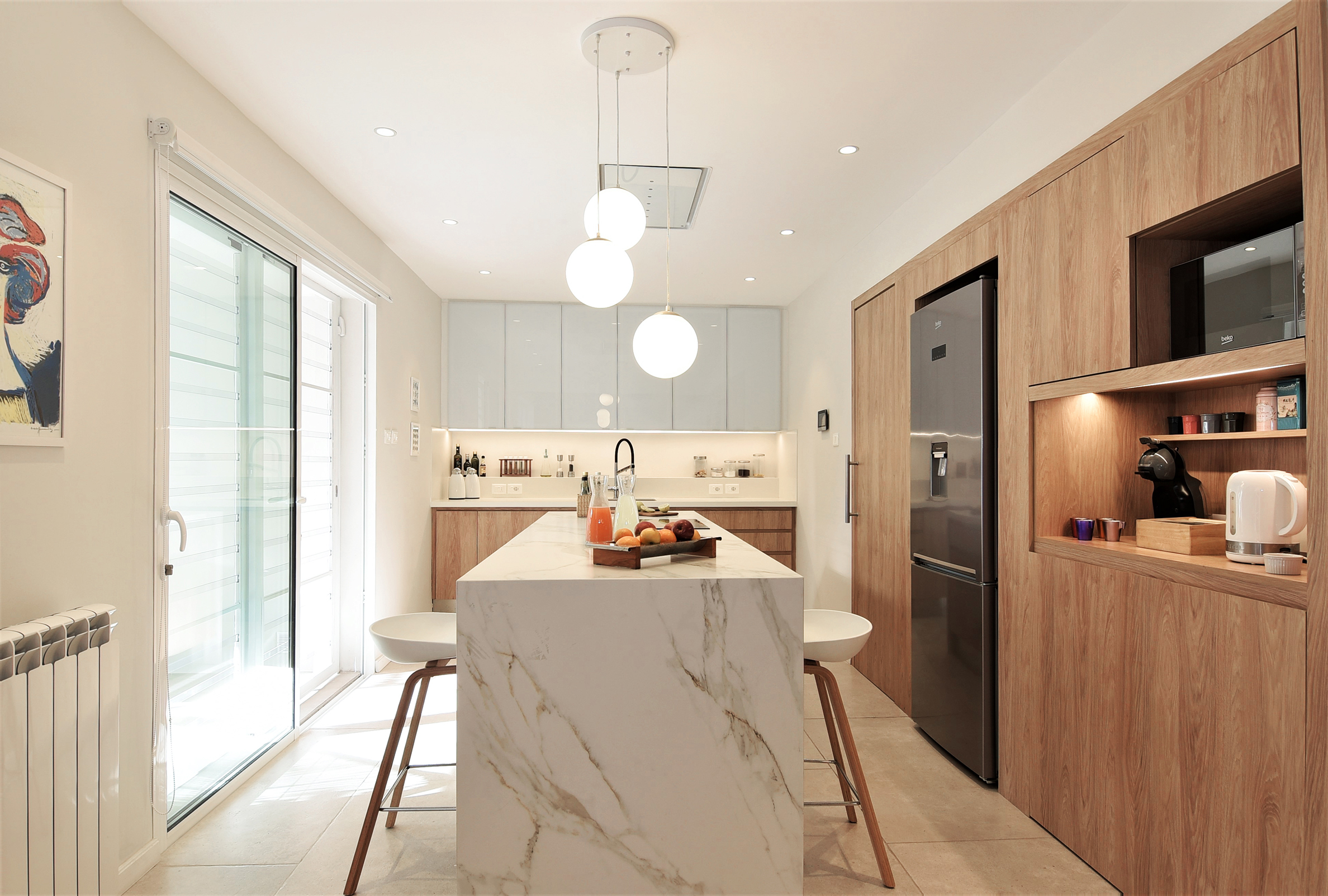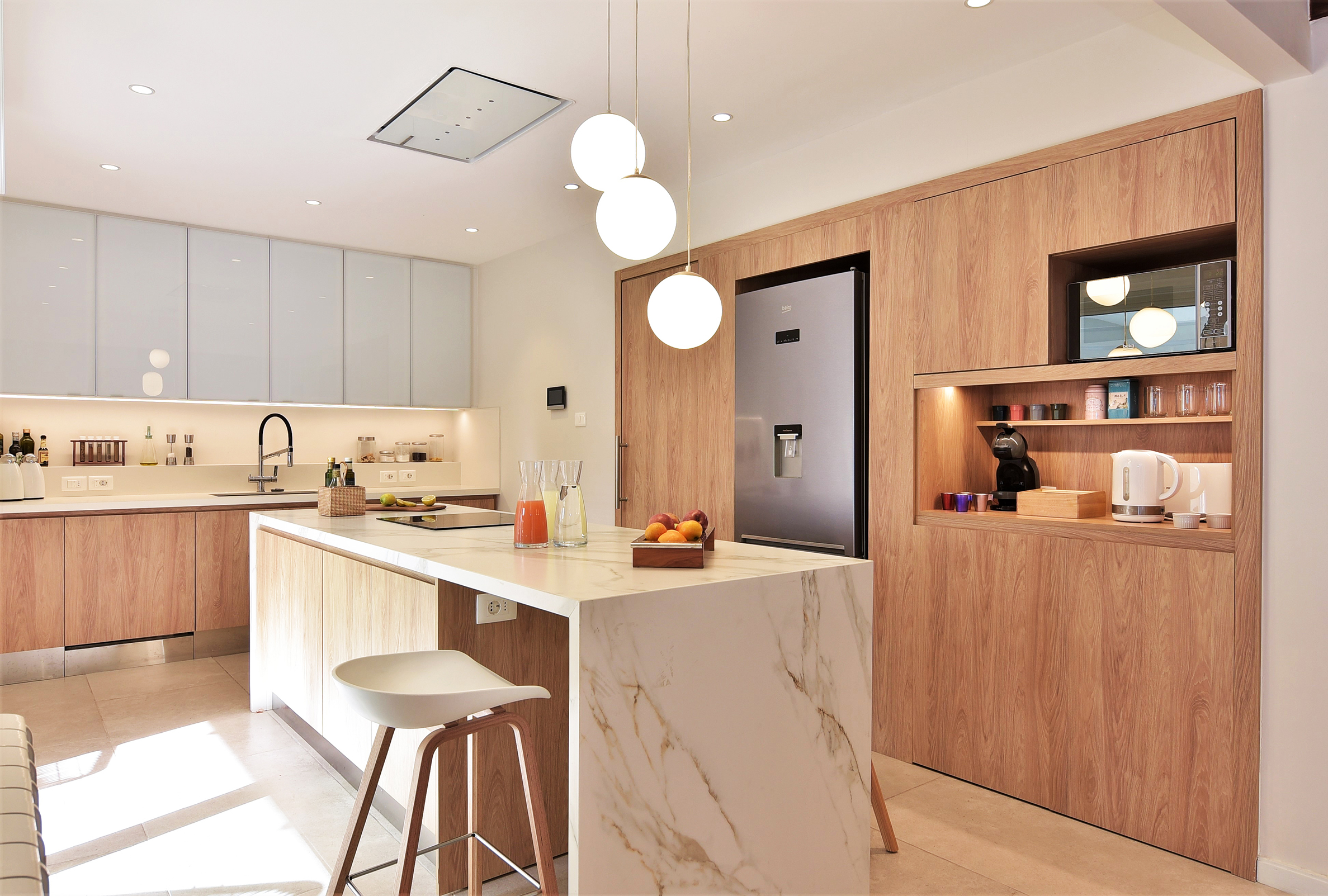 Una casa de los años cuarenta, en Pocitos, compartimentada como si cada habitación fuera un secreto, se abre de pronto como una flor madura. Los muros caen y la cocina, antaño confinada a las sombras del servicio, reclama su lugar como corazón palpitante del hogar. Fotografías después de la obra de José Pampín.