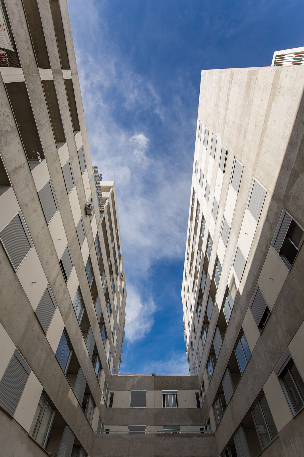 El proyecto desarrolla un esquema de implantación en forma de E que se abre hacia el amplio corazón de manzana. Volumétricamente, la propuesta consiste de un conjunto arquitectónico compuesto de tres piezas verticales sobrepuestas a una cuarta pieza horizontal que funge de podio. En total, el complejo desarrolla 19.200 metros cuadrados de construcción, en los que da lugar a 231 unidades de viviendas, salones de uso común, espacios exteriores y locales comerciales.