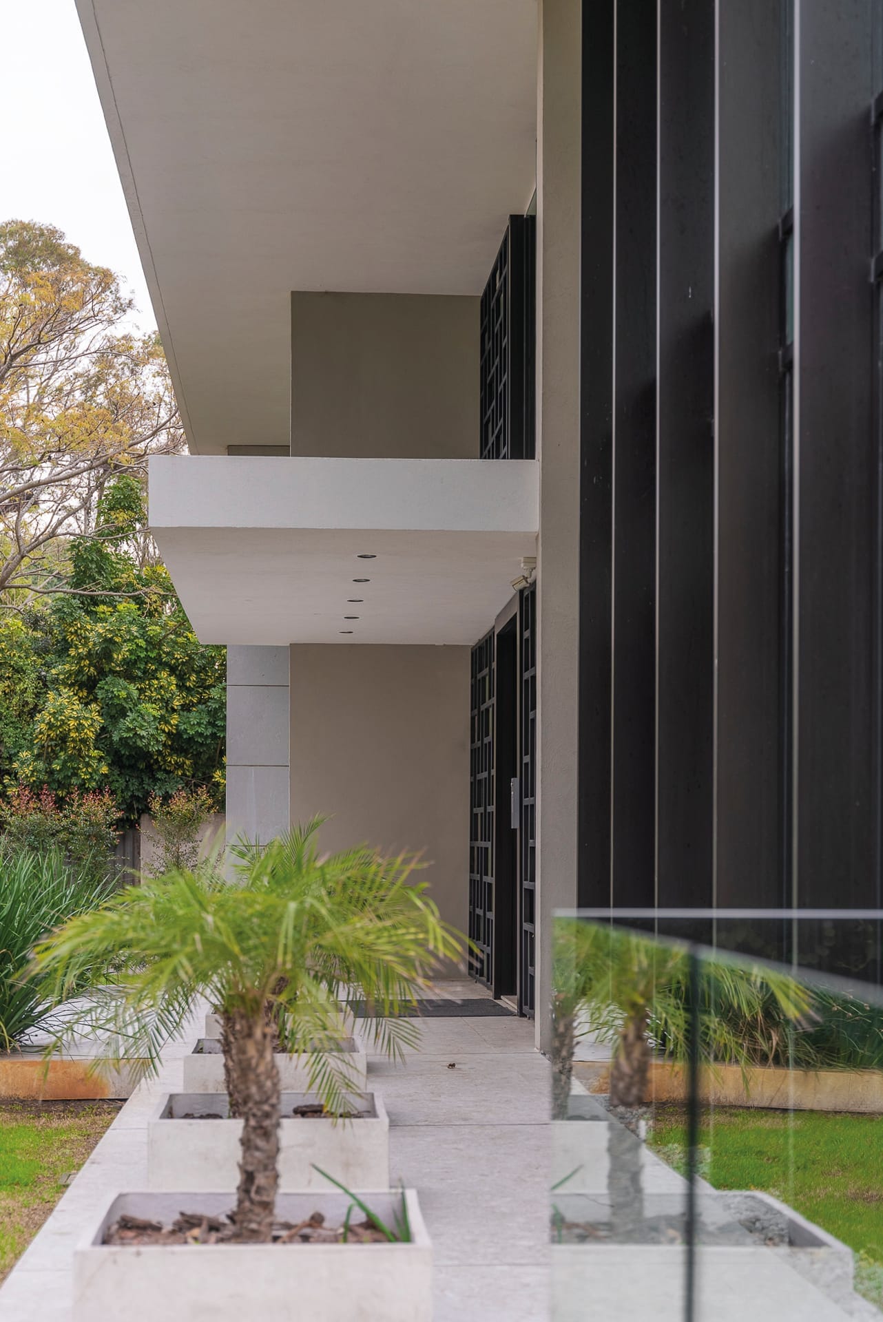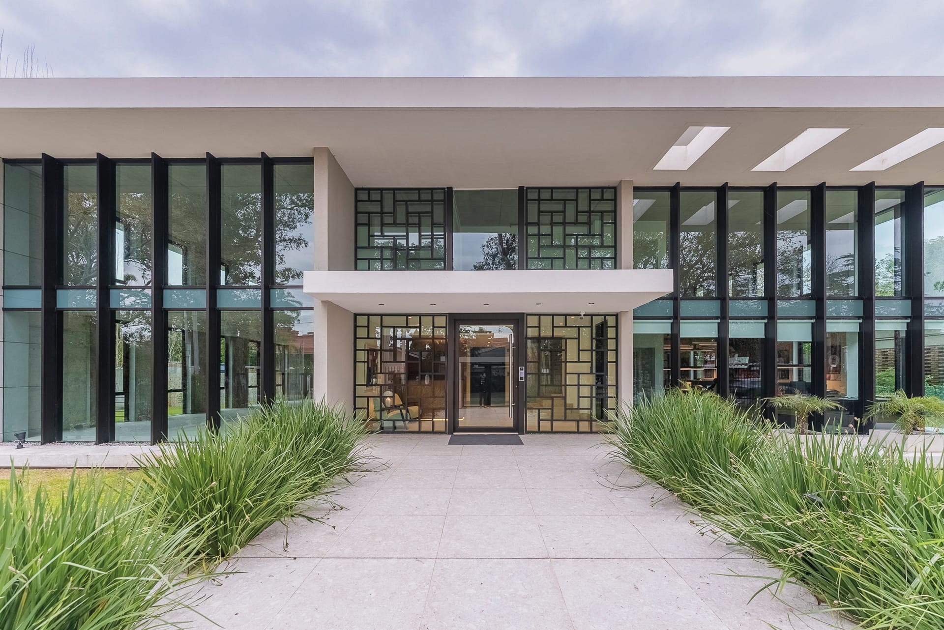 inmediato, logrando escalonar el cuerpo principal configurando altura de dos niveles y escalonando el volumen de coronamiento. Este concepto logra minimizar el impacto de la construcción sobre las visuales desde y hacia las áreas verdes. Las transparencias de las áreas comunes hacia el exterior se muestran tamizadas empleando una malla metálica de patrón geométrico que brinda homenaje a la construcción que existía en