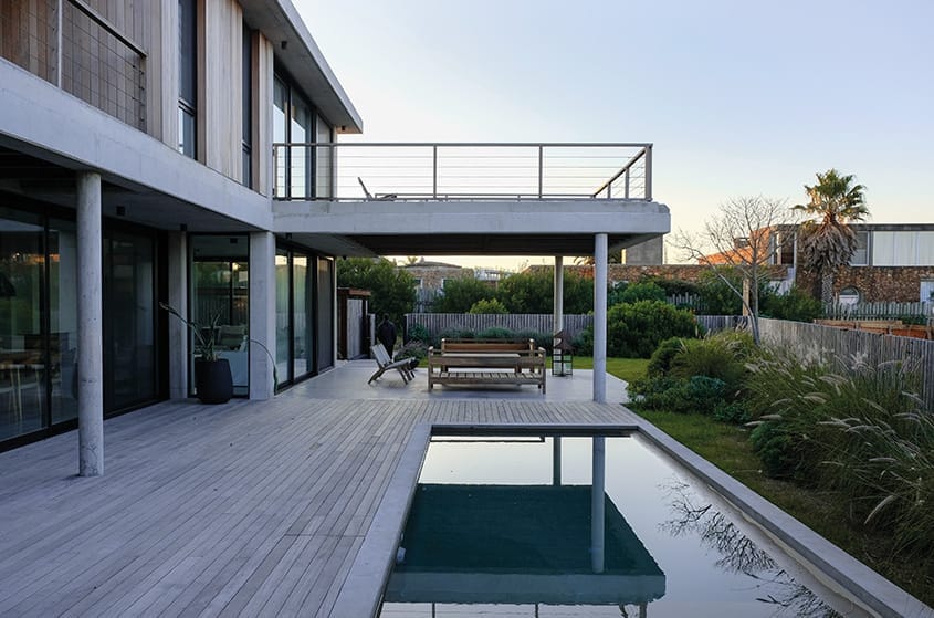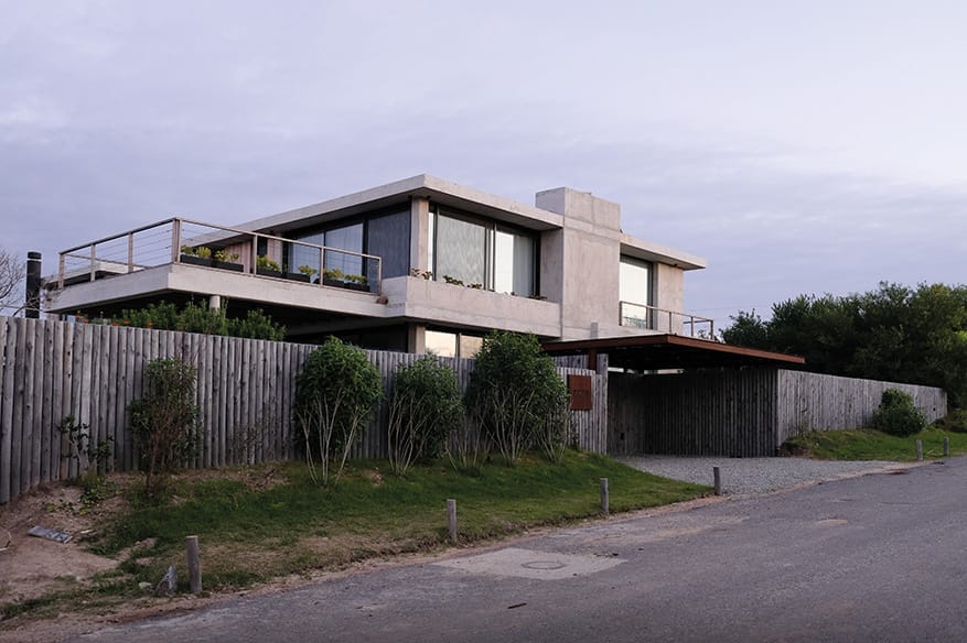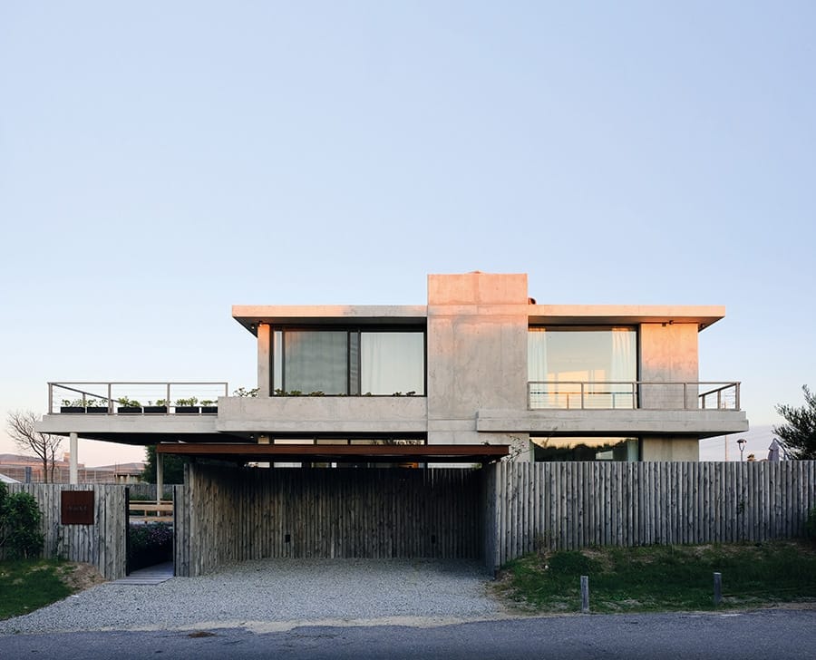 La construcción destaca por su esqueleto de hormigón armado, con pilares y losas sin vigas, y muros exteriores dobles de mampostería. La terminación exterior en madera y la tabiquería interior de mampostería complementan el robusto diseño. Las terminaciones exteriores enfatizan el hormigón visto, haciendo que la estructura misma sea la imagen de la casa, mientras que los cerramientos verticales combinan paneles de madera y vidrio, fusionando modernidad y calidez.