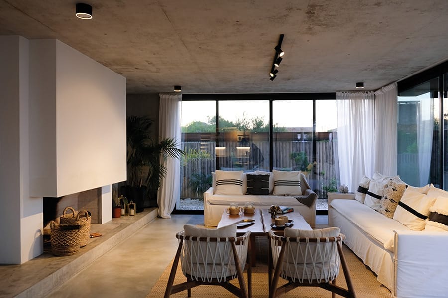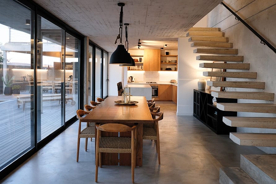 Las dos viviendas de verano se despliegan en dos plantas, articuladas y servidas por un eje longitudinal definido que unifica y potencia su diseño. Cada casa ofrece en planta baja un acogedor living con estufa a leña, un espacio central abierto que integra cocina y comedor, toilette y una suite para huéspedes. En la planta alta, se encuentra una master suite con vestidor, un playroom y una suite para niños.