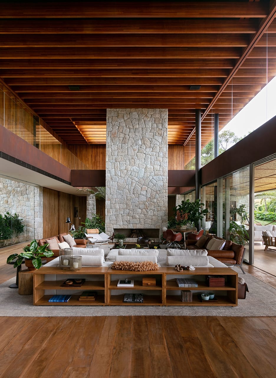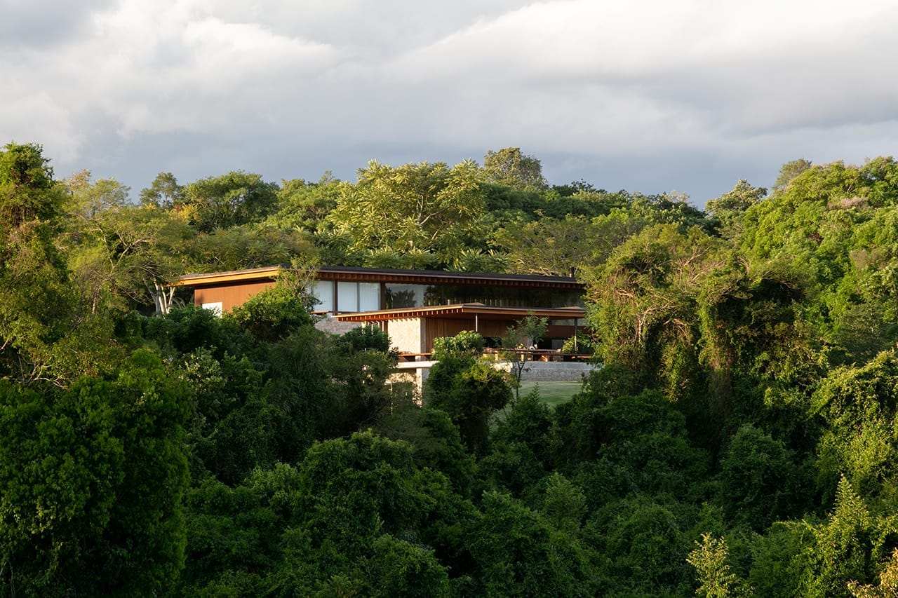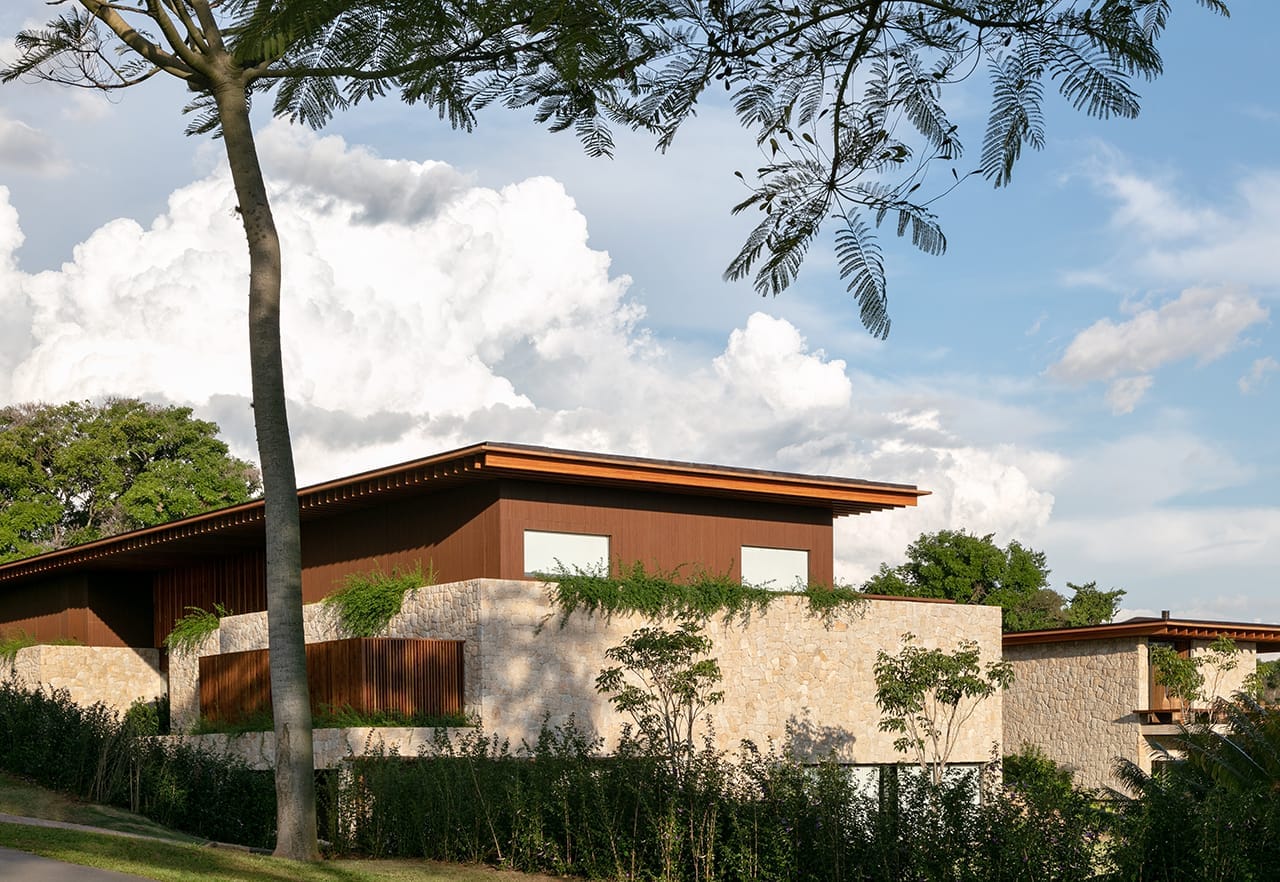 Esta casa supuso todo un reto para el estudio dado que las inquietudes de los habitantes no lograron -en primera instancia- ser contempladas por la superficie del terreno. Tanto así que el estudio optó por generar una casa de dos plantas y subsuelo. El edificio se implanta en un terreno con la pronunciada profundidad que propone la geografía del barrio, lejos de corregir la situación, se optó por aprovechar el desnivel y así generar un subsuelo. La casa se presenta con dos grandes volúmenes revestidos en piedra en planta baja y madera en planta alta. Estos dos bloques se unen entre sí por medio de una gran baranda de veinticinco metros de acero corten que integra de forma orgánica al conjunto a través de los ambientes sociales en planta principal y los vincula con el exterior donde se encuentra la gran piscina.