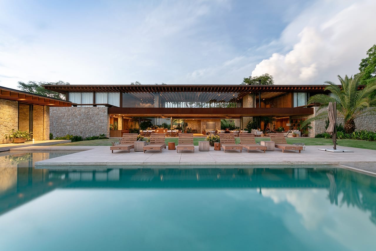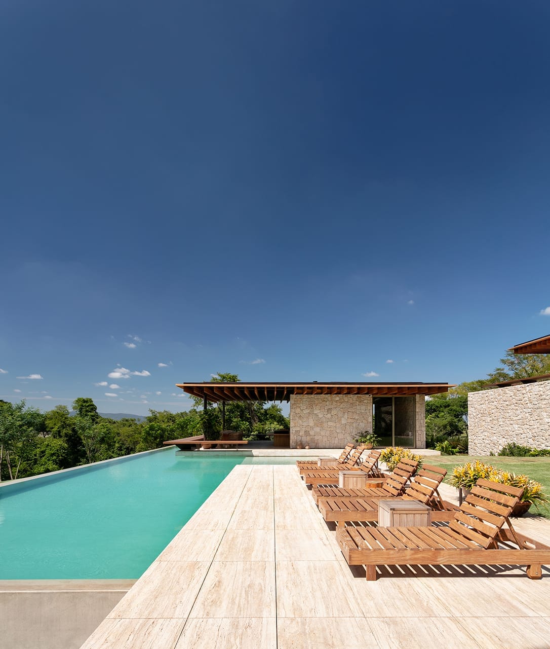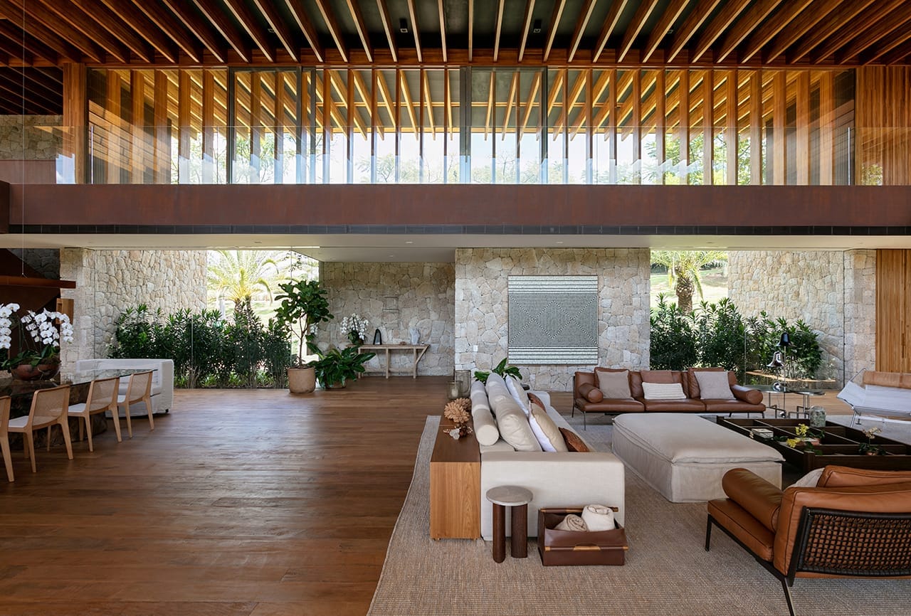 Esta casa supuso todo un reto para el estudio dado que las inquietudes de los habitantes no lograron -en primera instancia- ser contempladas por la superficie del terreno. Tanto así que el estudio optó por generar una casa de dos plantas y subsuelo. El edificio se implanta en un terreno con la pronunciada profundidad que propone la geografía del barrio, lejos de corregir la situación, se optó por aprovechar el desnivel y así generar un subsuelo. La casa se presenta con dos grandes volúmenes revestidos en piedra en planta baja y madera en planta alta. Estos dos bloques se unen entre sí por medio de una gran baranda de veinticinco metros de acero corten que integra de forma orgánica al conjunto a través de los ambientes sociales en planta principal y los vincula con el exterior donde se encuentra la gran piscina.