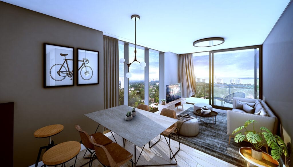 La torre corporativa, diseñada como una oficina inteligente, está pensada para impulsar las nuevas formas de trabajo. Con más de 18,000 m², ofrece una amplia gama de servicios para diversos públicos que buscan llevar a cabo distintos proyectos, brindando soporte y dinamismo a la actividad económica local. Las torres residenciales, con una superficie de 23,000 m², cuentan con 280 unidades de vivienda, distribuidas en 14 niveles por torre con 10 apartamentos por planta. Su diseño flexible ofrece diversas opciones para adaptarse a las necesidades de los usuarios, desde amplios estudios hasta unidades de uno o dos dormitorios en formato lock-off, siguiendo las nuevas tendencias de alquiler.